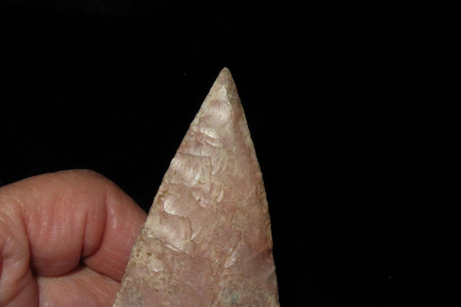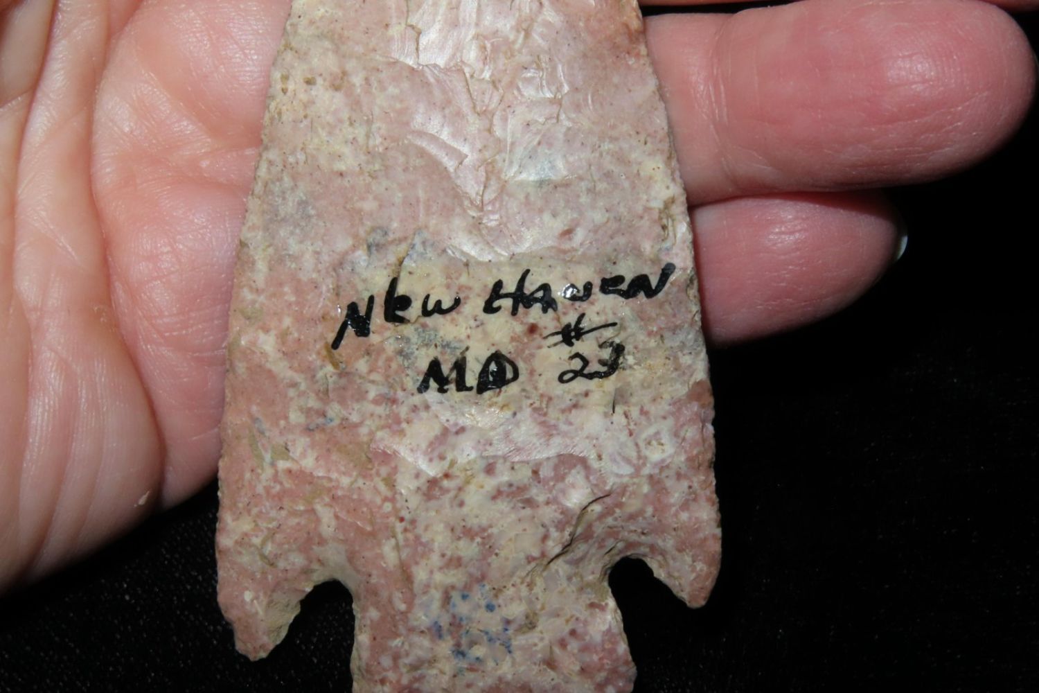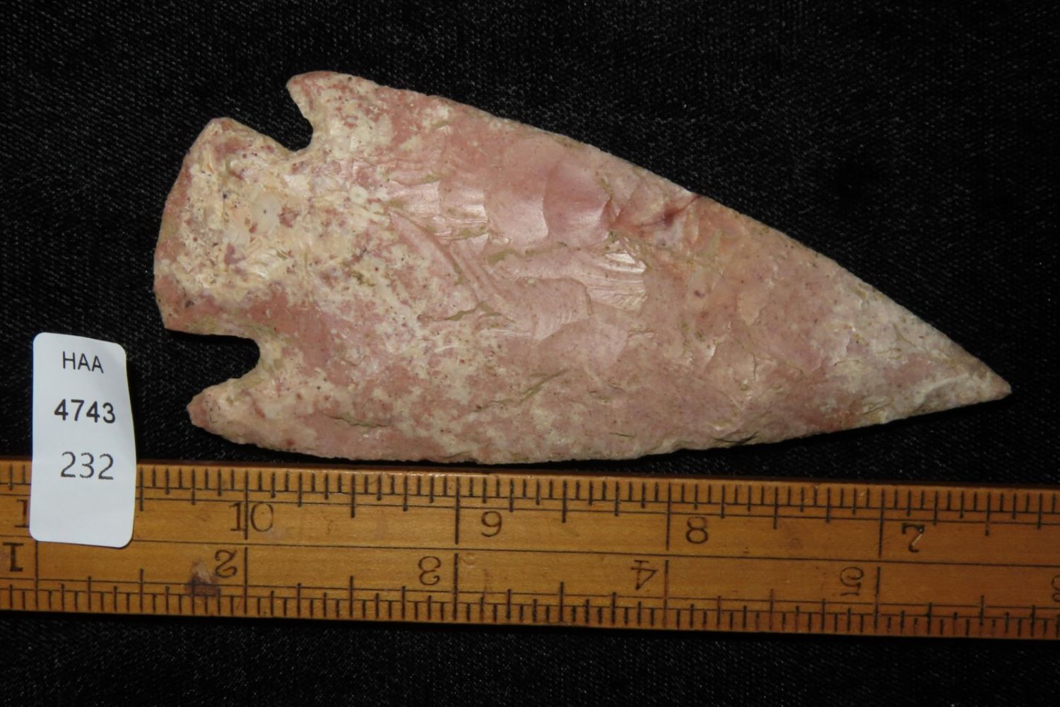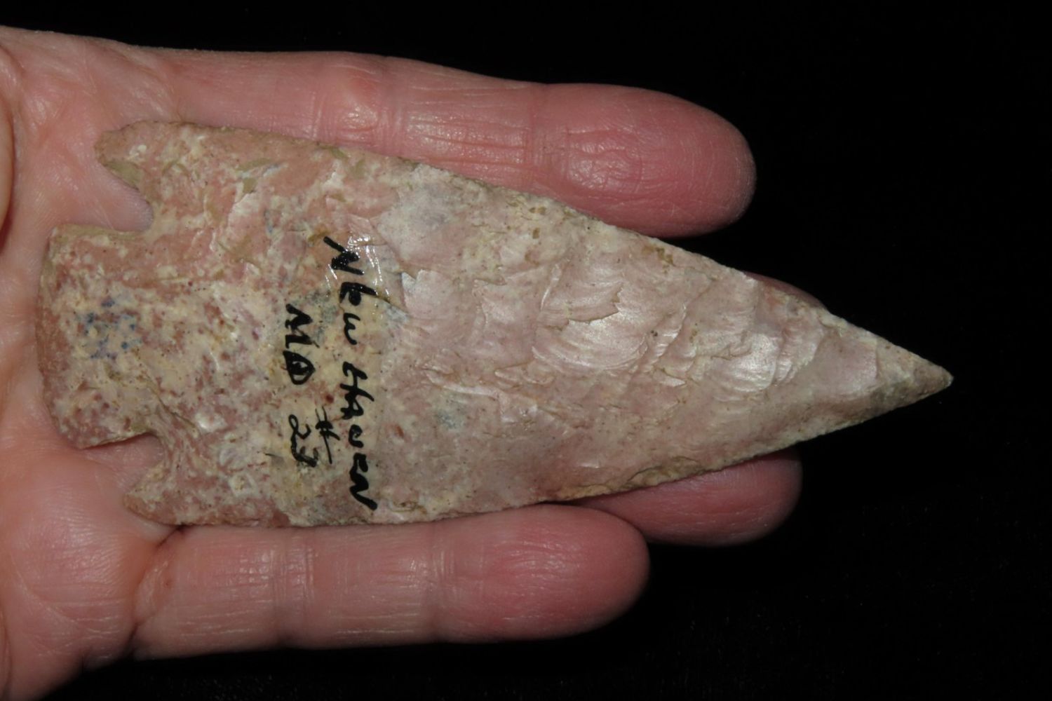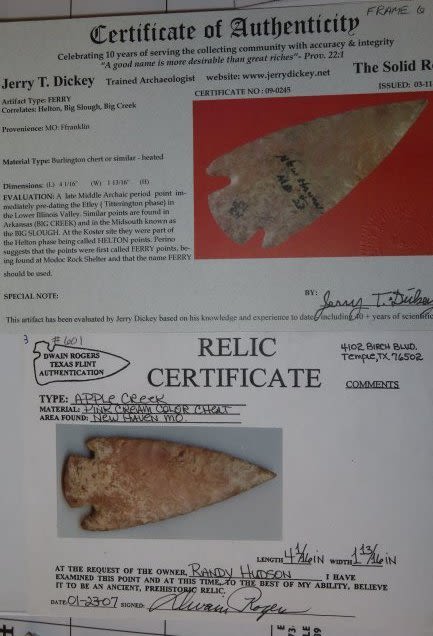4 1/16" Ferry/Apple Creek. 2x COA: Dickey and Rogers. Found in New Haven, MO. From the James and Joe George Collection. Joe George was an avid collector and finder of Native American artifacts in the greater St Louis Missouri area. Joe collected his entire life. Upon his passing he turned his collection over to his son James. James was also a very avid collector. He enjoyed walking various waterways and attending artifact shows. James is looking forward to passing down his collection to the relic community for caretaking.