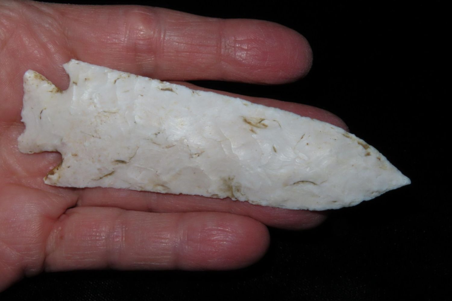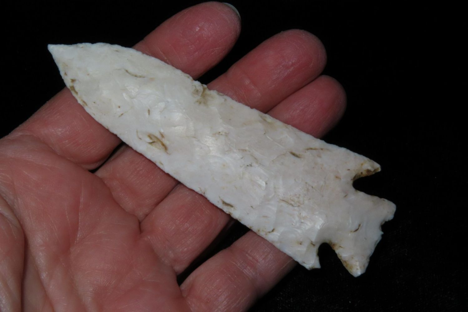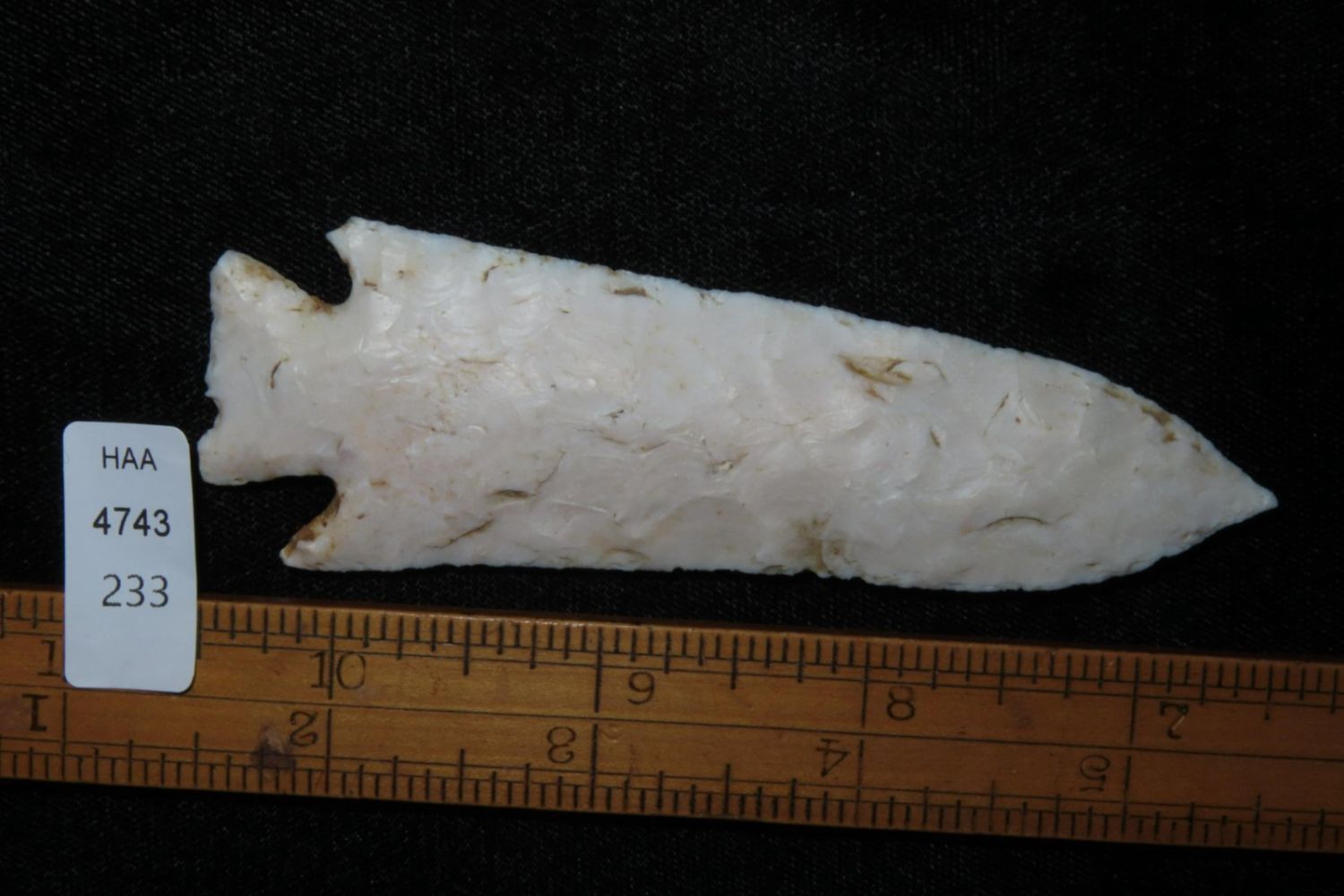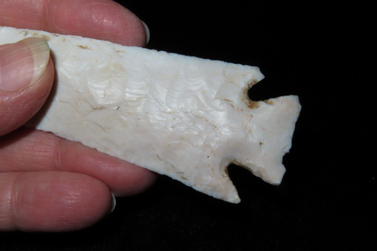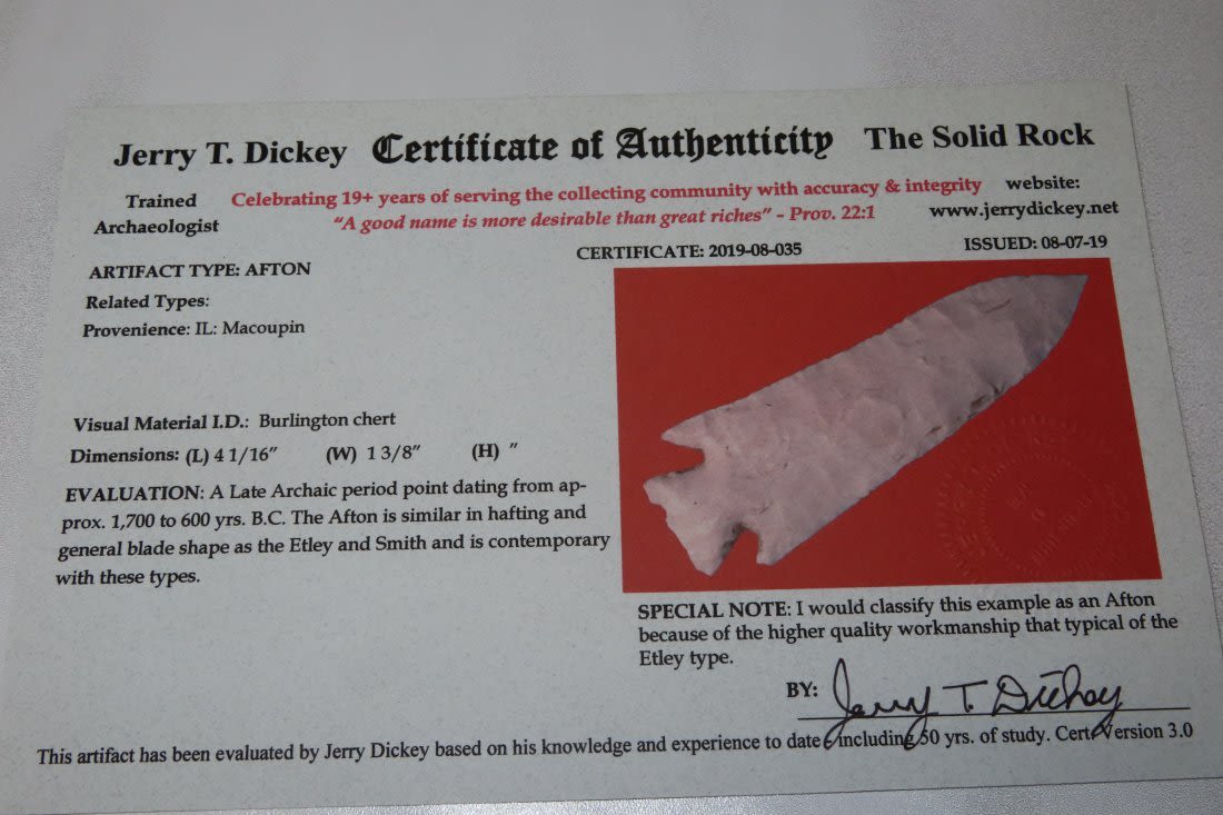 4 1/16" Afton. Dickey COA. Found in Macoupin County, IL by Kevin Calvin. From the James and Joe George Collection. Joe George was an avid collector and finder of Native American artifacts in the greater St Louis Missouri area. Joe collected his entire life. Upon his passing he turned his collection over to his son James. James was also a very avid collector. He enjoyed walking various waterways and attending artifact shows. James is looking forward to passing down his collection to the relic community for caretaking.