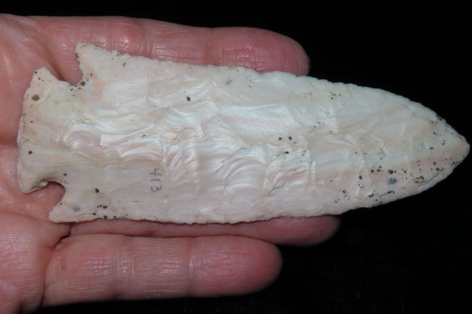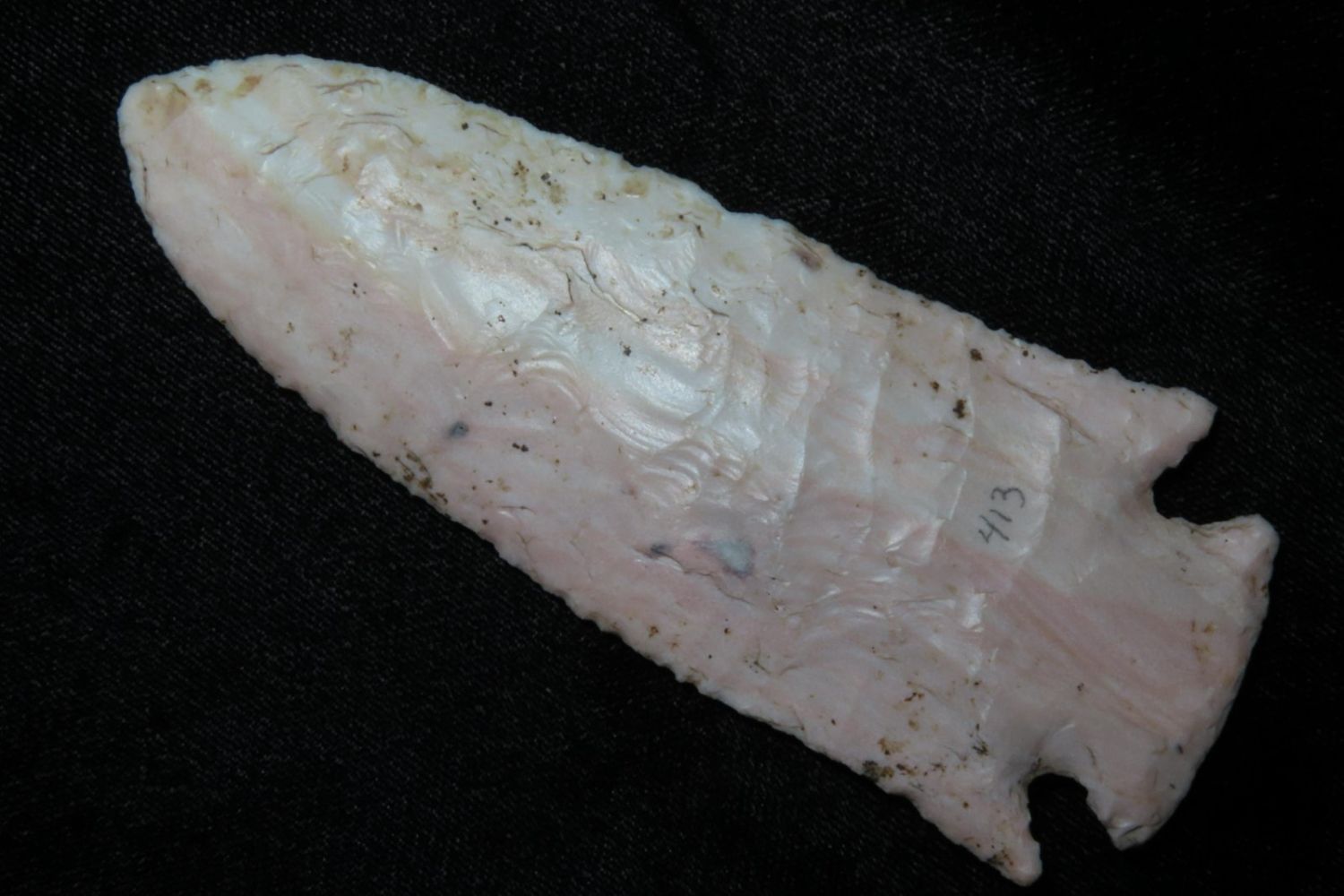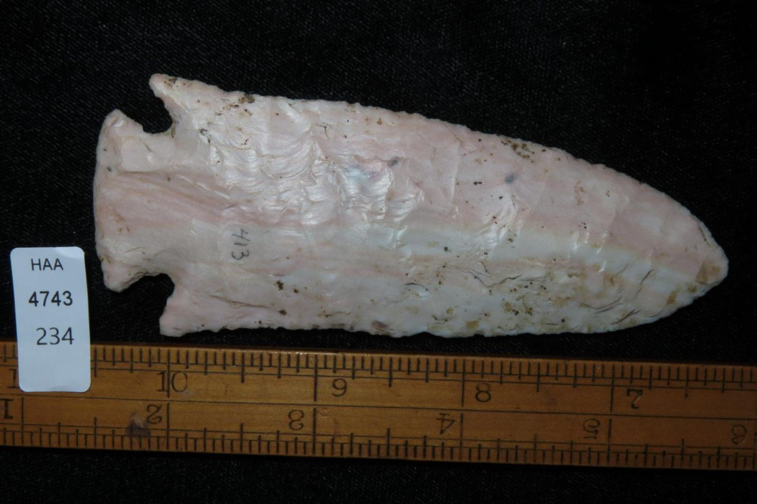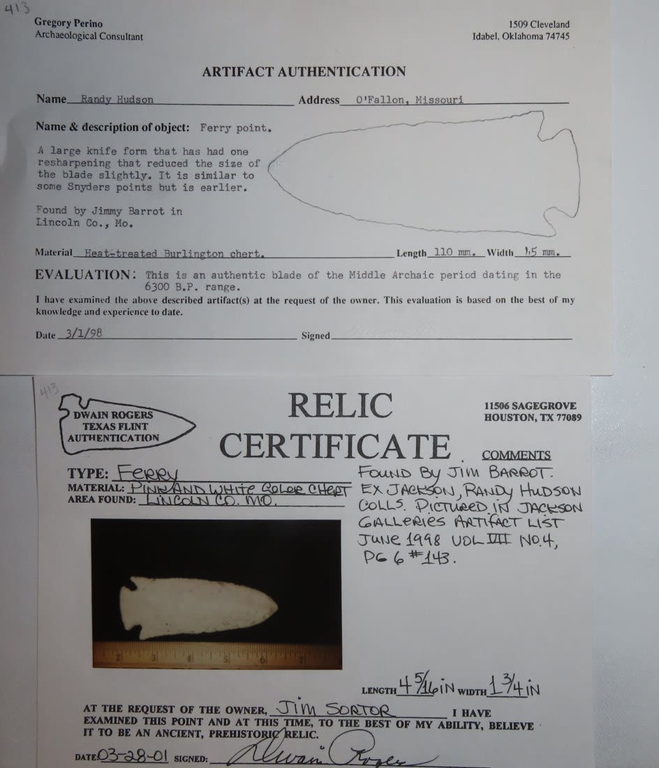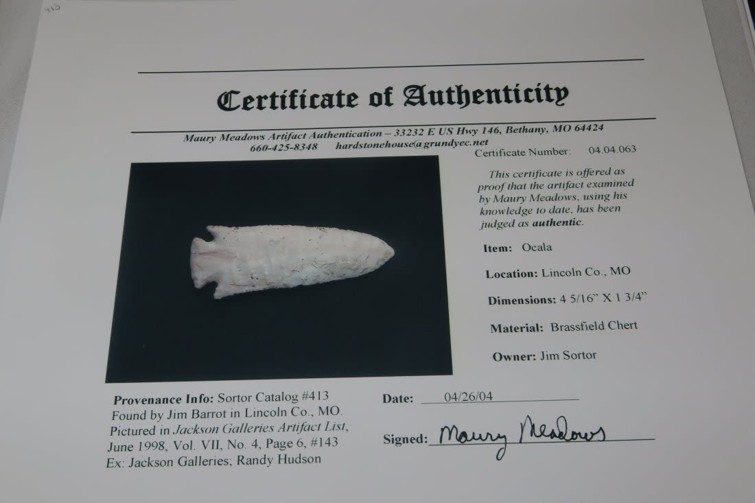 4 1/4" Ocala/Hardove. 3x COA: Meadows, Rogers and Perino. Ex Jim Sortor. Well made and colorful with nice patina. From the James and Joe George Collection. Joe George was an avid collector and finder of Native American artifacts in the greater St Louis Missouri area. Joe collected his entire life. Upon his passing he turned his collection over to his son James. James was also a very avid collector. He enjoyed walking various waterways and attending artifact shows. James is looking forward to passing down his collection to the relic community for caretaking.