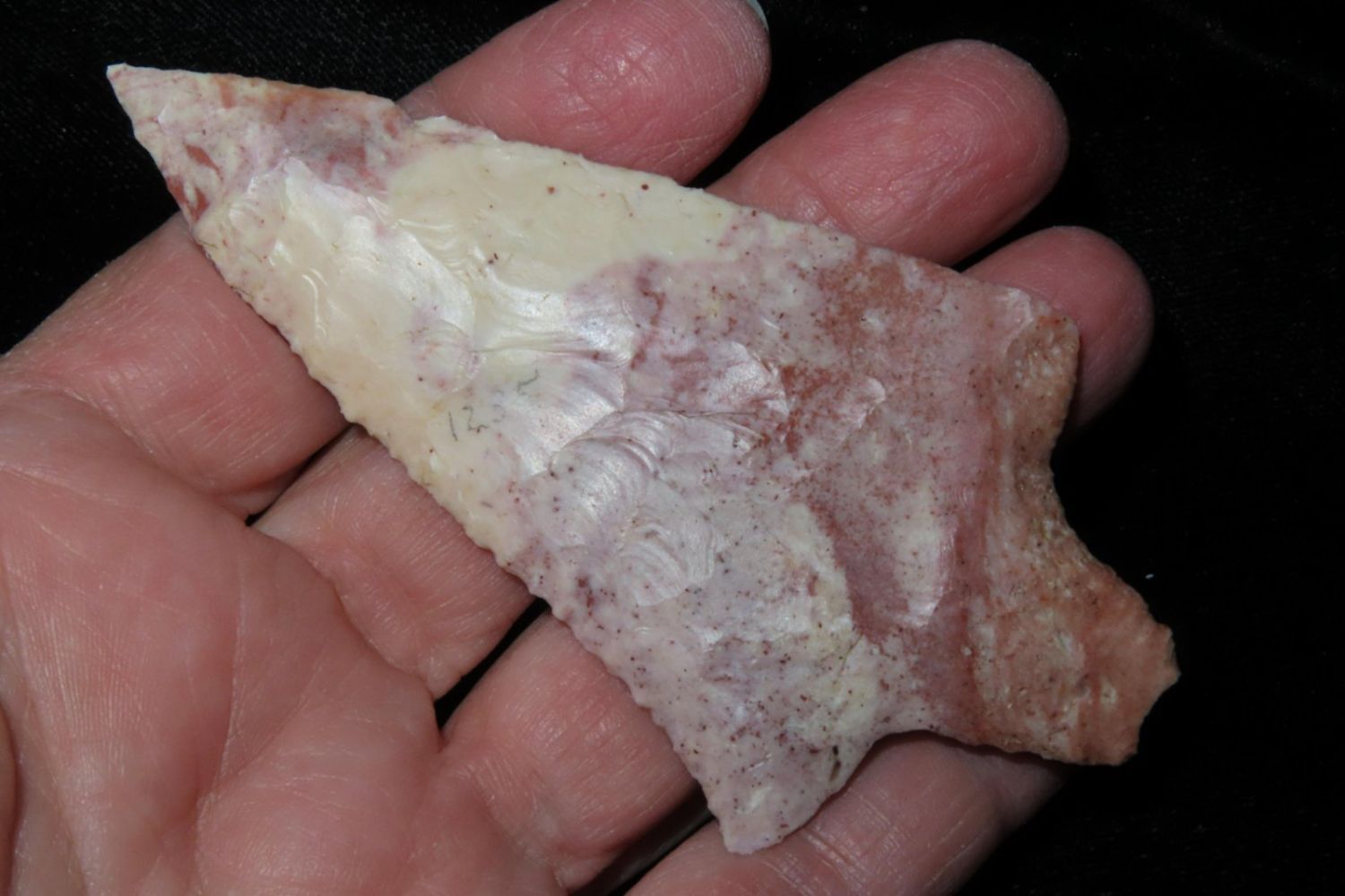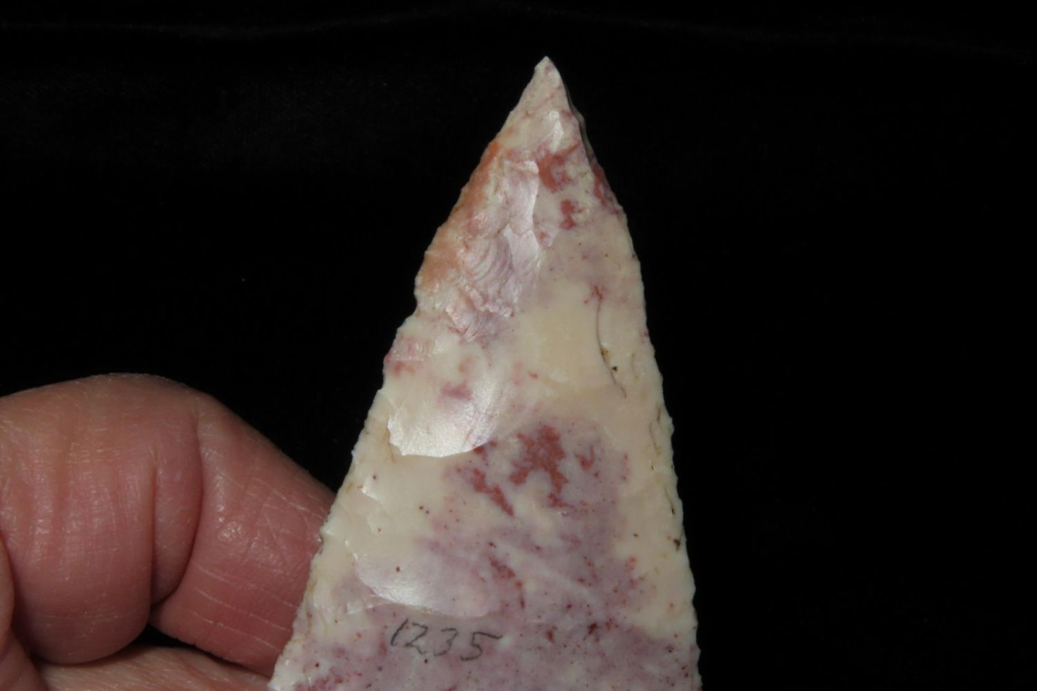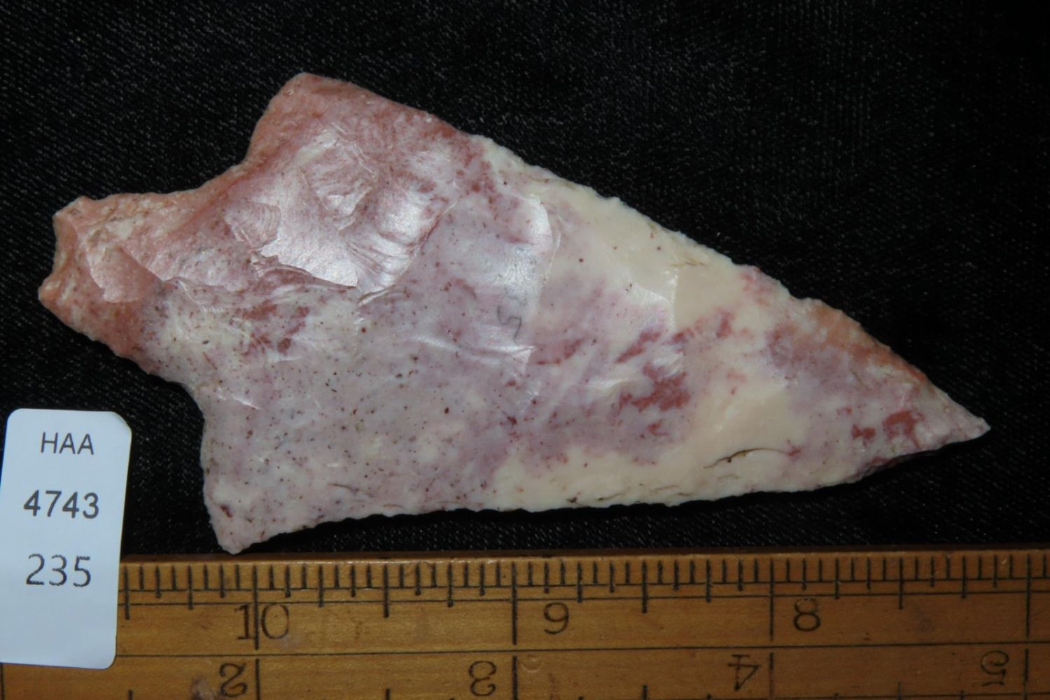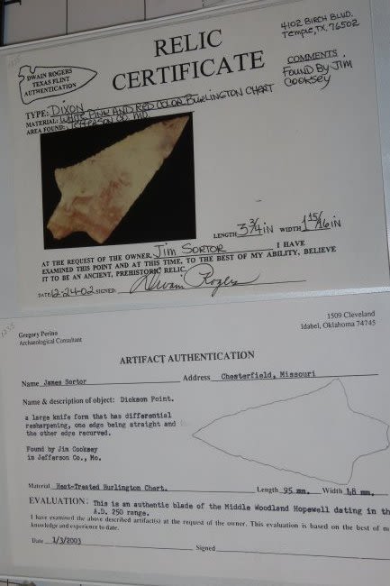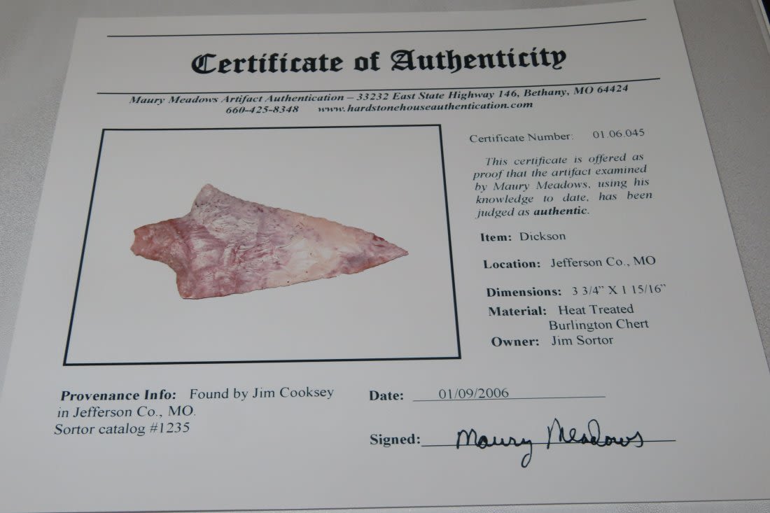 3 3/4" Dickson. 3x COA: Rogers, Meadows and Perino. Found by Jim Cooksey in Jefferson County, MO. Pictured in Spring 2007 Off line Magazine. From the James and Joe George Collection. Joe George was an avid collector and finder of Native American artifacts in the greater St Louis Missouri area. Joe collected his entire life. Upon his passing he turned his collection over to his son James. James was also a very avid collector. He enjoyed walking various waterways and attending artifact shows. James is looking forward to passing down his collection to the relic community for caretaking.
