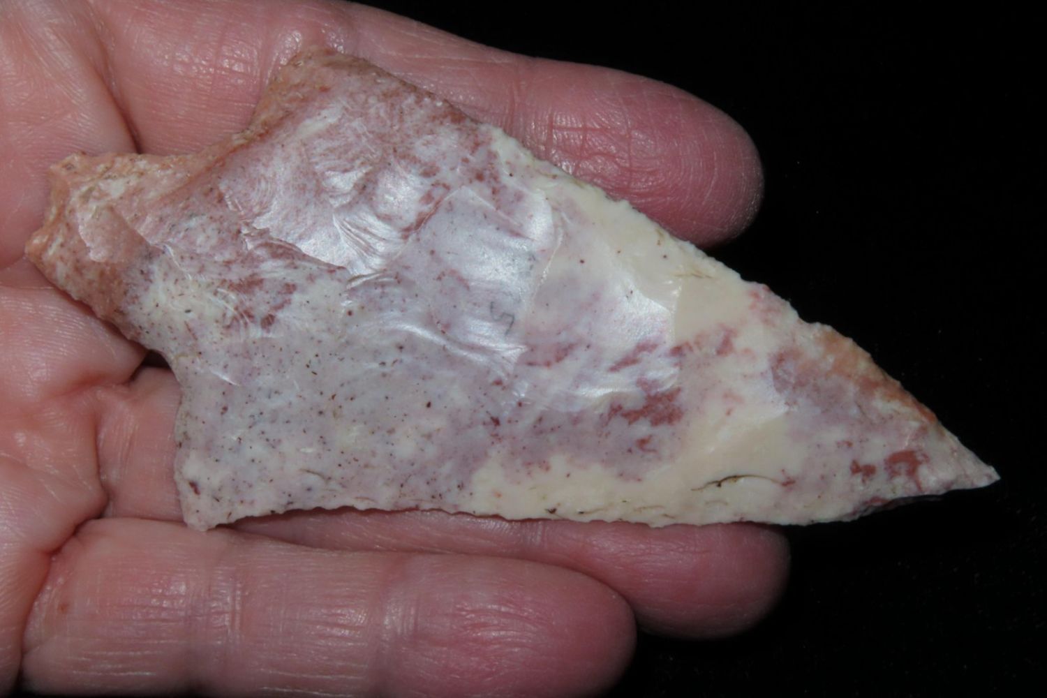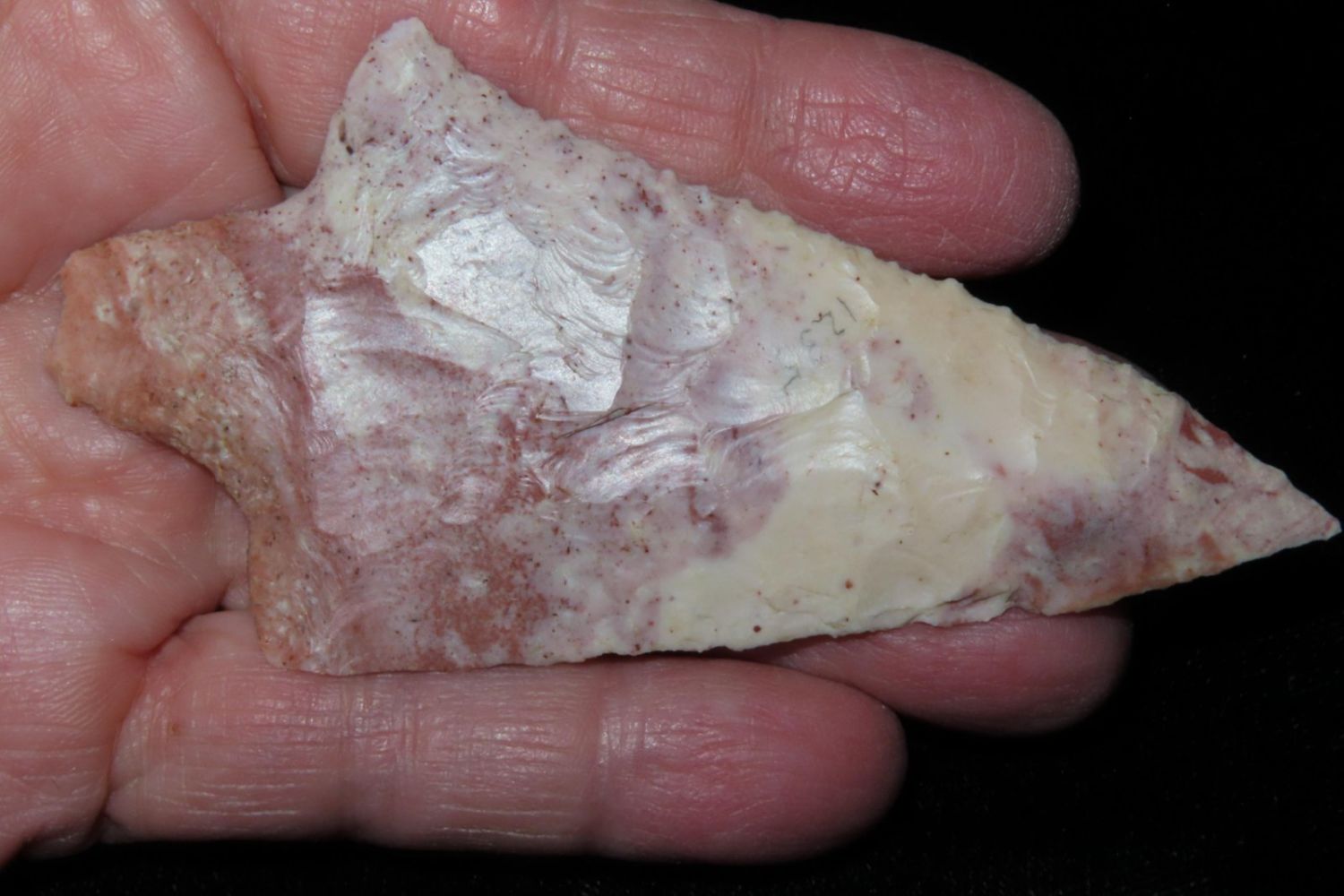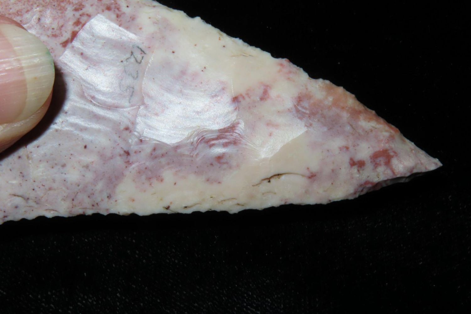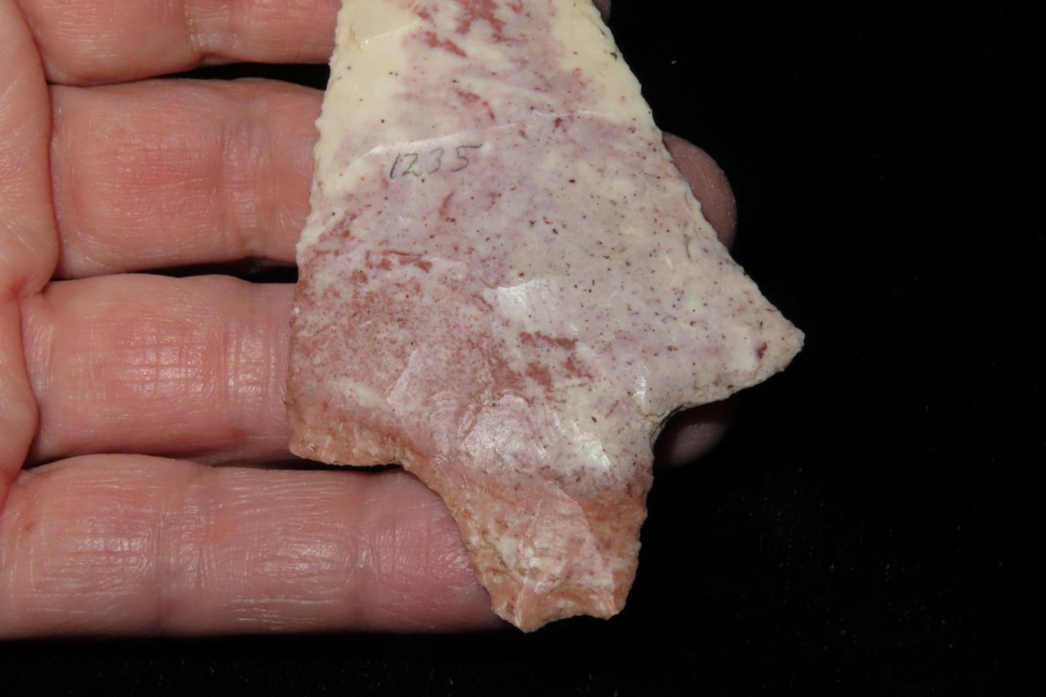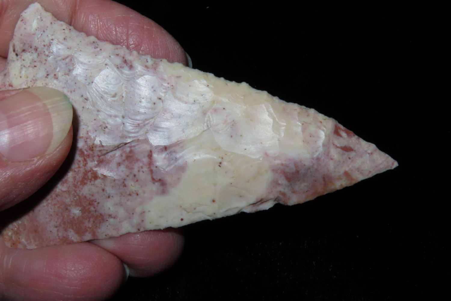 3 3/4" Dickson. 3x COA: Rogers, Meadows and Perino. Found by Jim Cooksey in Jefferson County, MO. Pictured in Spring 2007 Off line Magazine. From the James and Joe George Collection. Joe George was an avid collector and finder of Native American artifacts in the greater St Louis Missouri area. Joe collected his entire life. Upon his passing he turned his collection over to his son James. James was also a very avid collector. He enjoyed walking various waterways and attending artifact shows. James is looking forward to passing down his collection to the relic community for caretaking.