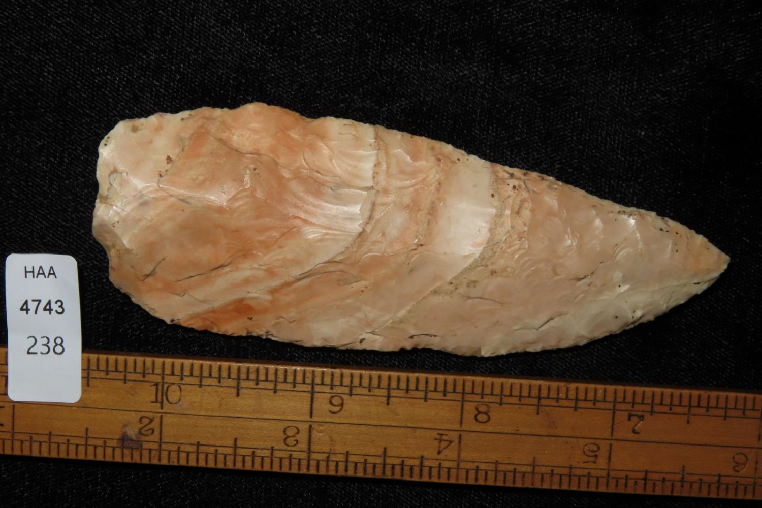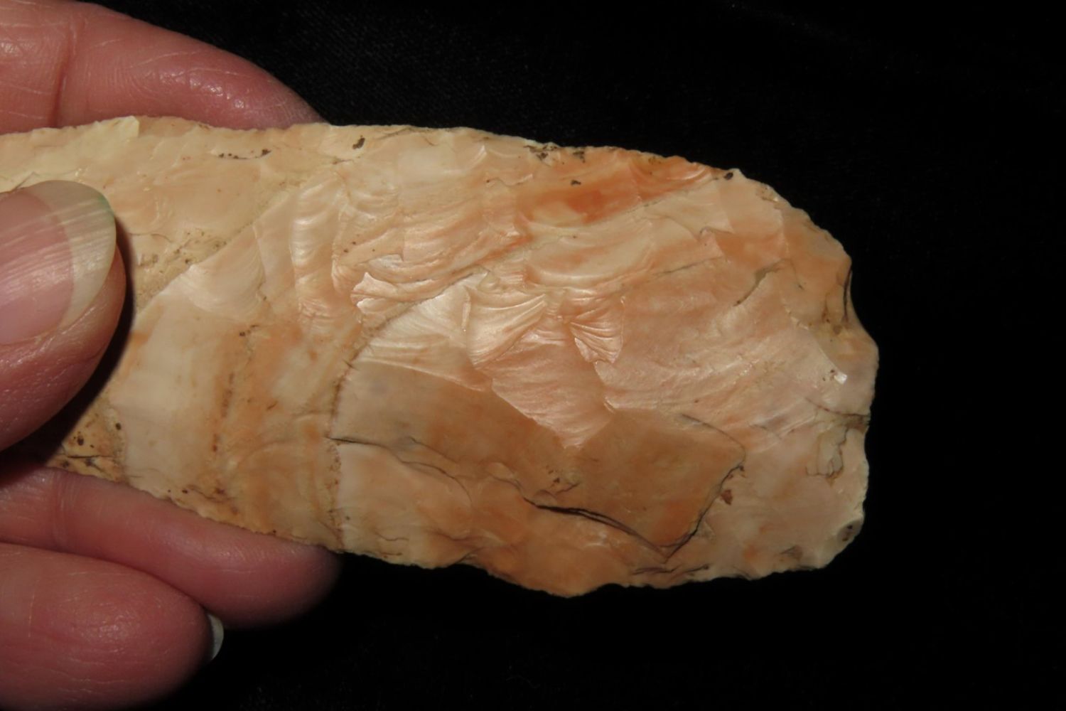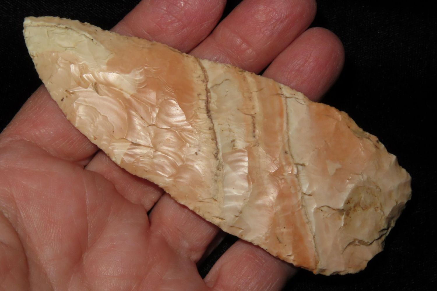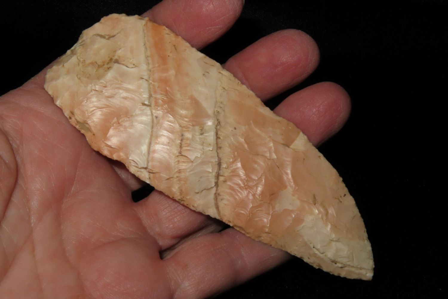 4 3/16" Very Colorful Woodland Knife. From the James and Joe George Collection. Joe George was an avid collector and finder of Native American artifacts in the greater St Louis Missouri area. Joe collected his entire life. Upon his passing he turned his collection over to his son James. James was also a very avid collector. He enjoyed walking various waterways and attending artifact shows. James is looking forward to passing down his collection to the relic community for caretaking.