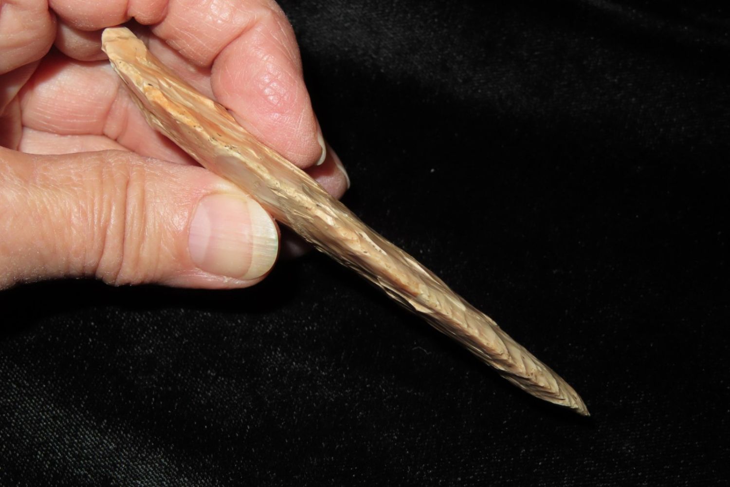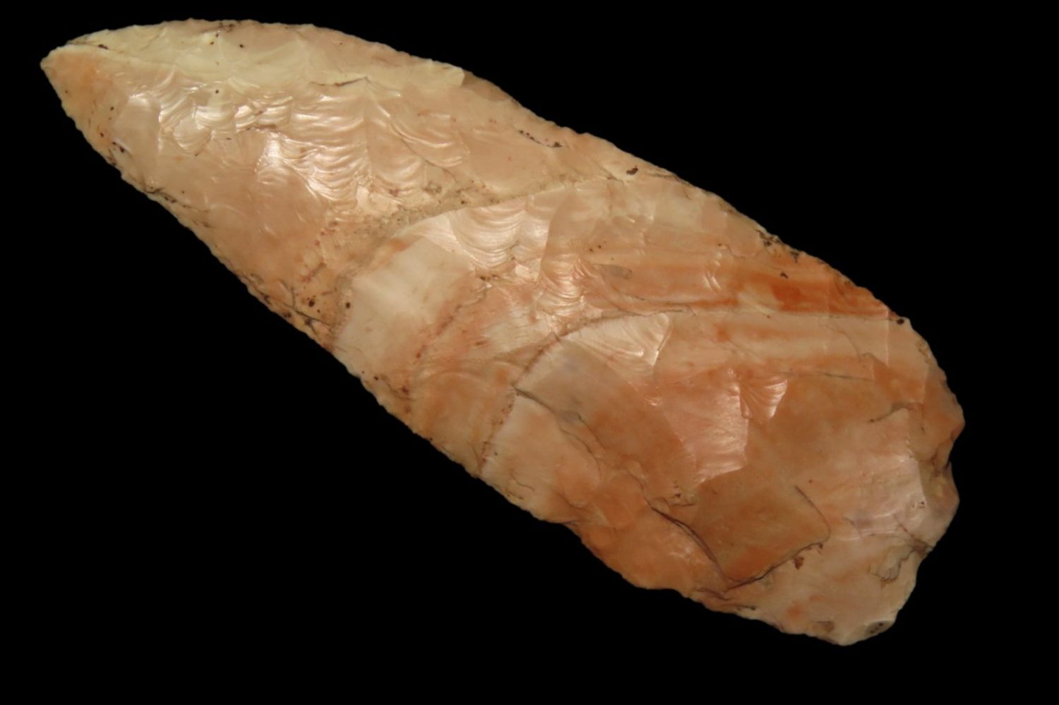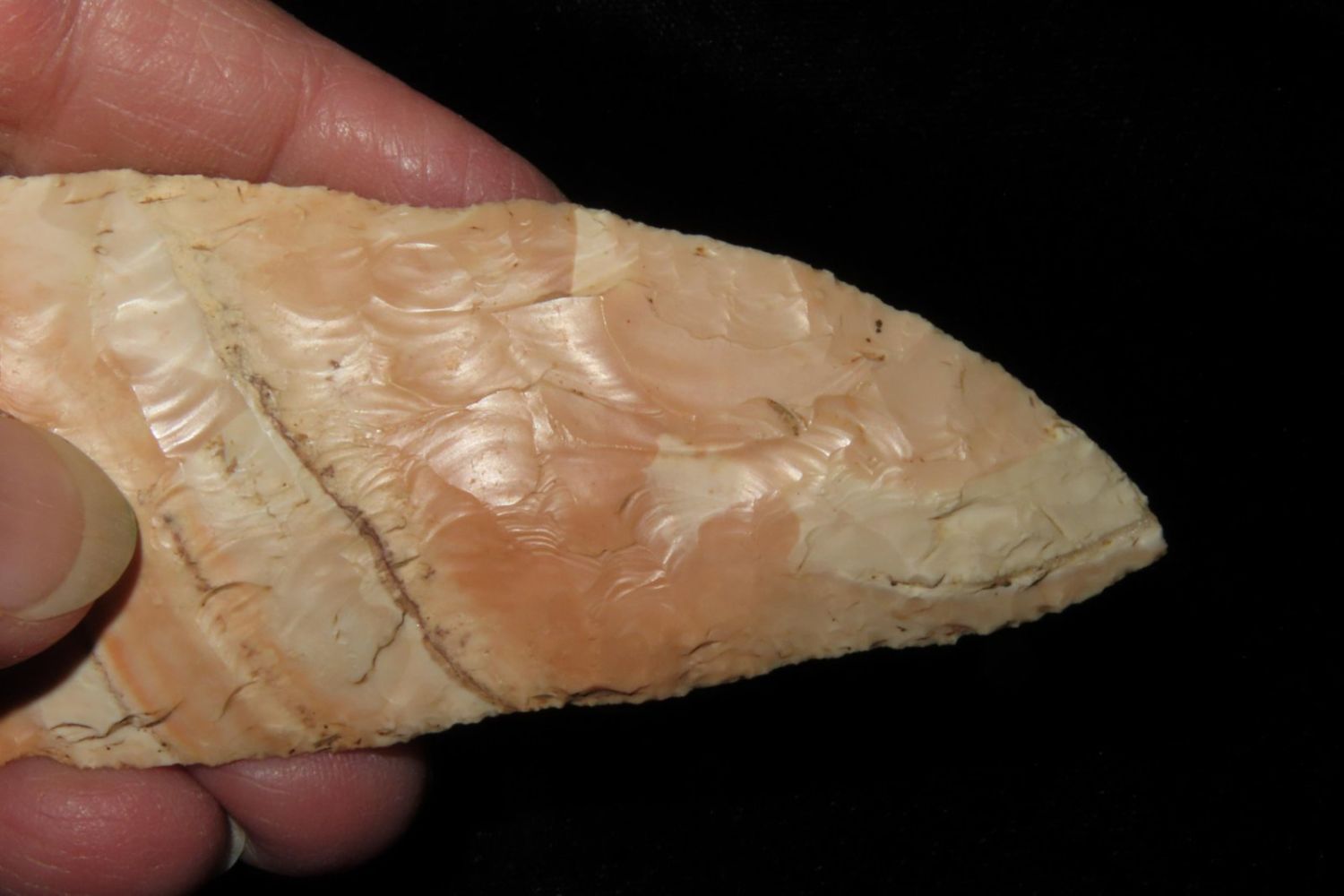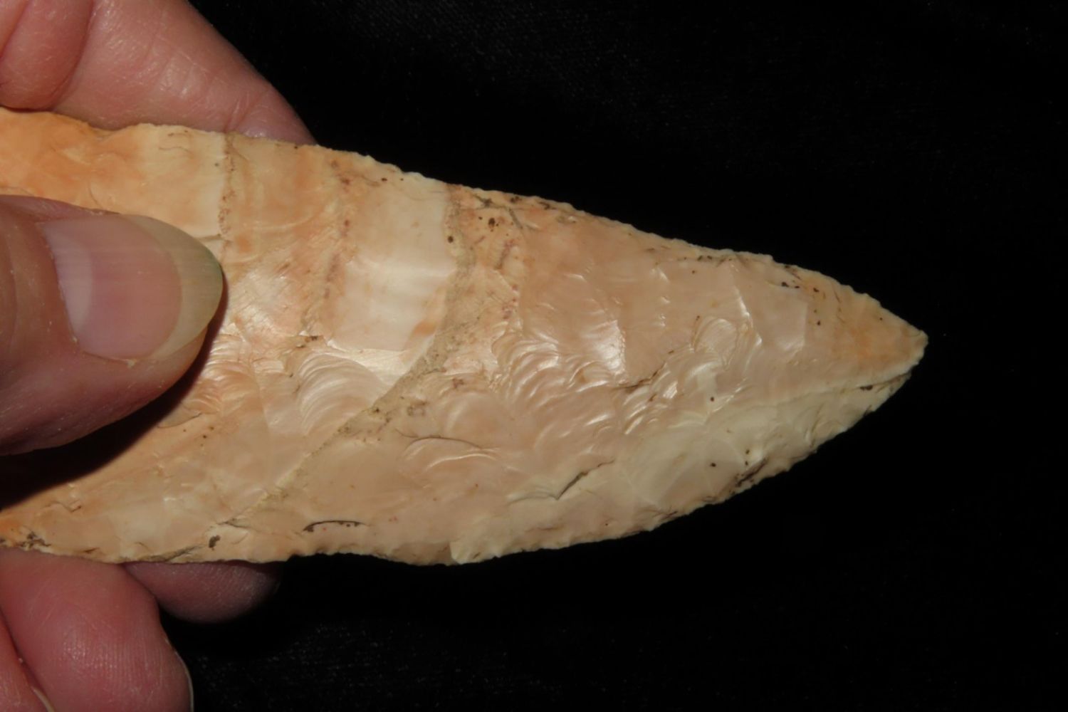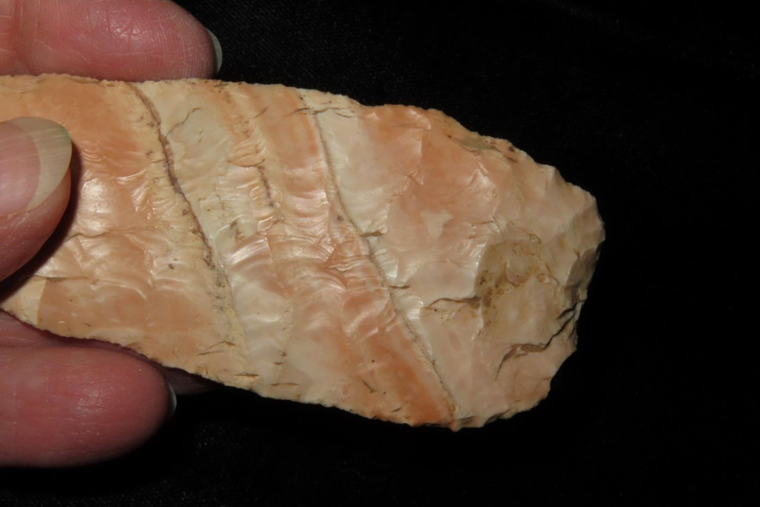 4 3/16" Very Colorful Woodland Knife. From the James and Joe George Collection. Joe George was an avid collector and finder of Native American artifacts in the greater St Louis Missouri area. Joe collected his entire life. Upon his passing he turned his collection over to his son James. James was also a very avid collector. He enjoyed walking various waterways and attending artifact shows. James is looking forward to passing down his collection to the relic community for caretaking.