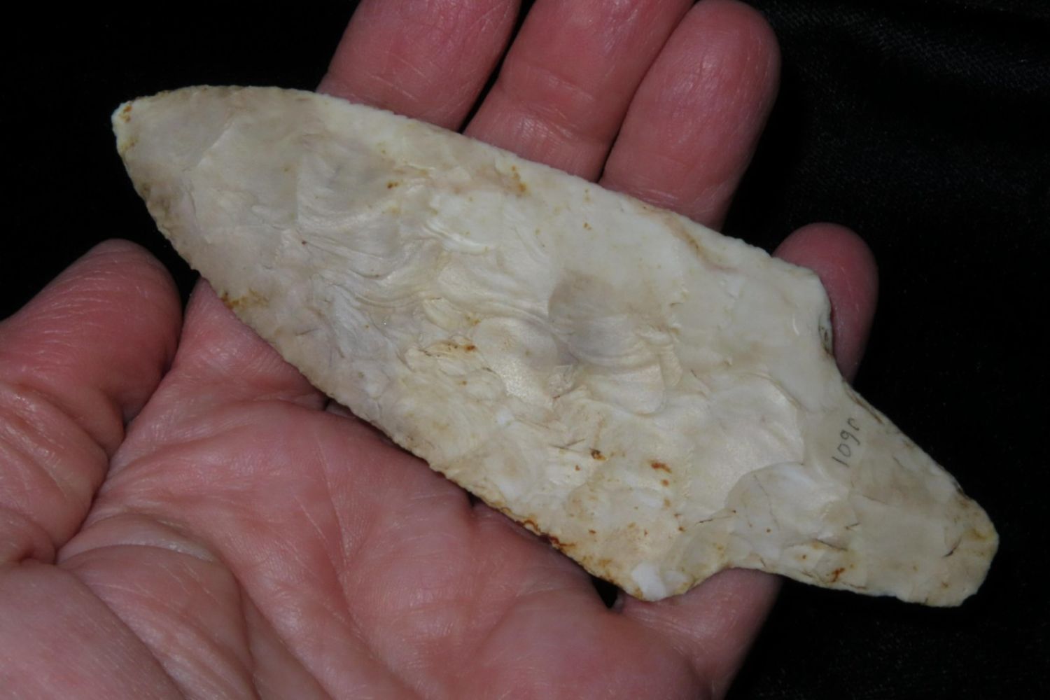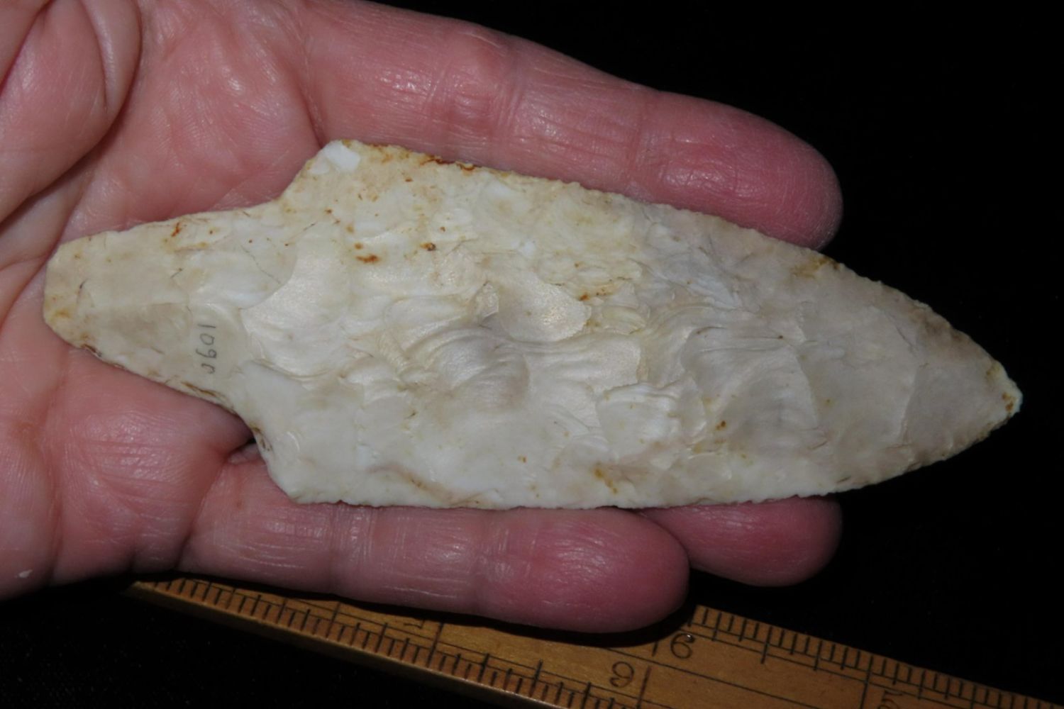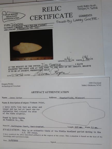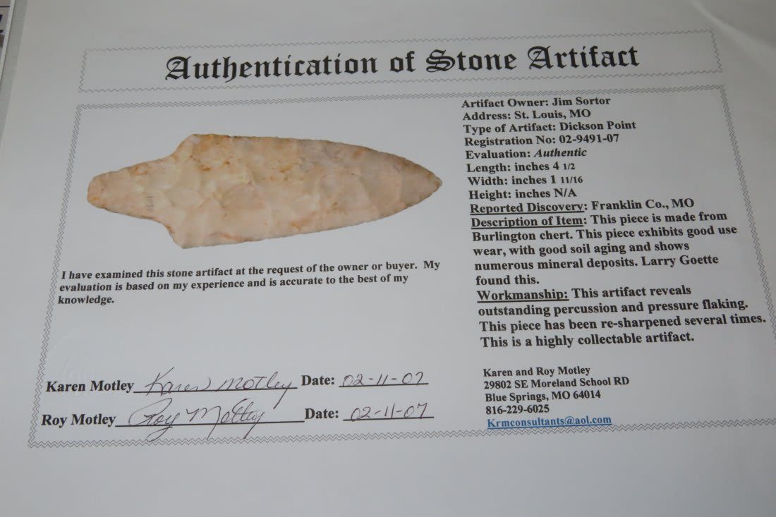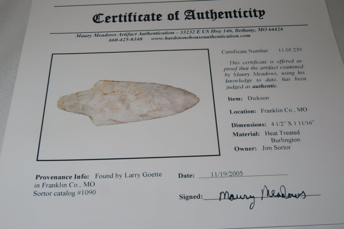 4 1/2" Dickson. 4x COA: Rogers, Perino, Meadows and Motley. Found in Franklin County, MO. From the James and Joe George Collection. Joe George was an avid collector and finder of Native American artifacts in the greater St Louis Missouri area. Joe collected his entire life. Upon his passing he turned his collection over to his son James. James was also a very avid collector. He enjoyed walking various waterways and attending artifact shows. James is looking forward to passing down his collection to the relic community for caretaking.