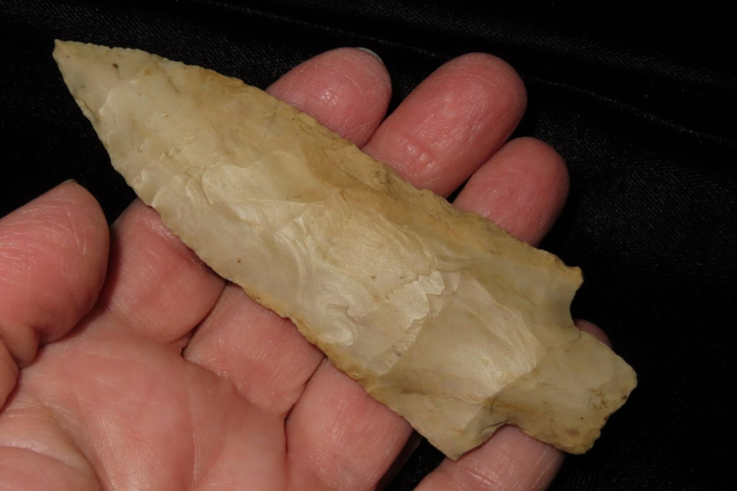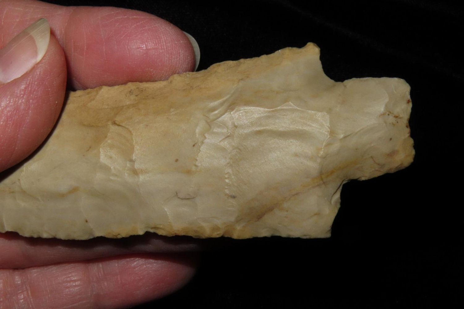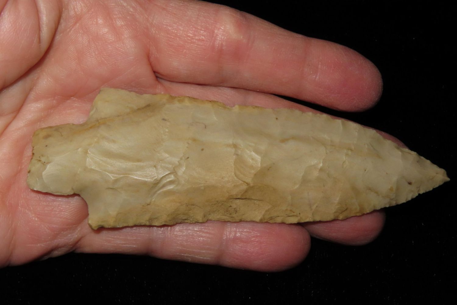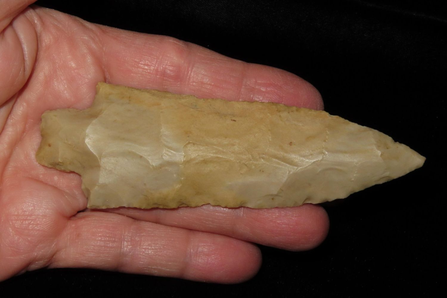 4 1/4" Etley. From the James and Joe George Collection. Joe George was an avid collector and finder of Native American artifacts in the greater St Louis Missouri area. Joe collected his entire life. Upon his passing he turned his collection over to his son James. James was also a very avid collector. He enjoyed walking various waterways and attending artifact shows. James is looking forward to passing down his collection to the relic community for caretaking.