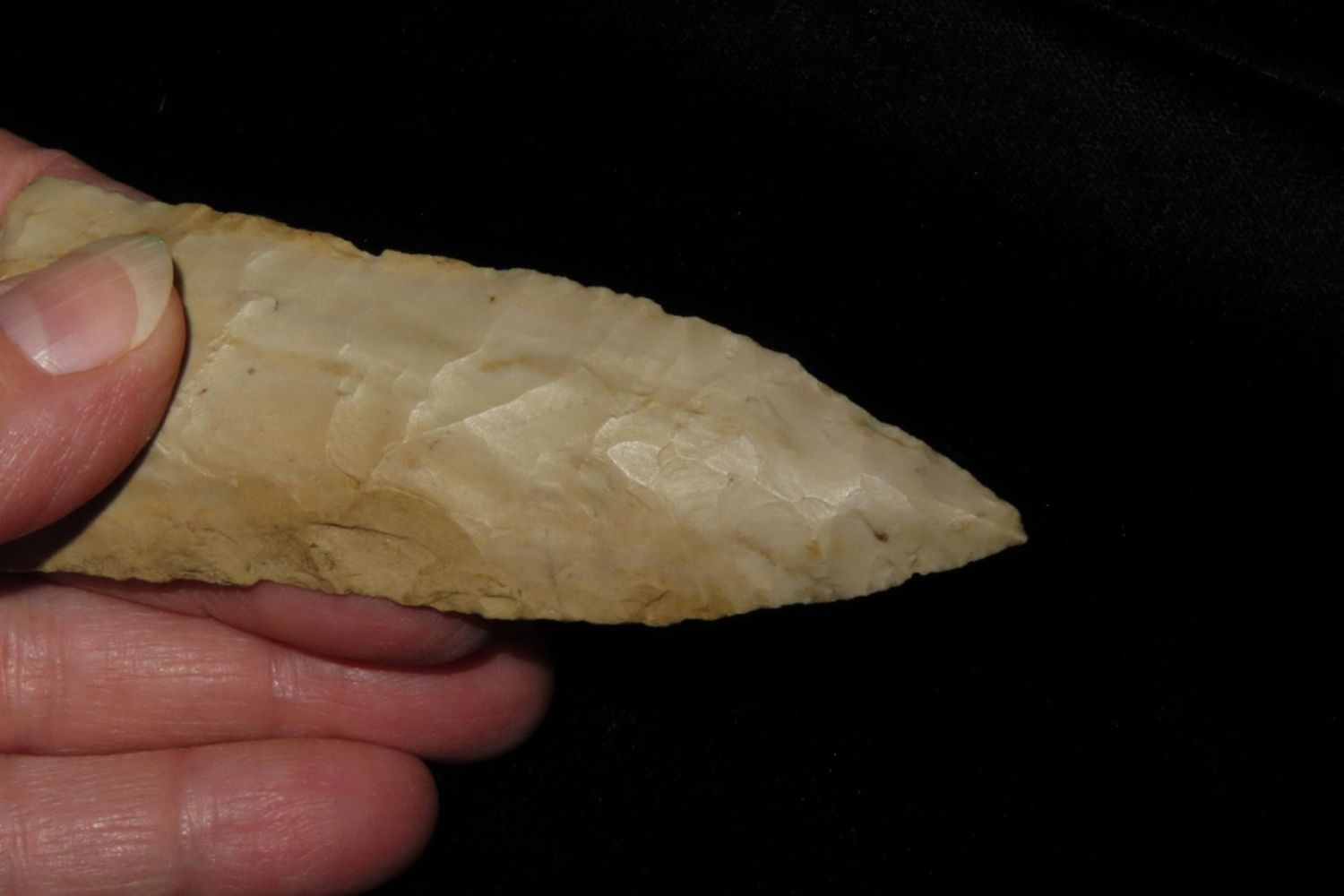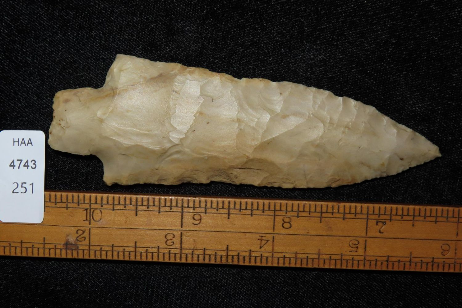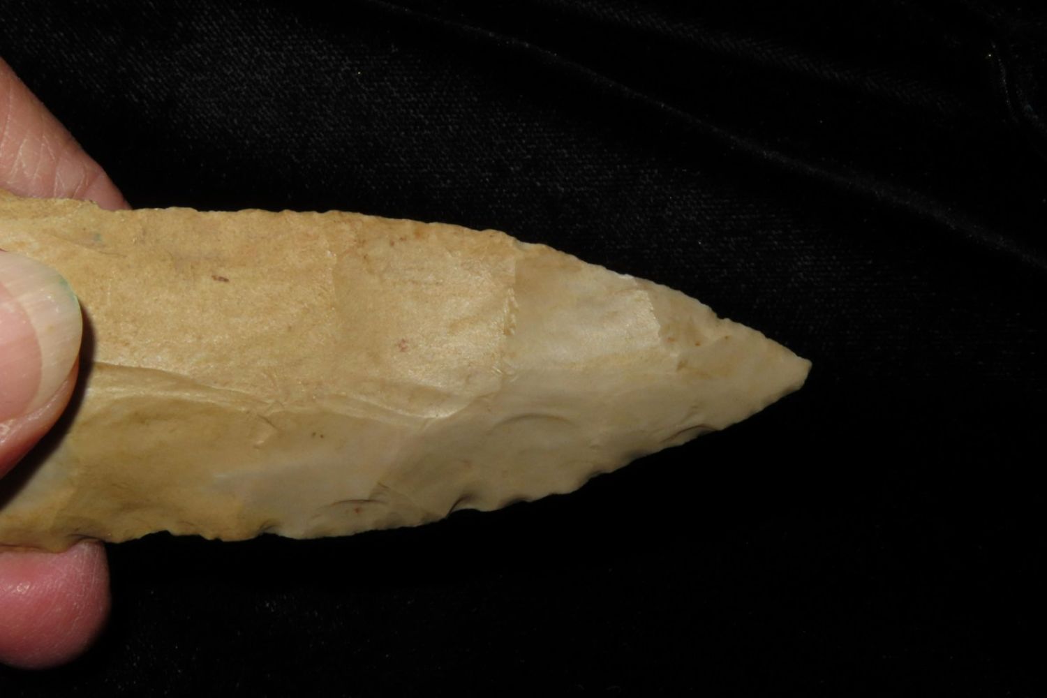 4 1/4" Etley. From the James and Joe George Collection. Joe George was an avid collector and finder of Native American artifacts in the greater St Louis Missouri area. Joe collected his entire life. Upon his passing he turned his collection over to his son James. James was also a very avid collector. He enjoyed walking various waterways and attending artifact shows. James is looking forward to passing down his collection to the relic community for caretaking.