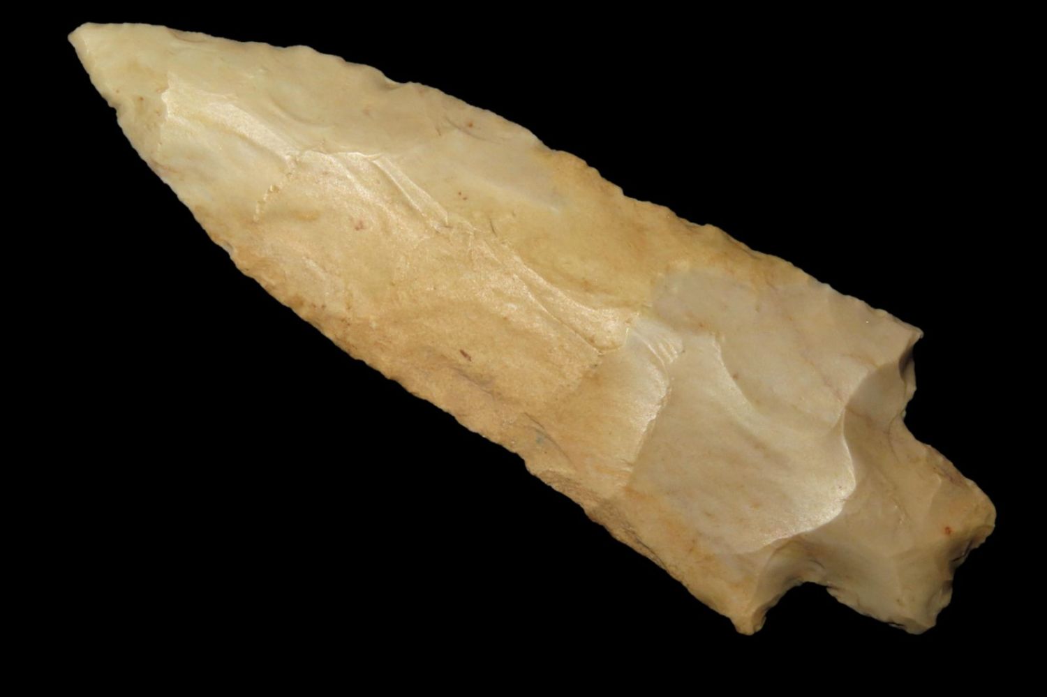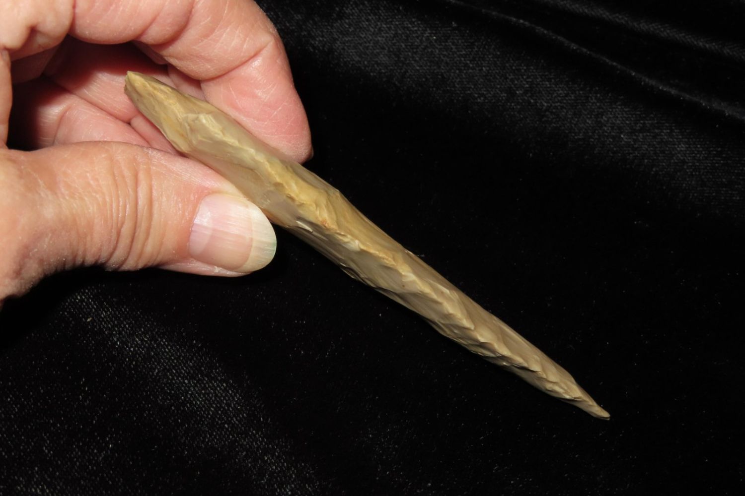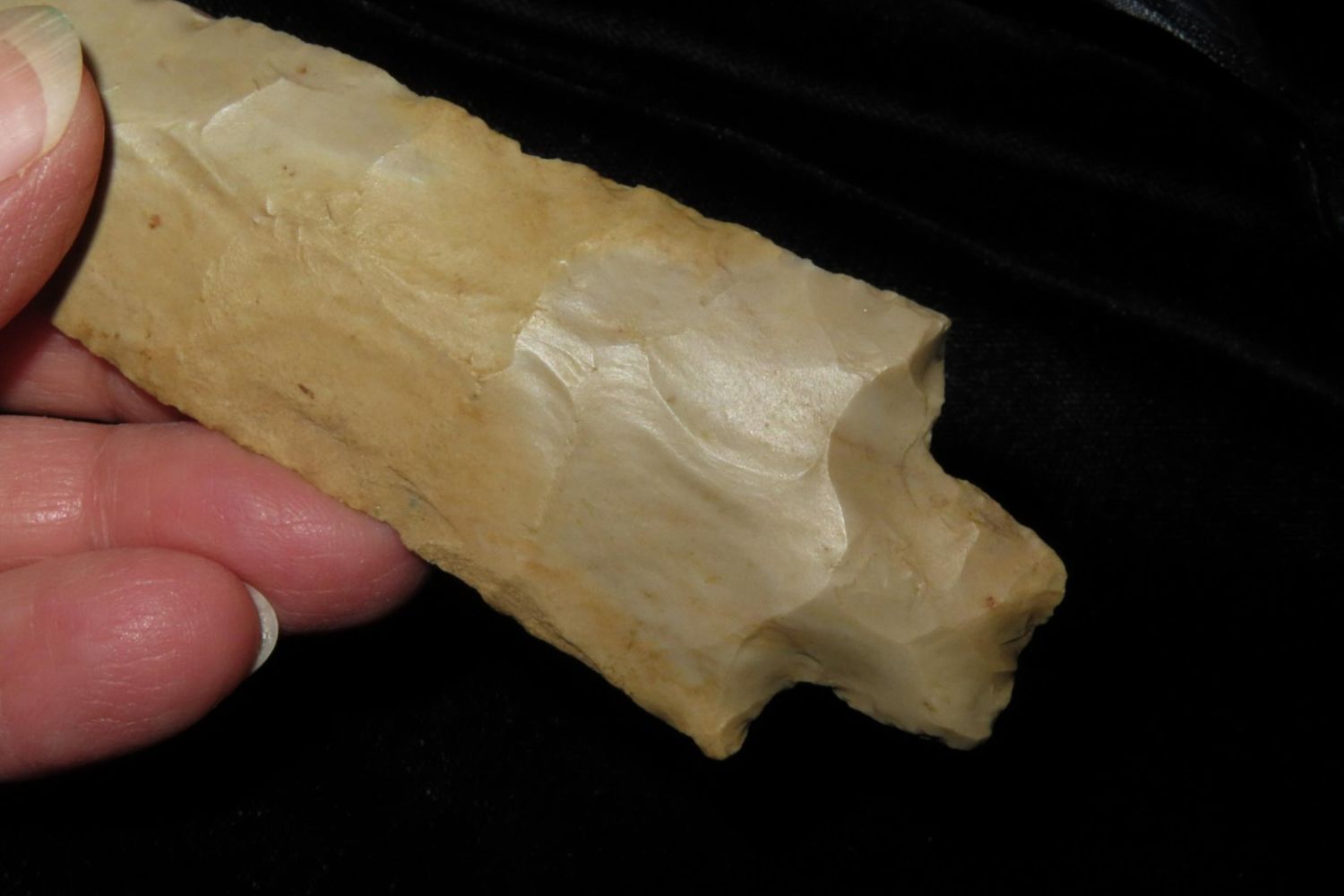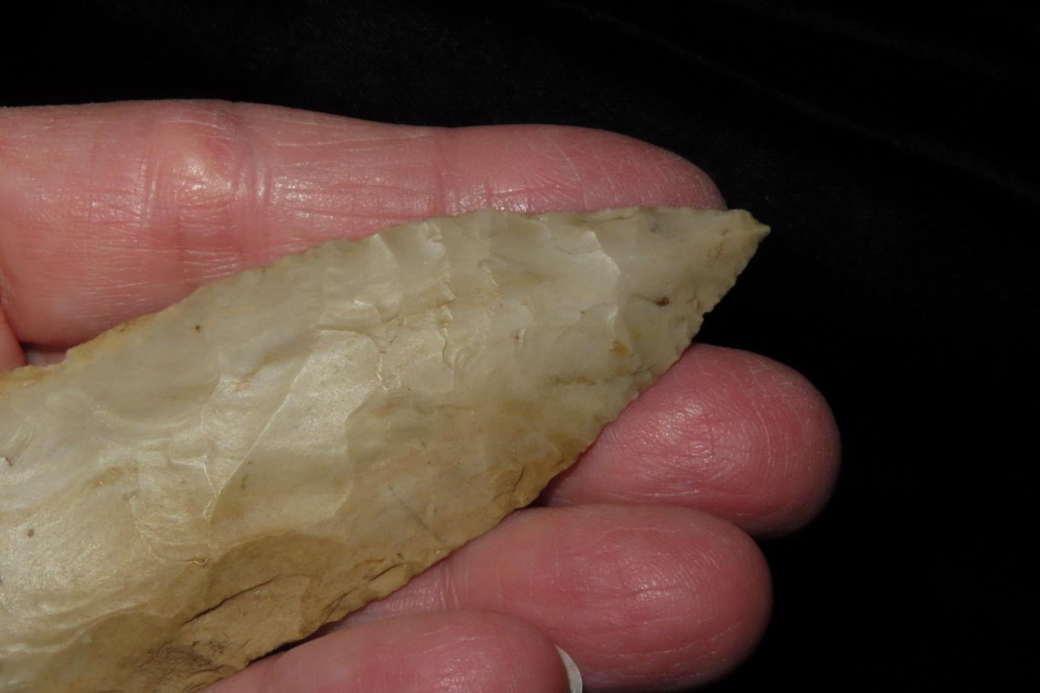 4 1/4" Etley. From the James and Joe George Collection. Joe George was an avid collector and finder of Native American artifacts in the greater St Louis Missouri area. Joe collected his entire life. Upon his passing he turned his collection over to his son James. James was also a very avid collector. He enjoyed walking various waterways and attending artifact shows. James is looking forward to passing down his collection to the relic community for caretaking.
