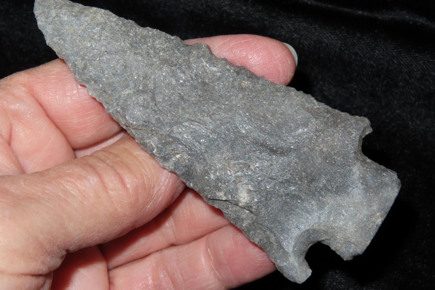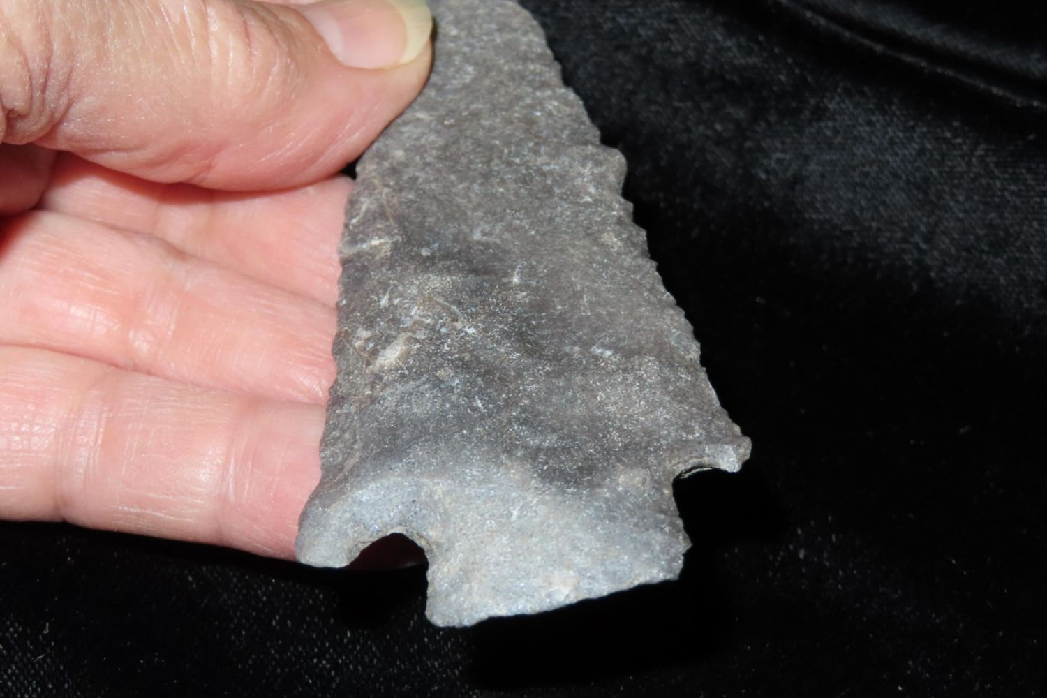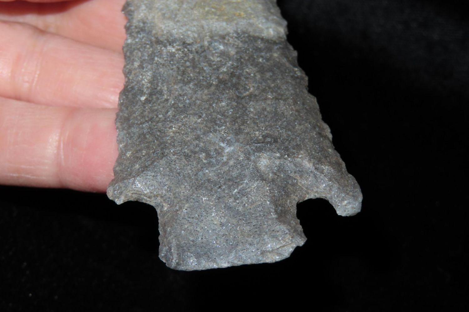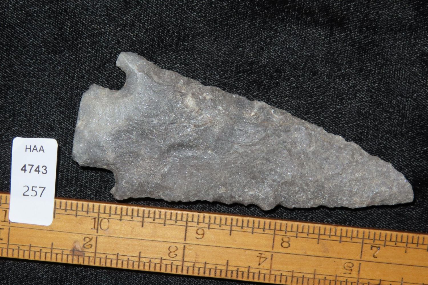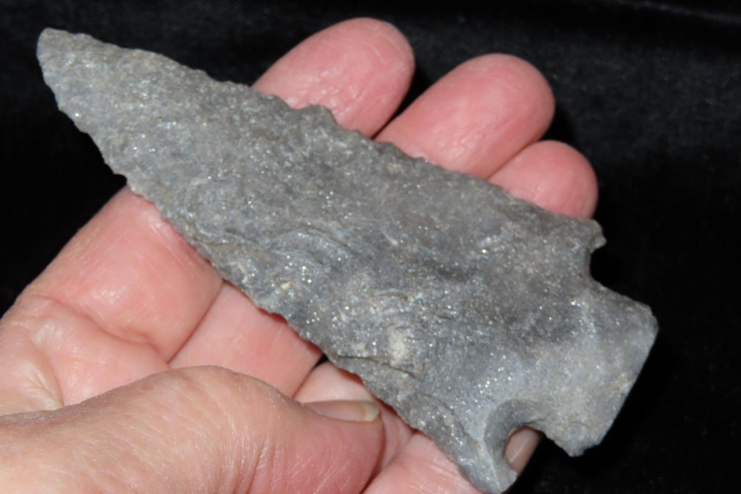 3 7/8" Etley. Found by Richard Whittle. From the James and Joe George Collection. Joe George was an avid collector and finder of Native American artifacts in the greater St Louis Missouri area. Joe collected his entire life. Upon his passing he turned his collection over to his son James. James was also a very avid collector. He enjoyed walking various waterways and attending artifact shows. James is looking forward to passing down his collection to the relic community for caretaking.