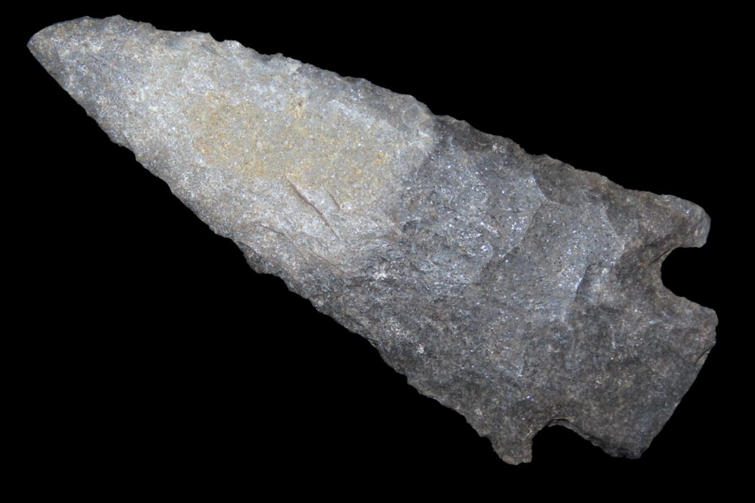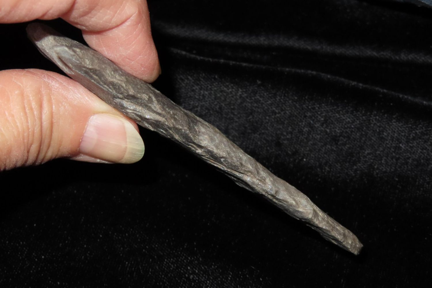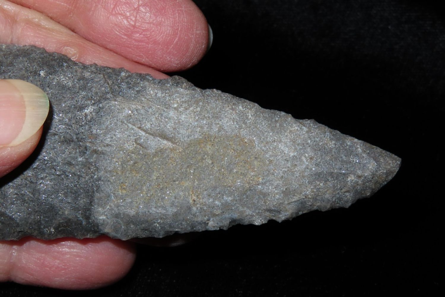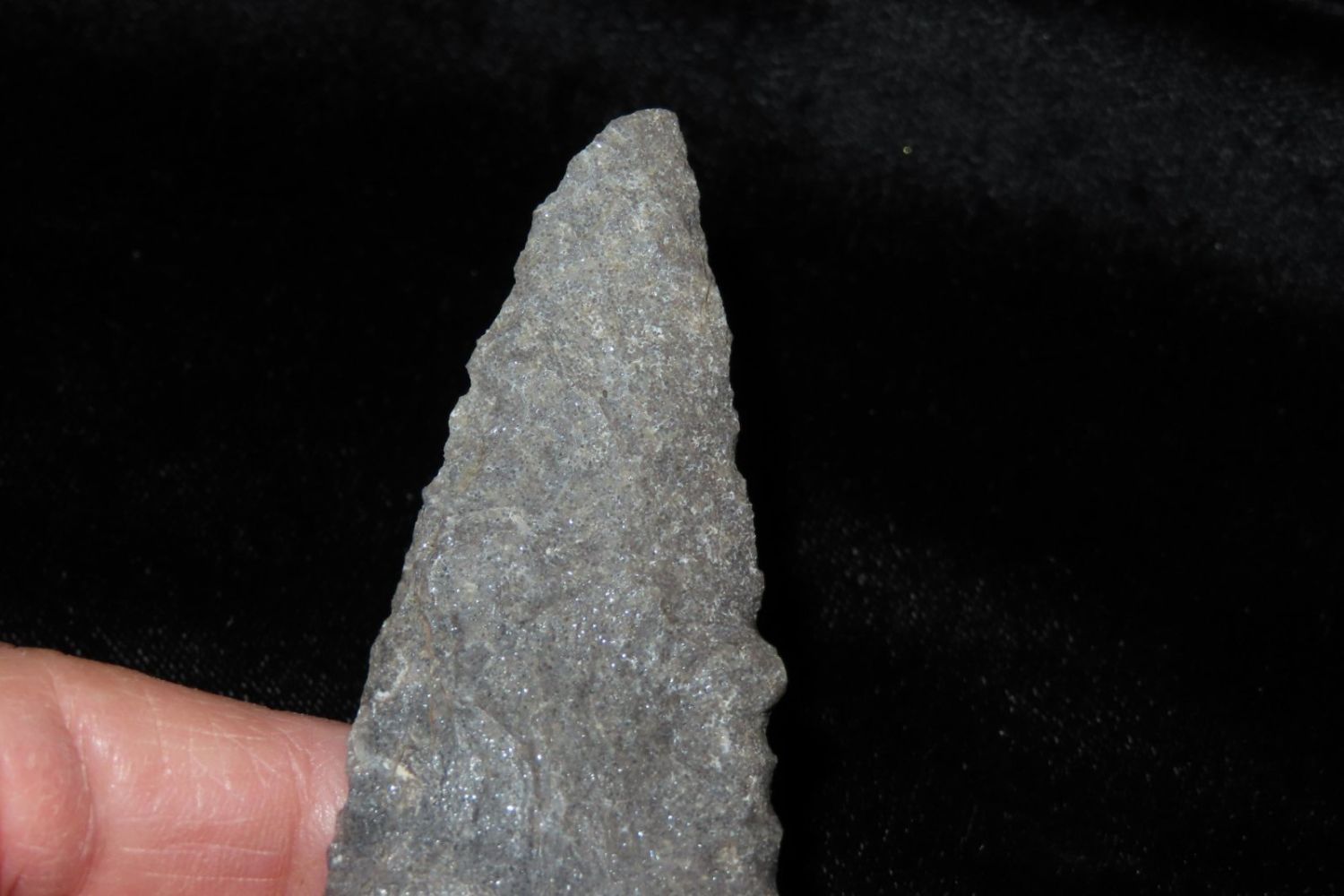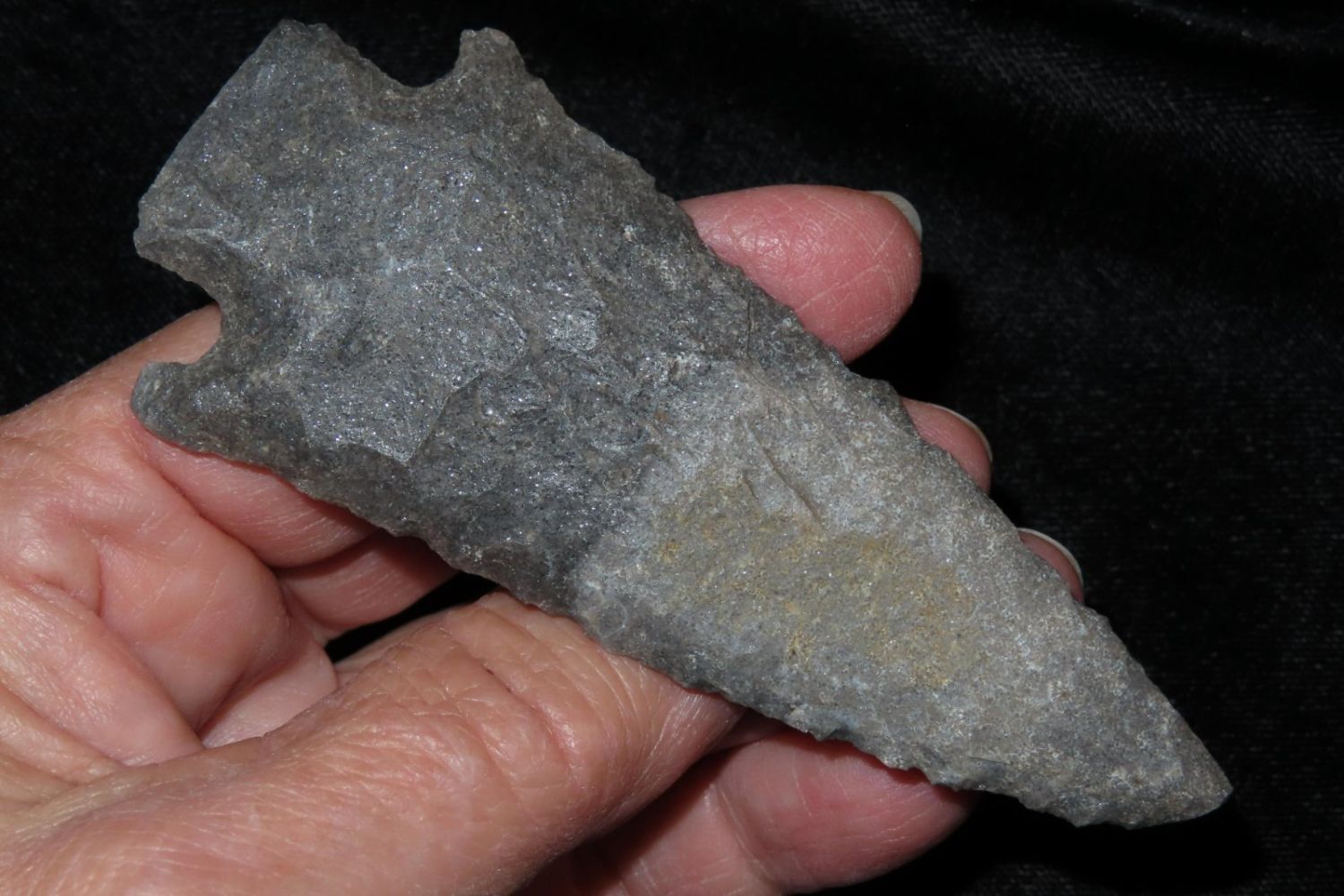 3 7/8" Etley. Found by Richard Whittle. From the James and Joe George Collection. Joe George was an avid collector and finder of Native American artifacts in the greater St Louis Missouri area. Joe collected his entire life. Upon his passing he turned his collection over to his son James. James was also a very avid collector. He enjoyed walking various waterways and attending artifact shows. James is looking forward to passing down his collection to the relic community for caretaking.