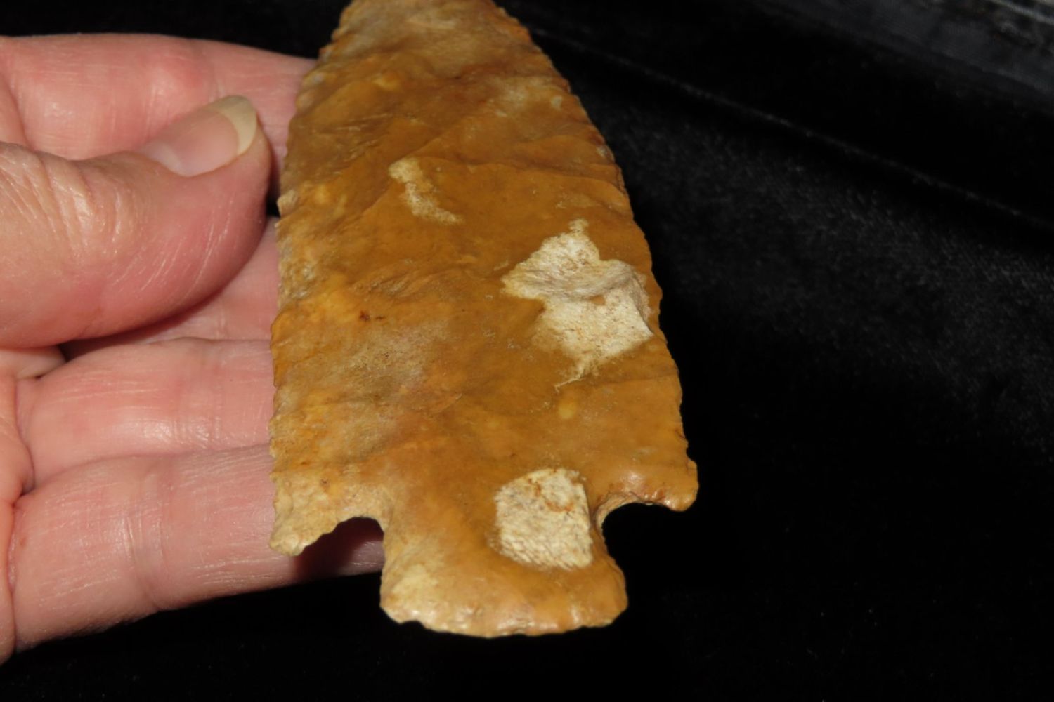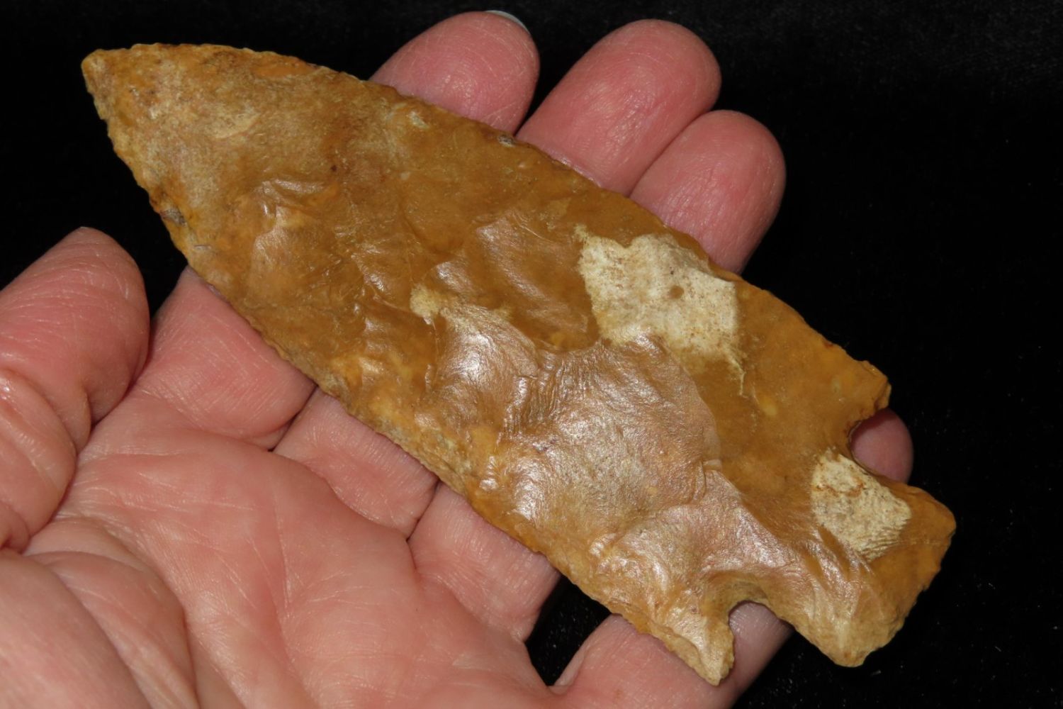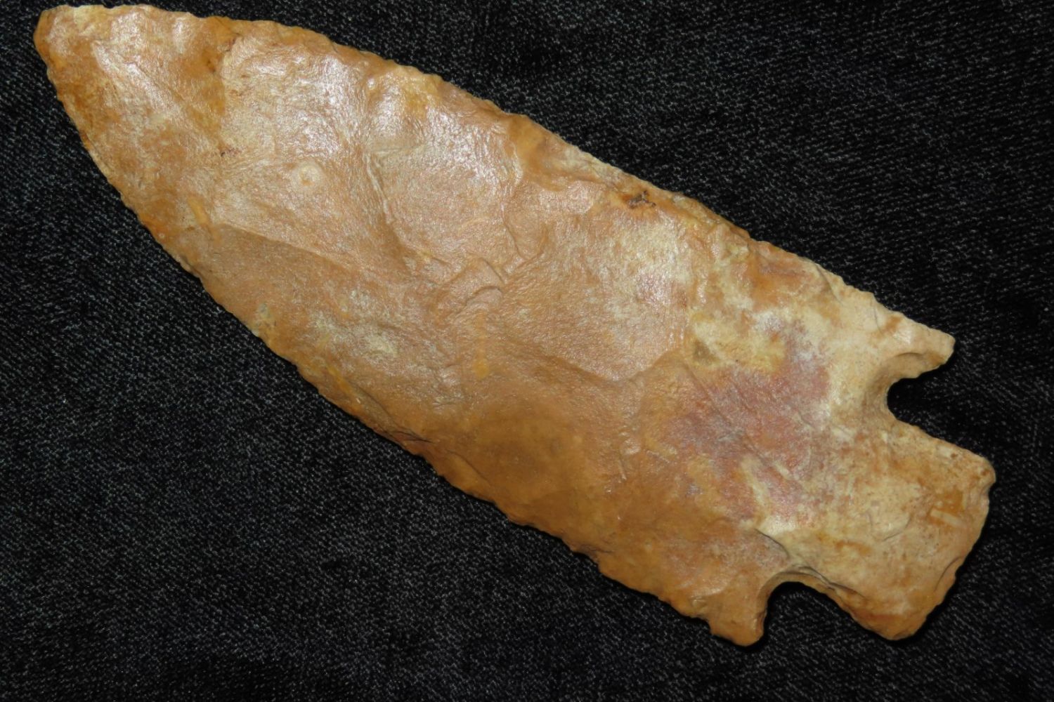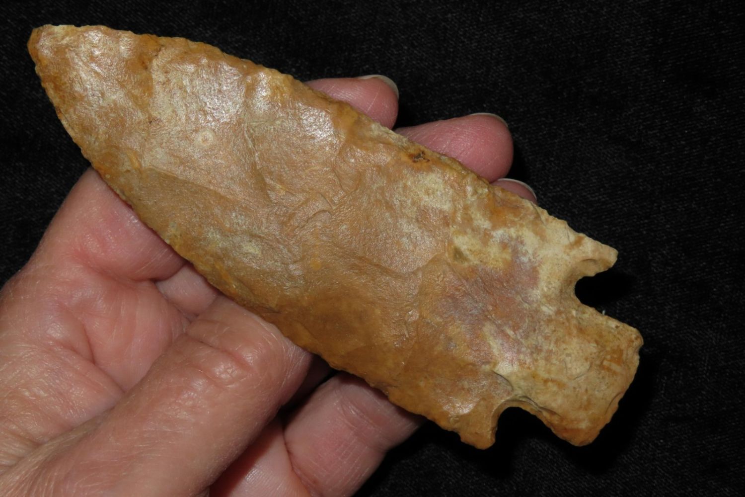 4 5/8" Etley with beautiful creek patina. From the James and Joe George Collection. Joe George was an avid collector and finder of Native American artifacts in the greater St Louis Missouri area. Joe collected his entire life. Upon his passing he turned his collection over to his son James. James was also a very avid collector. He enjoyed walking various waterways and attending artifact shows. James is looking forward to passing down his collection to the relic community for caretaking.