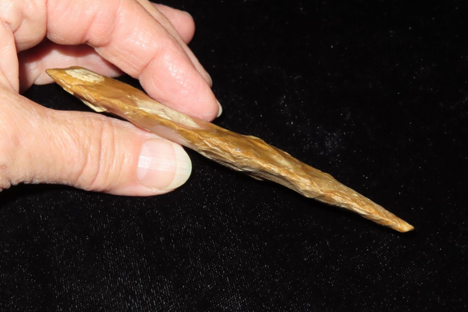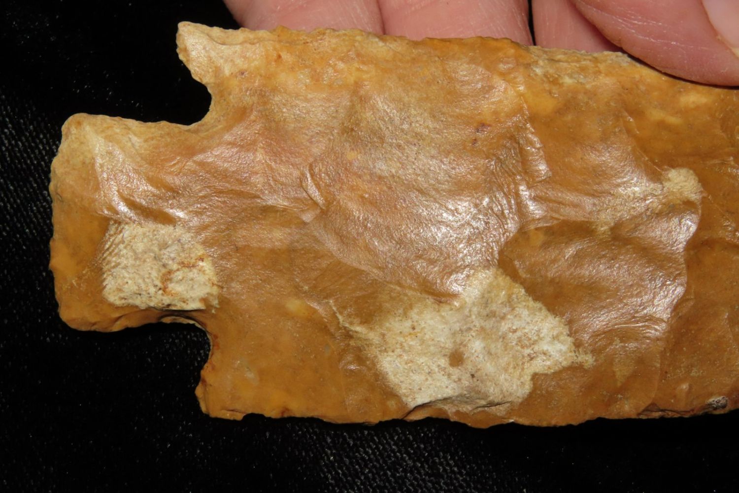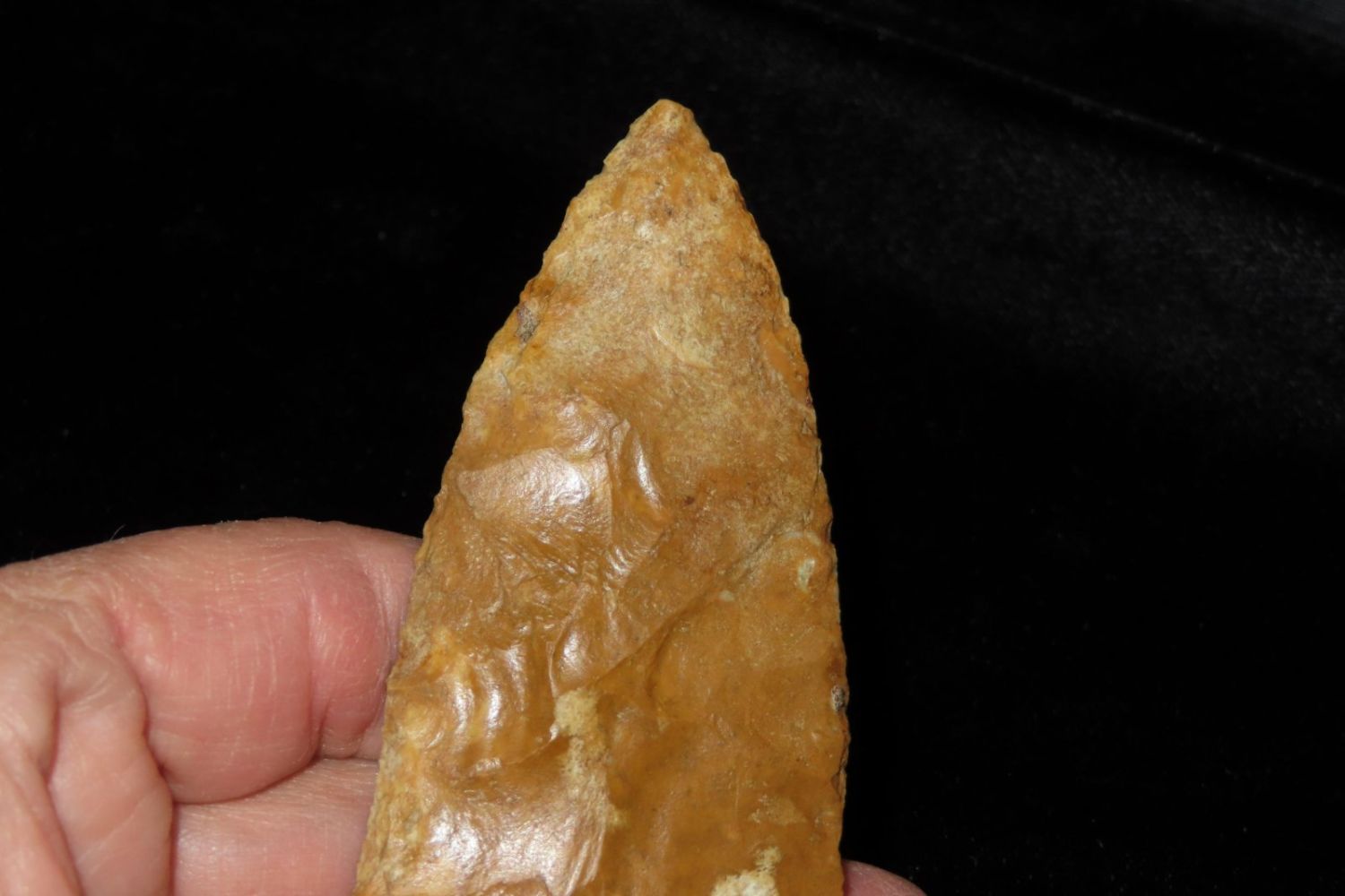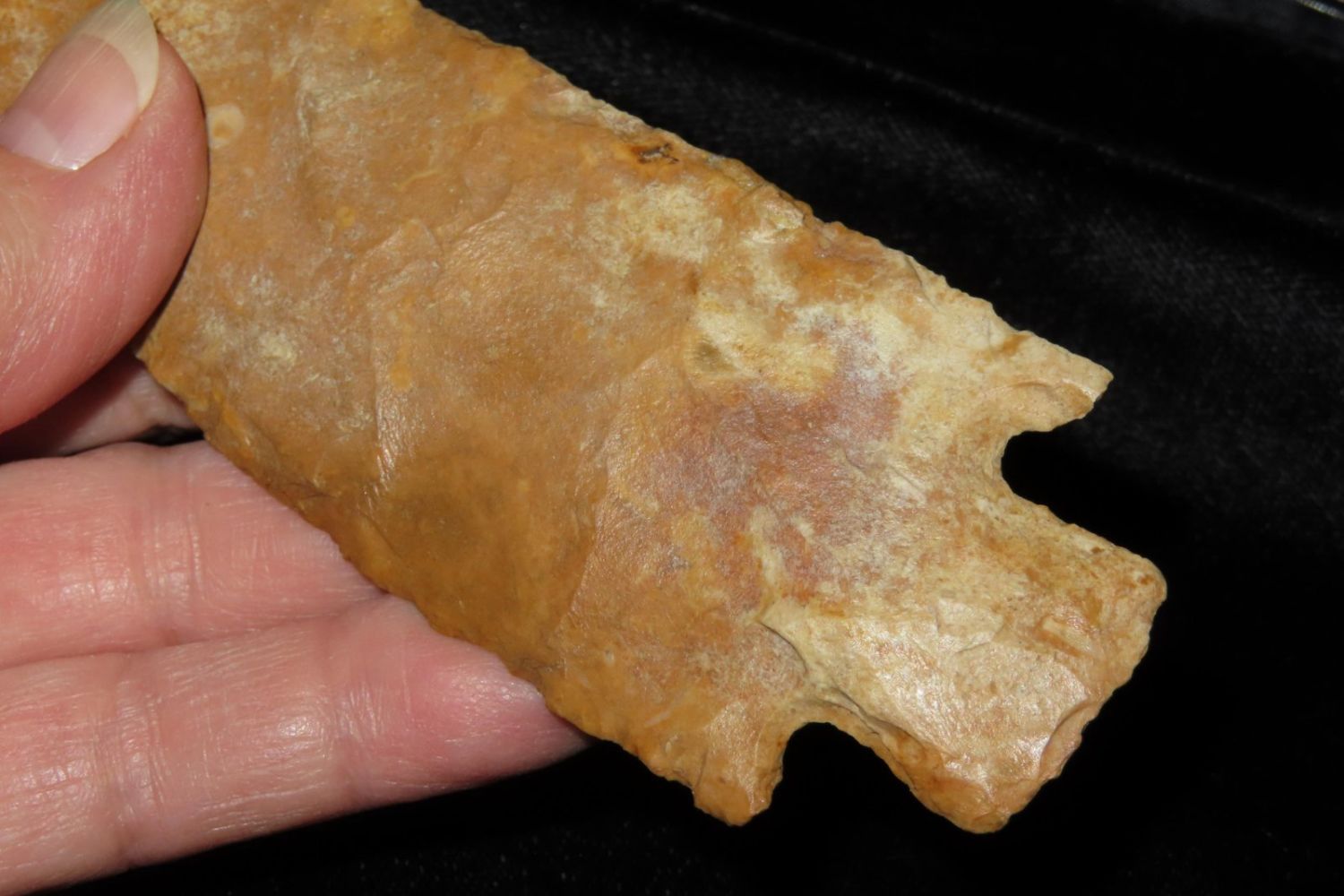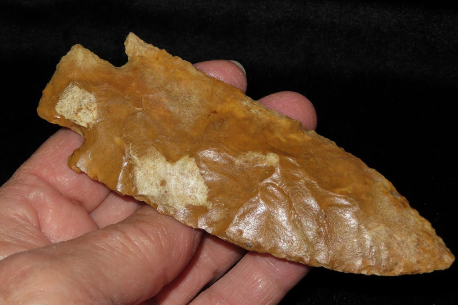 4 5/8" Etley with beautiful creek patina. From the James and Joe George Collection. Joe George was an avid collector and finder of Native American artifacts in the greater St Louis Missouri area. Joe collected his entire life. Upon his passing he turned his collection over to his son James. James was also a very avid collector. He enjoyed walking various waterways and attending artifact shows. James is looking forward to passing down his collection to the relic community for caretaking.