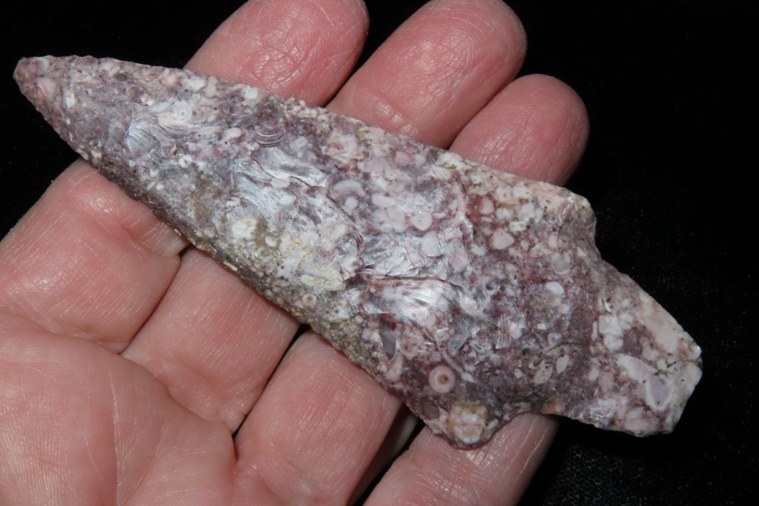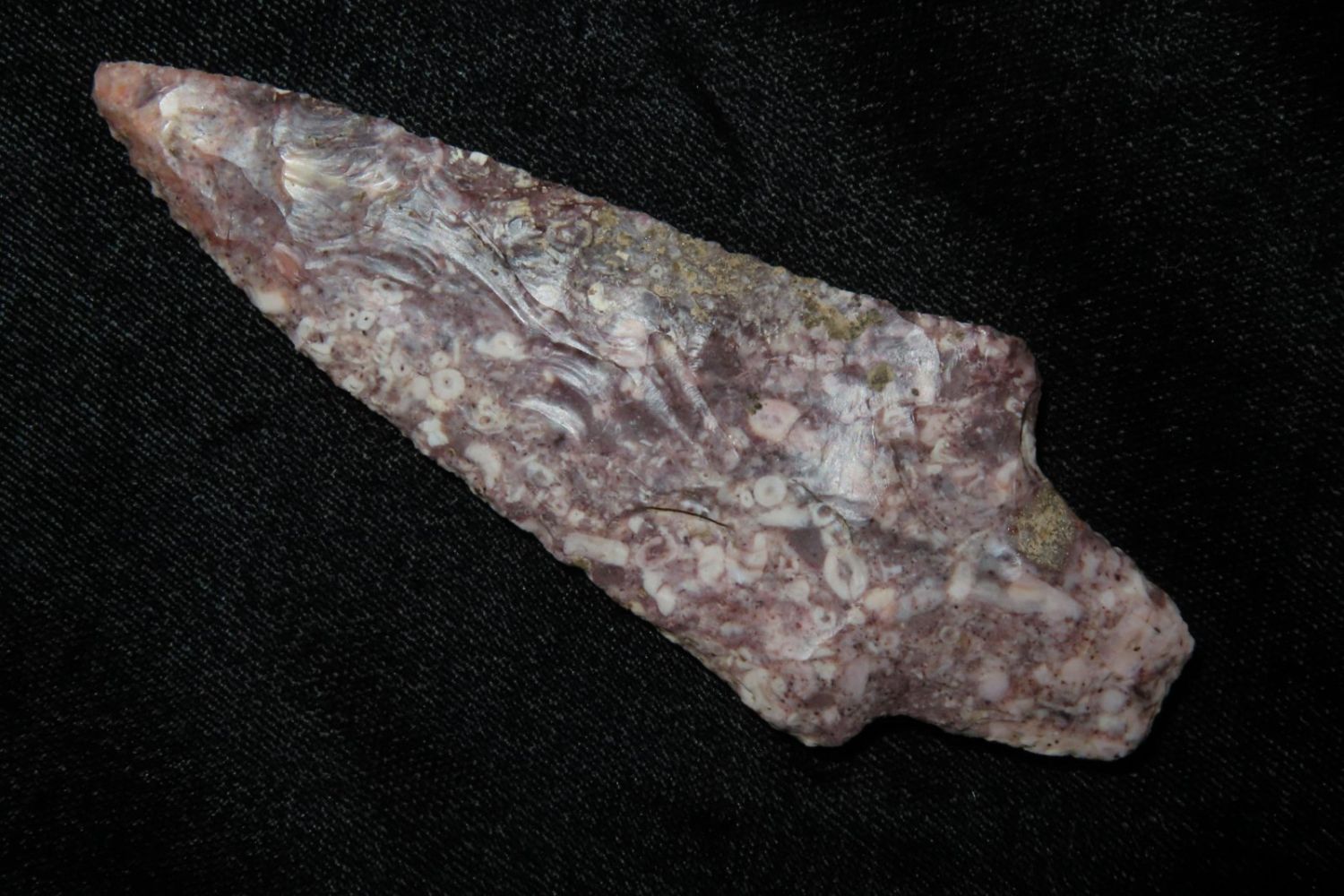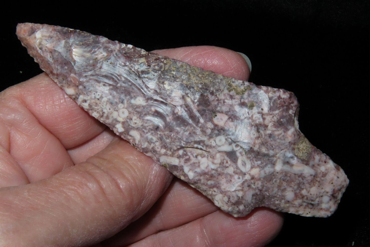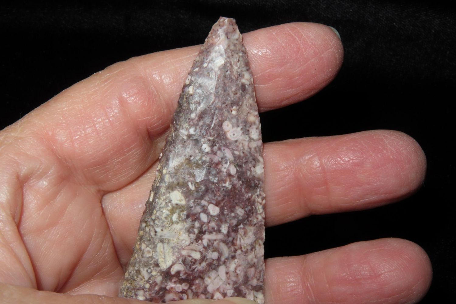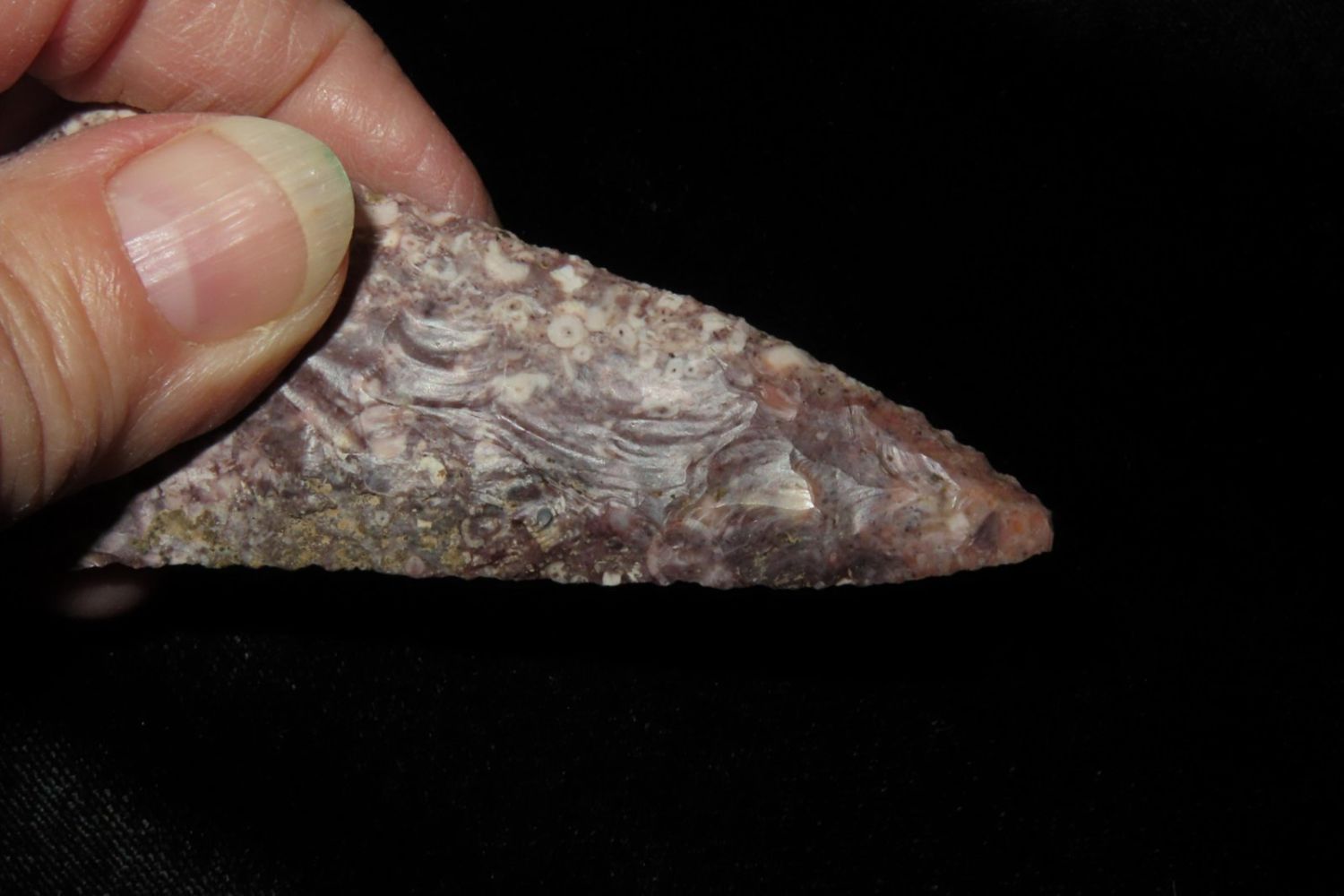 3 7/8" Dickson. Purple and white fossilized Burlington. From the James and Joe George Collection. Joe George was an avid collector and finder of Native American artifacts in the greater St Louis Missouri area. Joe collected his entire life. Upon his passing he turned his collection over to his son James. James was also a very avid collector. He enjoyed walking various waterways and attending artifact shows. James is looking forward to passing down his collection to the relic community for caretaking.
