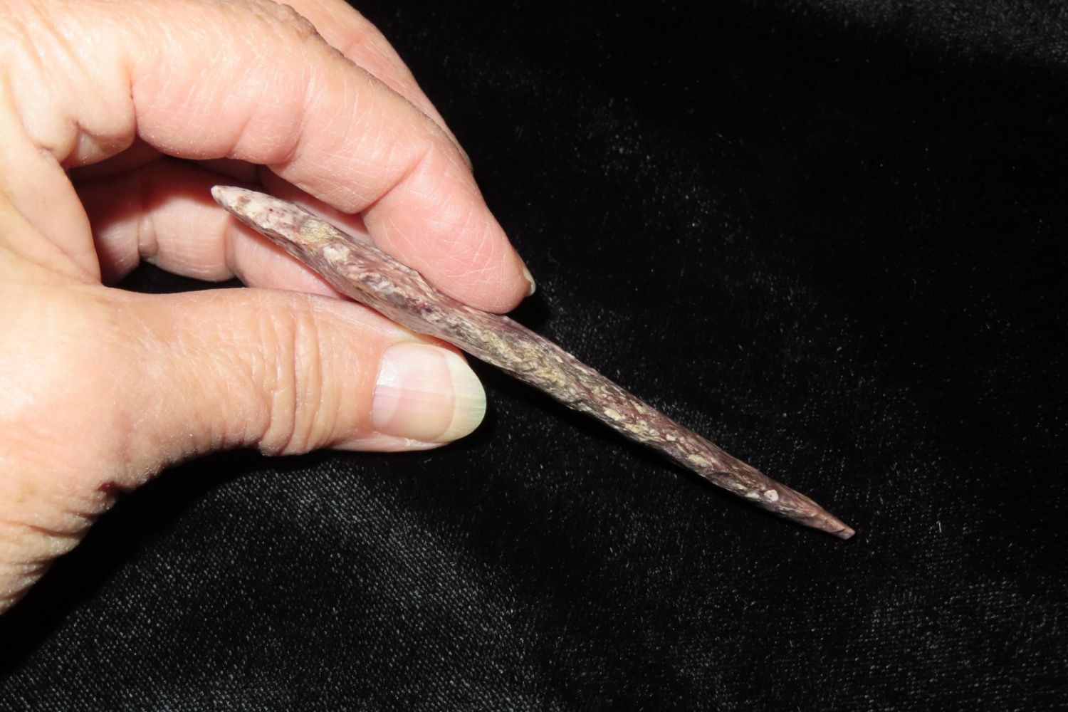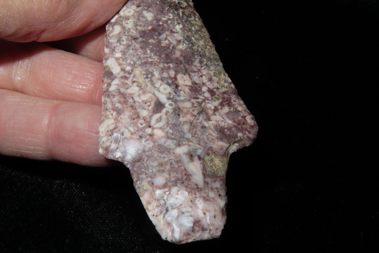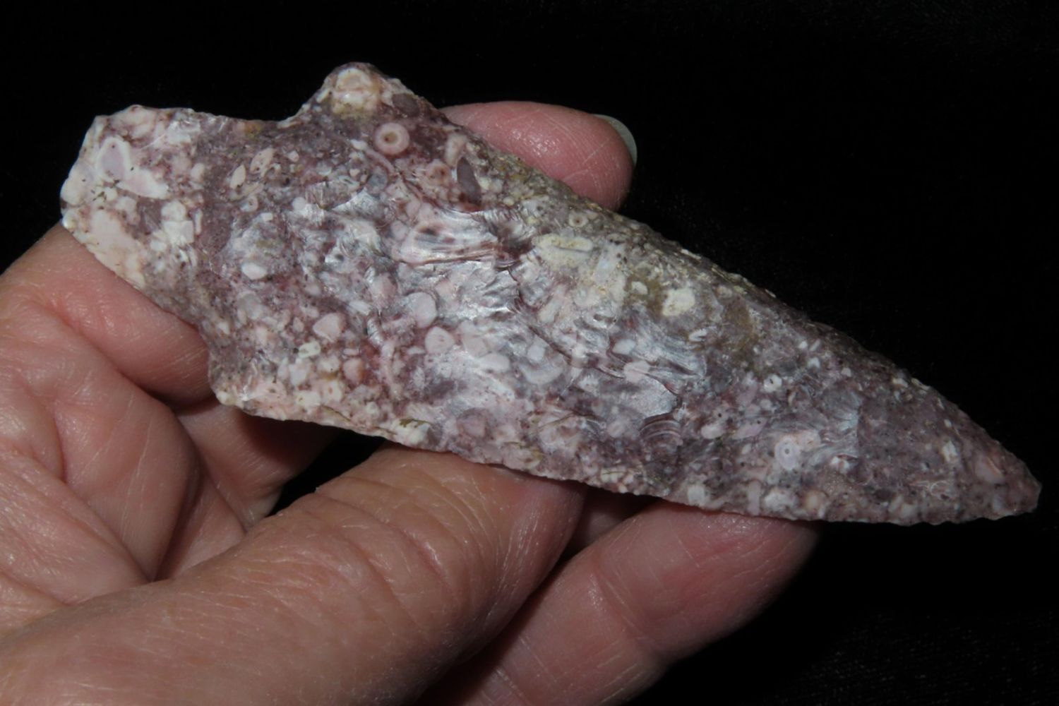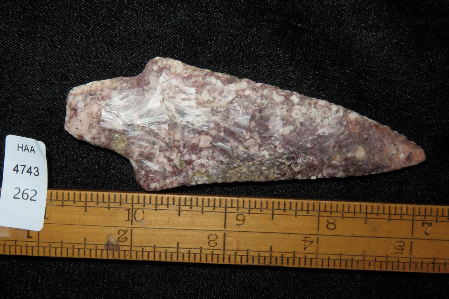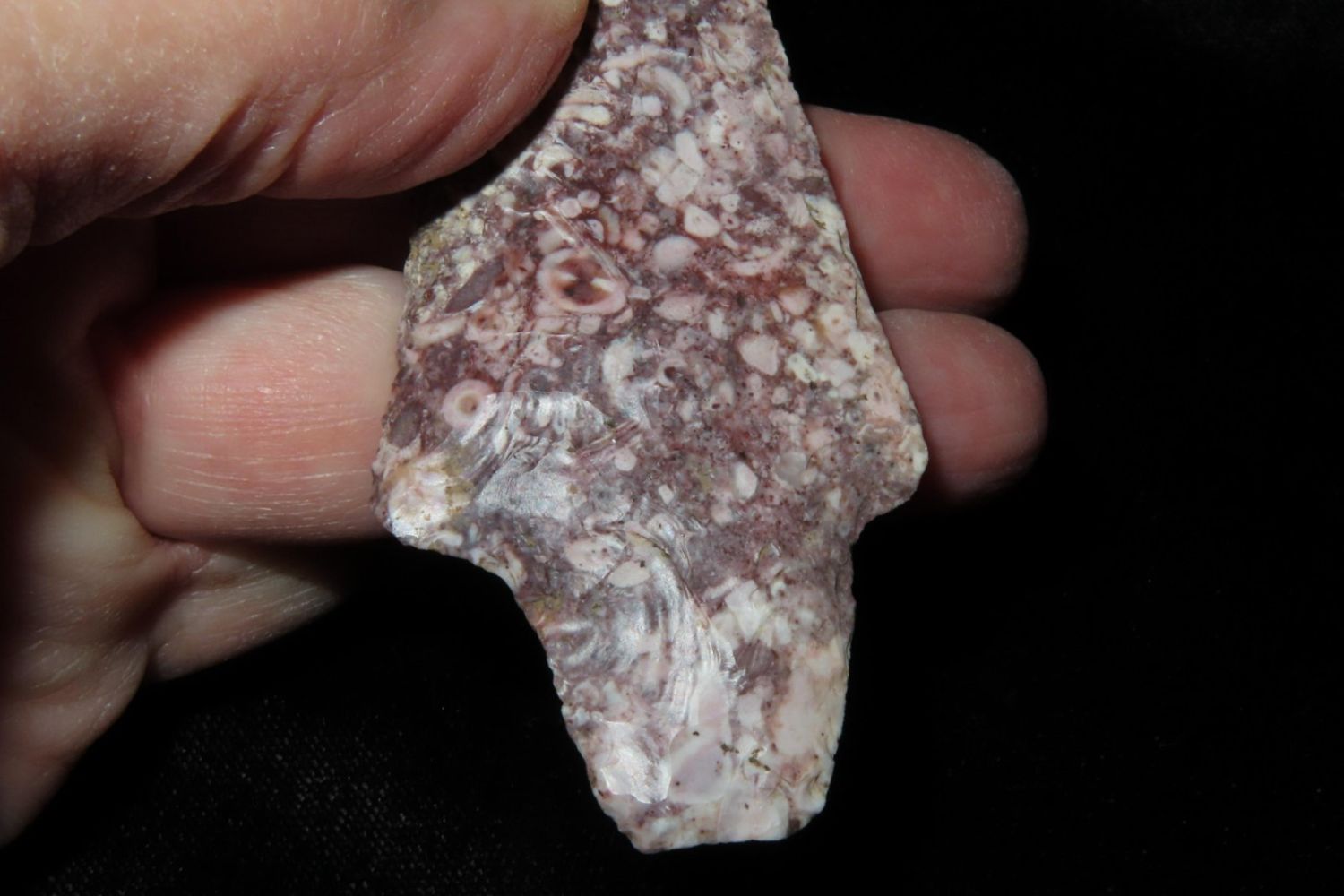 3 7/8" Dickson. Purple and white fossilized Burlington. From the James and Joe George Collection. Joe George was an avid collector and finder of Native American artifacts in the greater St Louis Missouri area. Joe collected his entire life. Upon his passing he turned his collection over to his son James. James was also a very avid collector. He enjoyed walking various waterways and attending artifact shows. James is looking forward to passing down his collection to the relic community for caretaking.