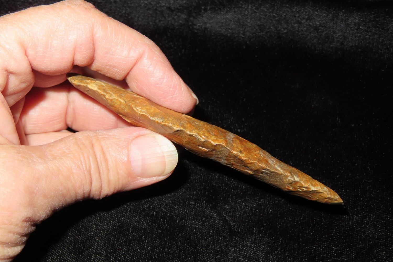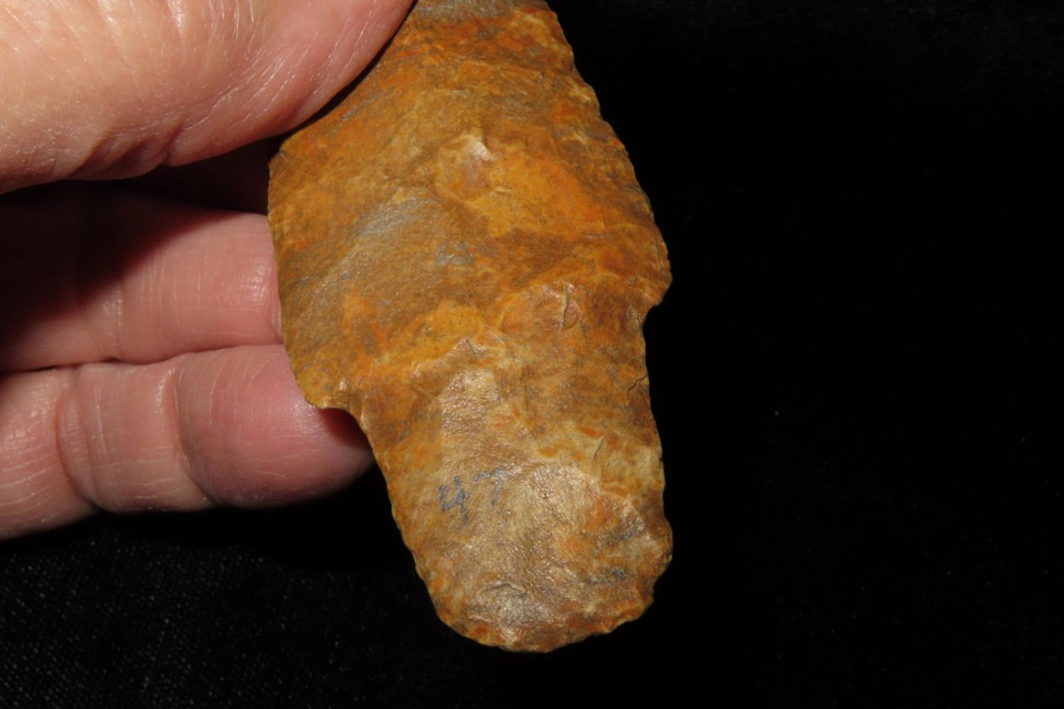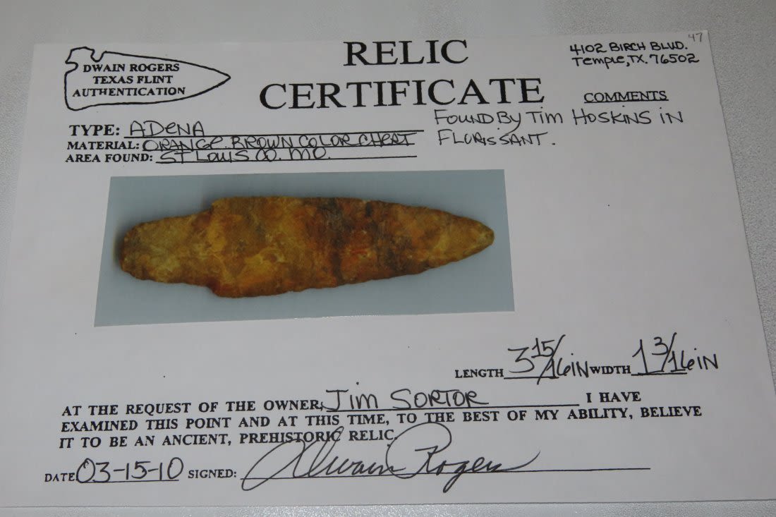 3 15/16" Adena. Rogers COA. Found by Tim Hoskins in Florrisant, MO. Ex Jim Sortor. From the James and Joe George Collection. Joe George was an avid collector and finder of Native American artifacts in the greater St Louis Missouri area. Joe collected his entire life. Upon his passing he turned his collection over to his son James. James was also a very avid collector. He enjoyed walking various waterways and attending artifact shows. James is looking forward to passing down his collection to the relic community for caretaking.