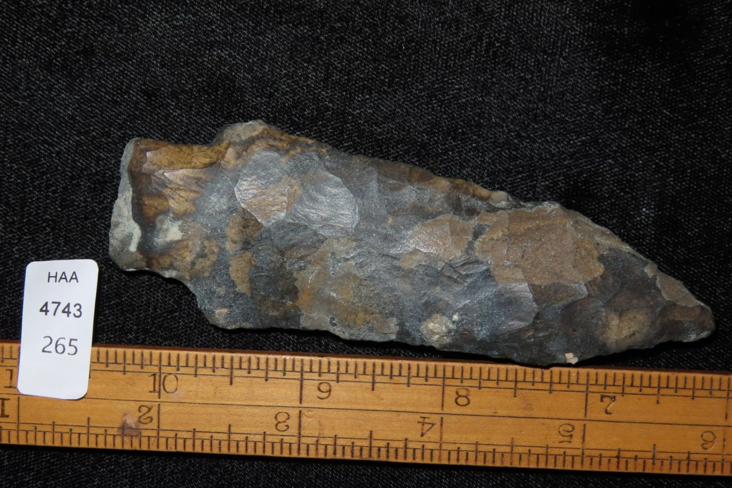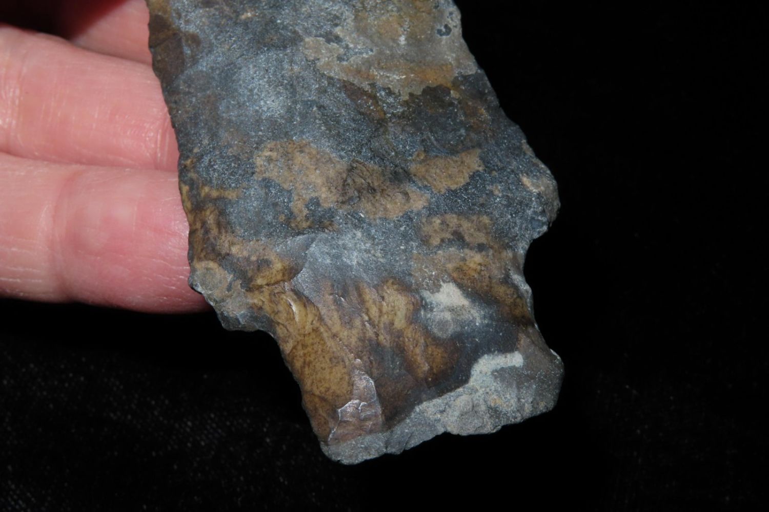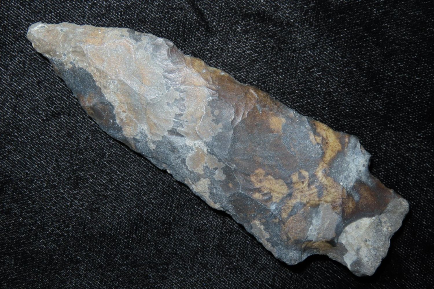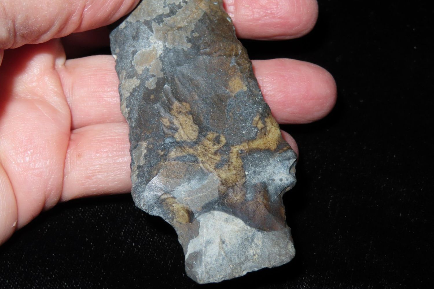 4 1/4" Etley. Amazing multi color material. From the James and Joe George Collection. Joe George was an avid collector and finder of Native American artifacts in the greater St Louis Missouri area. Joe collected his entire life. Upon his passing he turned his collection over to his son James. James was also a very avid collector. He enjoyed walking various waterways and attending artifact shows. James is looking forward to passing down his collection to the relic community for caretaking.