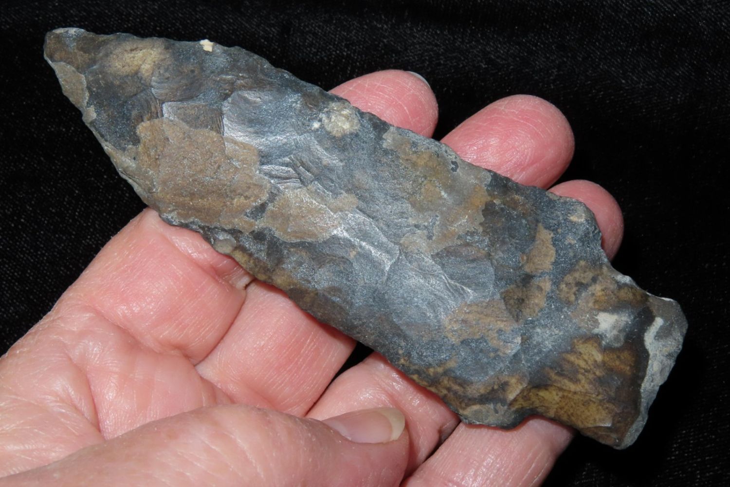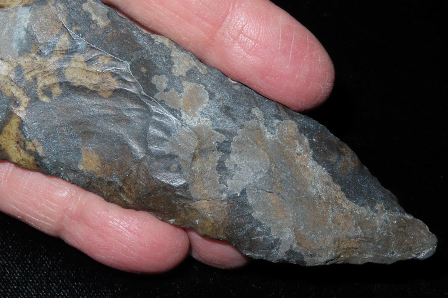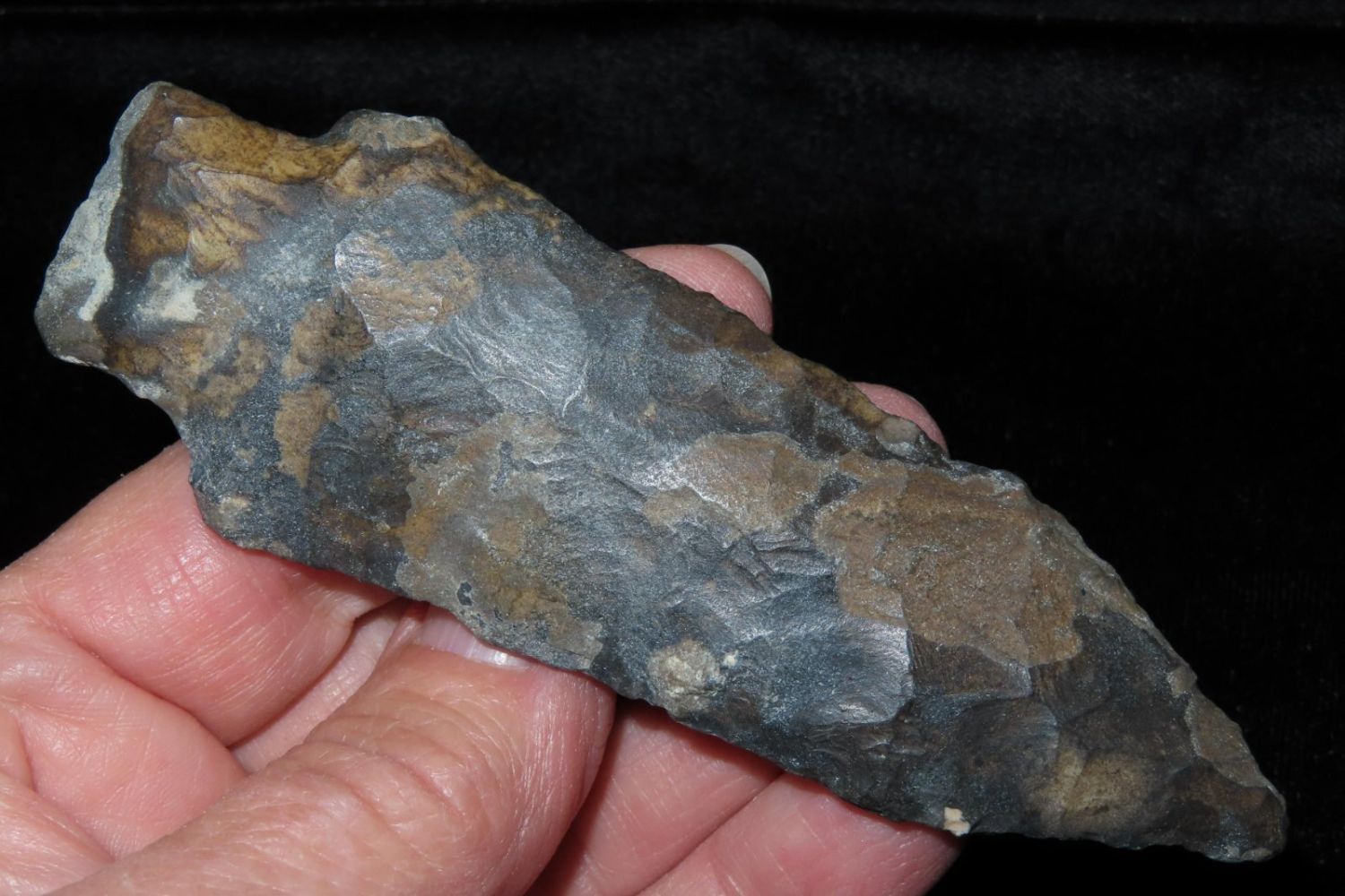 4 1/4" Etley. Amazing multi color material. From the James and Joe George Collection. Joe George was an avid collector and finder of Native American artifacts in the greater St Louis Missouri area. Joe collected his entire life. Upon his passing he turned his collection over to his son James. James was also a very avid collector. He enjoyed walking various waterways and attending artifact shows. James is looking forward to passing down his collection to the relic community for caretaking.