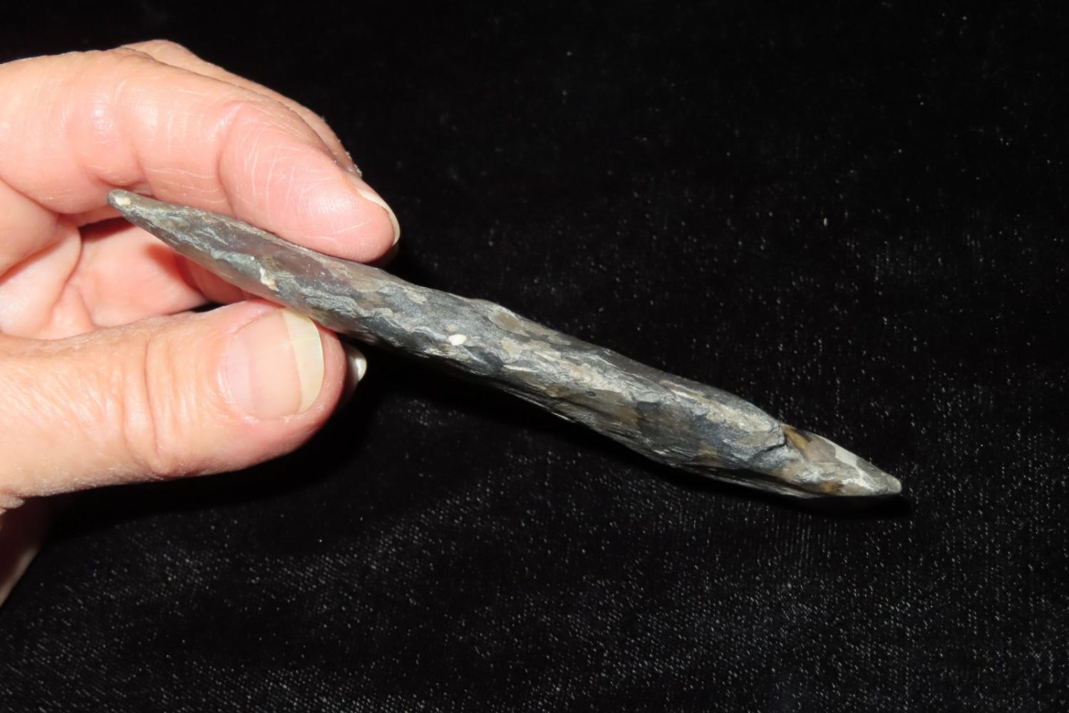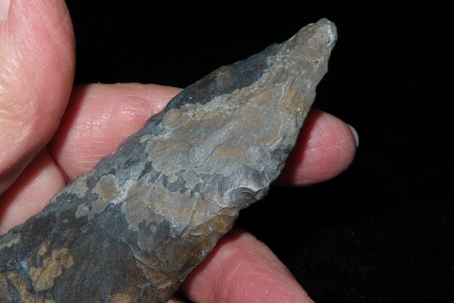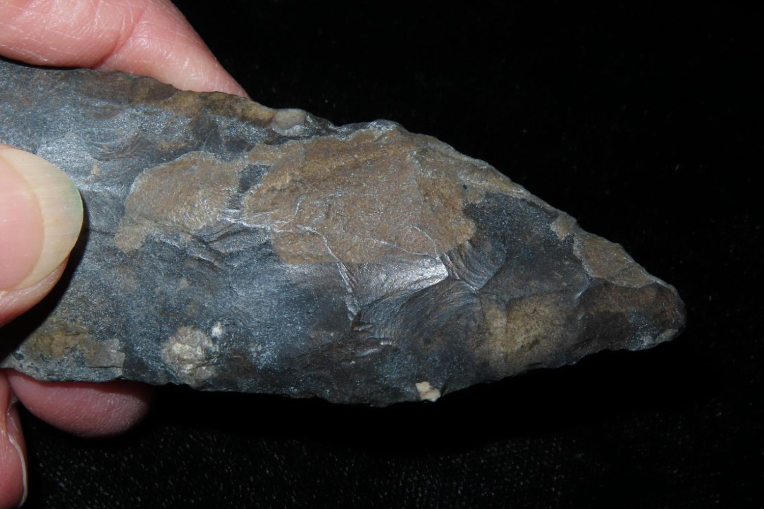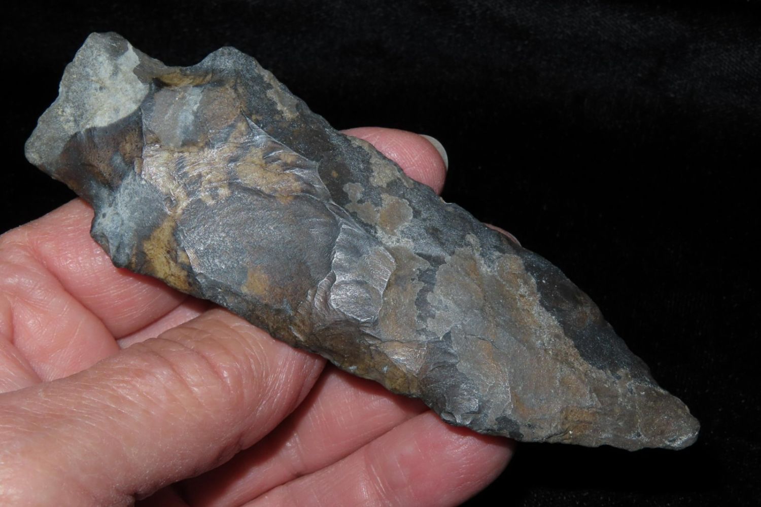 4 1/4" Etley. Amazing multi color material. From the James and Joe George Collection. Joe George was an avid collector and finder of Native American artifacts in the greater St Louis Missouri area. Joe collected his entire life. Upon his passing he turned his collection over to his son James. James was also a very avid collector. He enjoyed walking various waterways and attending artifact shows. James is looking forward to passing down his collection to the relic community for caretaking.