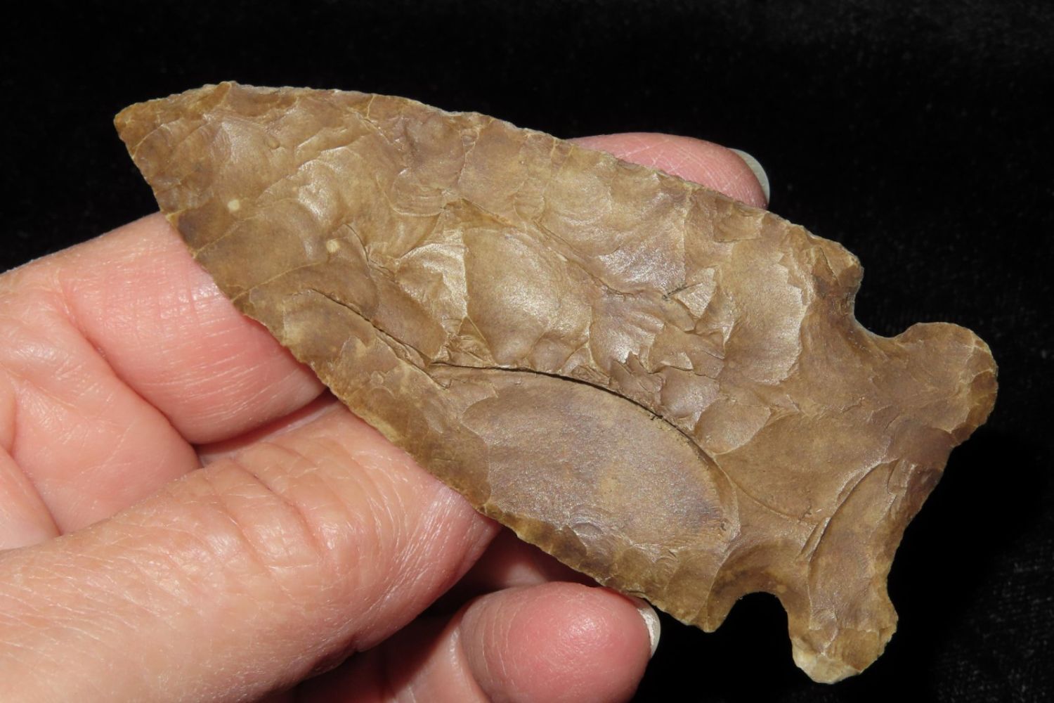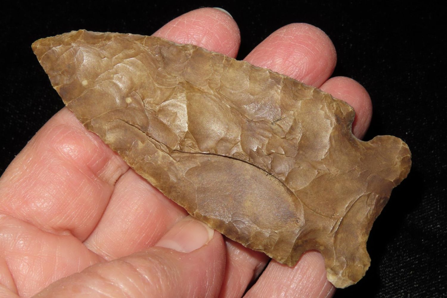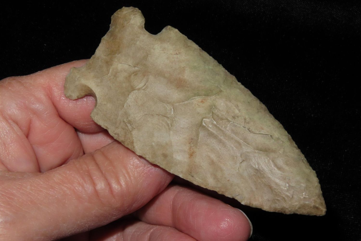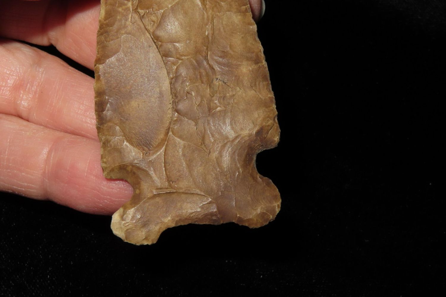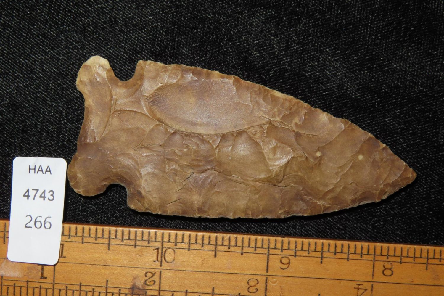 3 1/4" Hemphill. From the James and Joe George Collection. Joe George was an avid collector and finder of Native American artifacts in the greater St Louis Missouri area. Joe collected his entire life. Upon his passing he turned his collection over to his son James. James was also a very avid collector. He enjoyed walking various waterways and attending artifact shows. James is looking forward to passing down his collection to the relic community for caretaking.