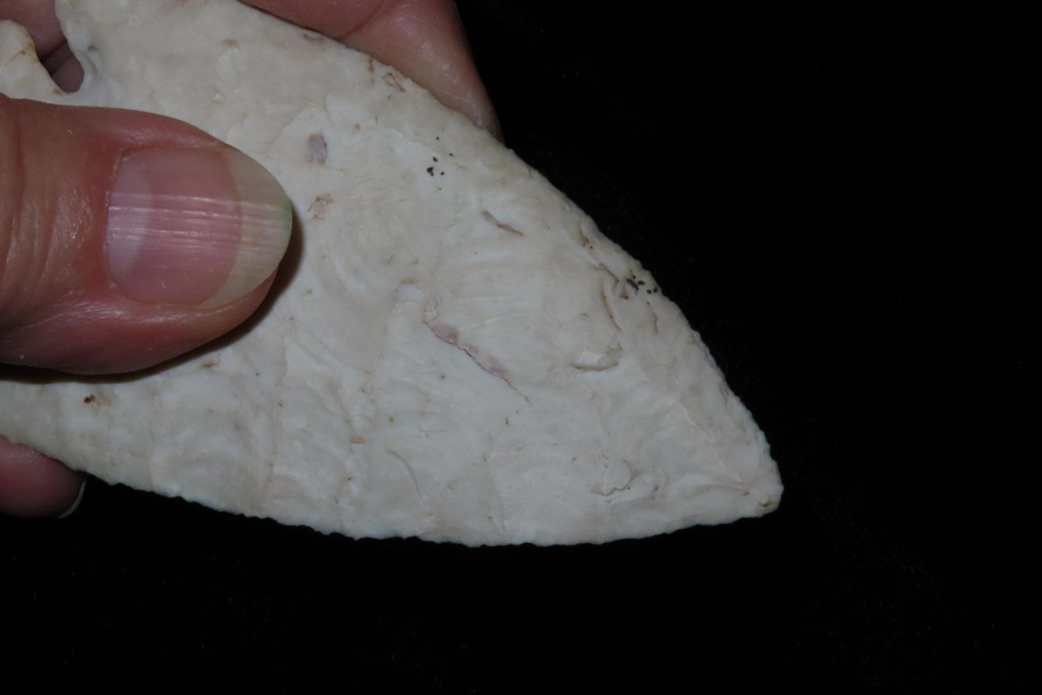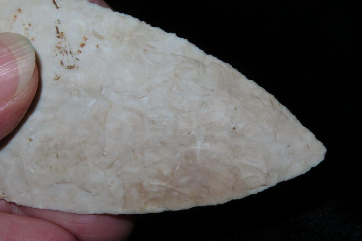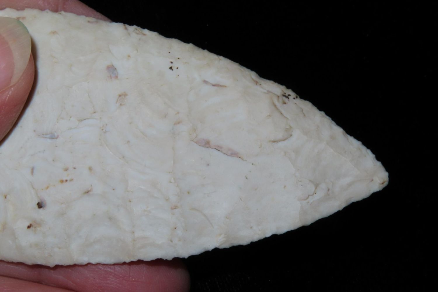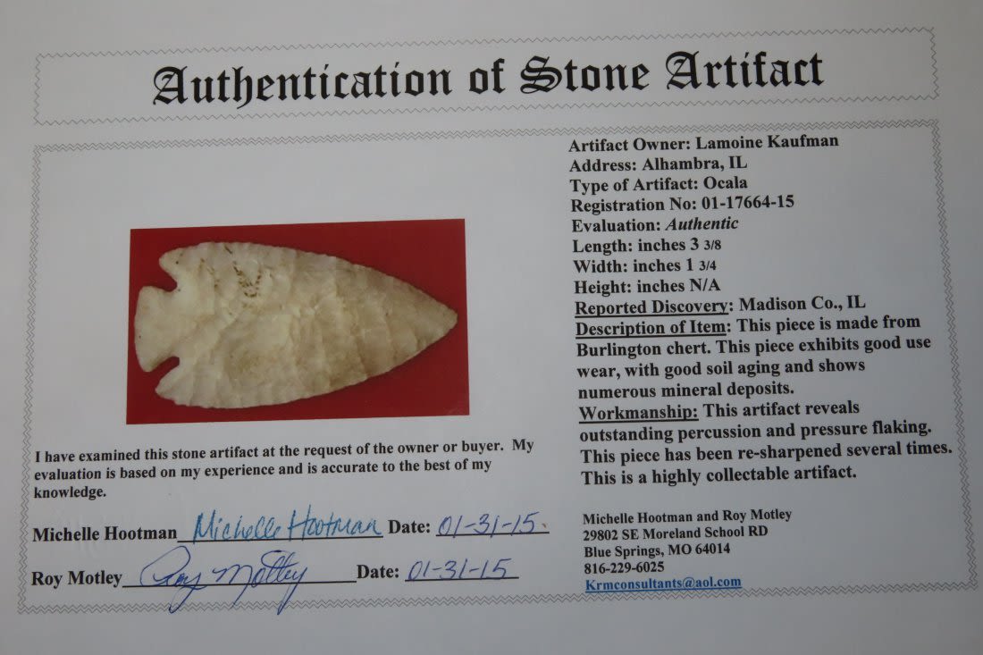 3 3/8" Ocala/Hardove. Motley COA. Found in Madison County, IL. From the James and Joe George Collection. Joe George was an avid collector and finder of Native American artifacts in the greater St Louis Missouri area. Joe collected his entire life. Upon his passing he turned his collection over to his son James. James was also a very avid collector. He enjoyed walking various waterways and attending artifact shows. James is looking forward to passing down his collection to the relic community for caretaking.