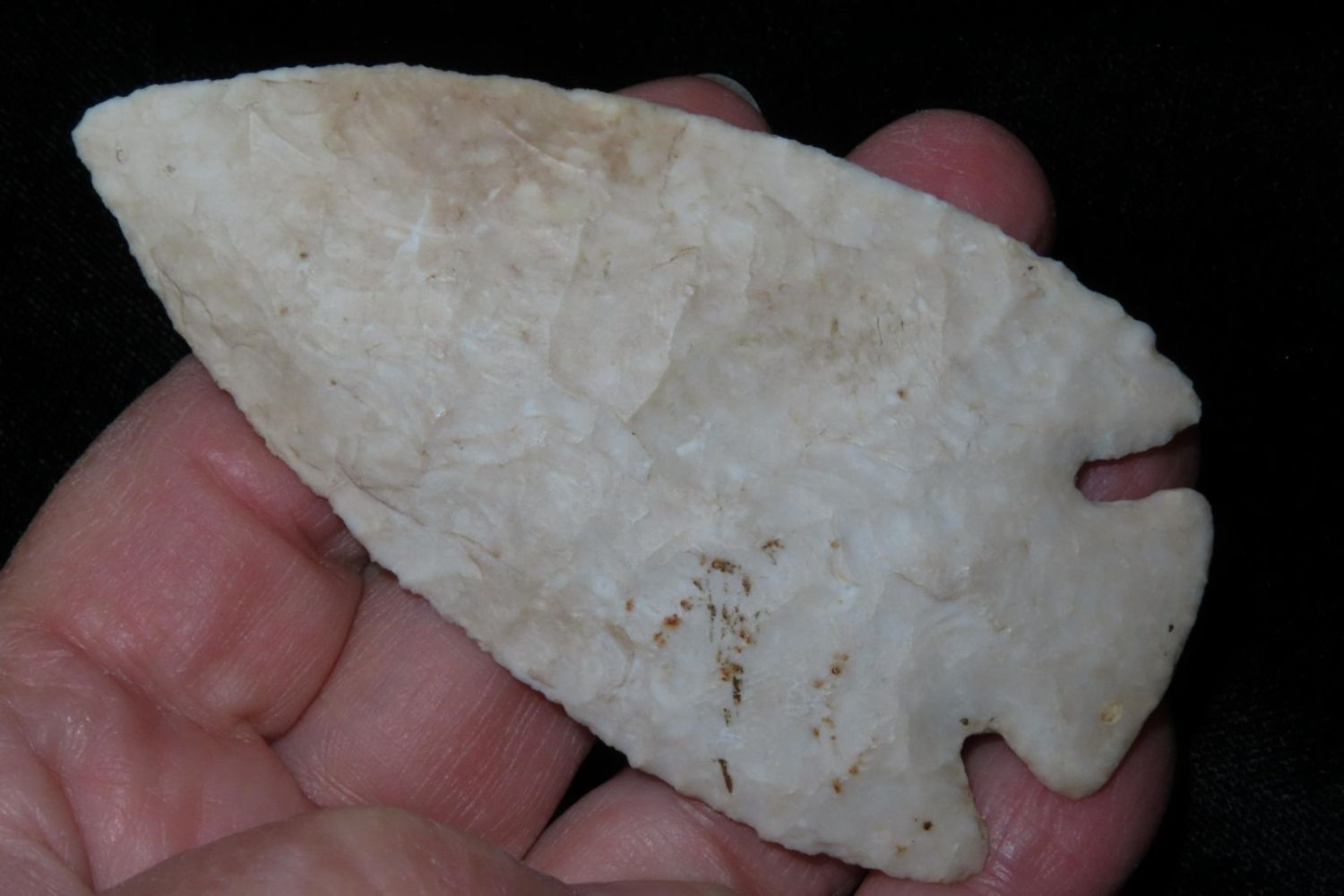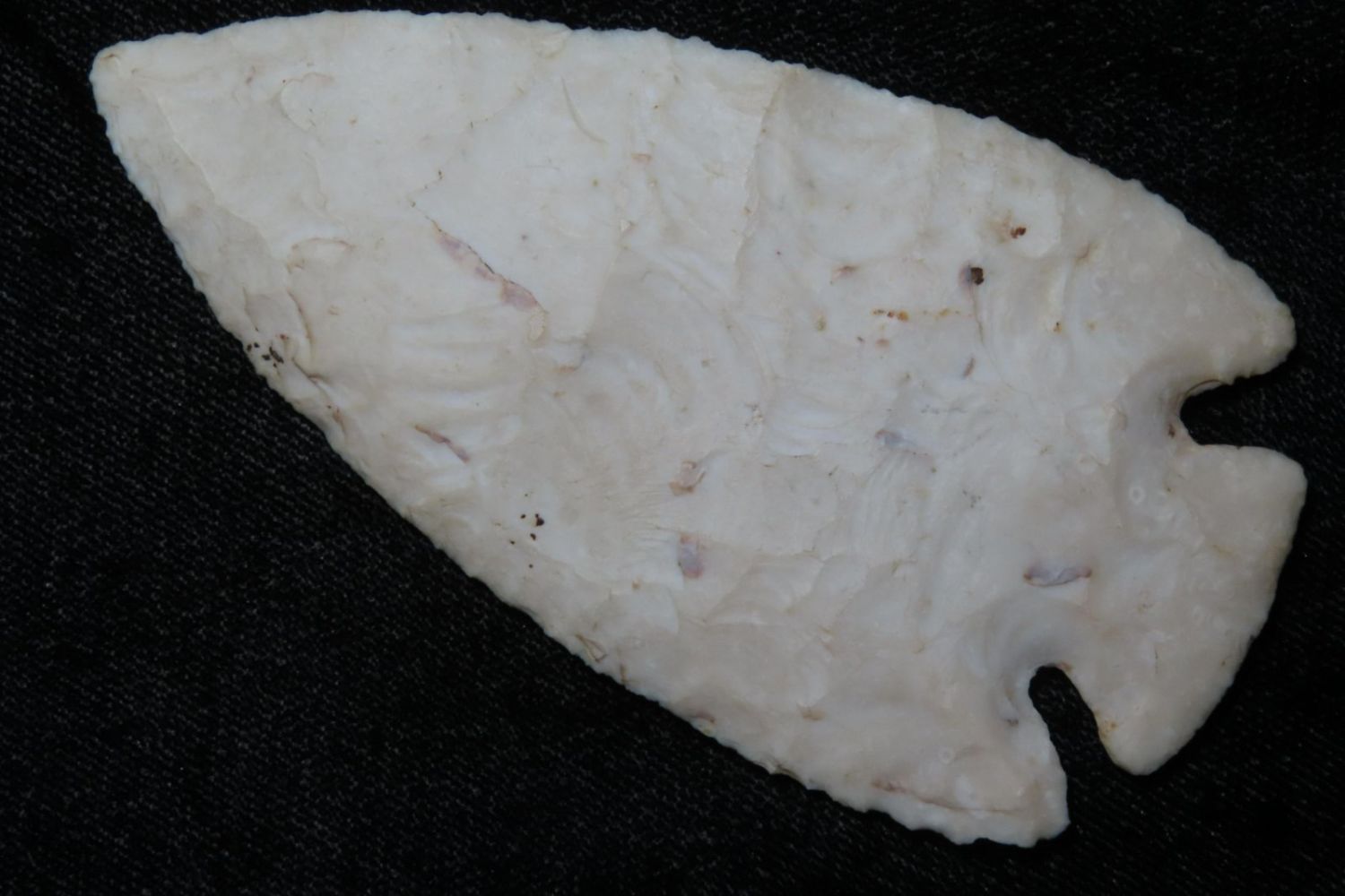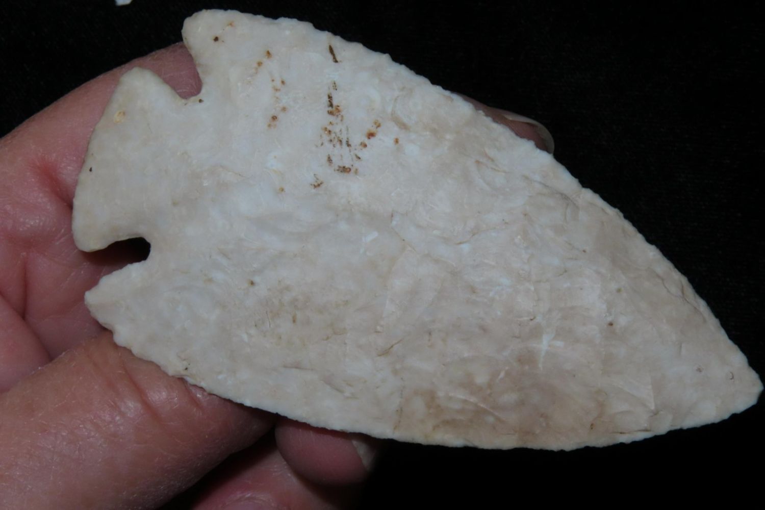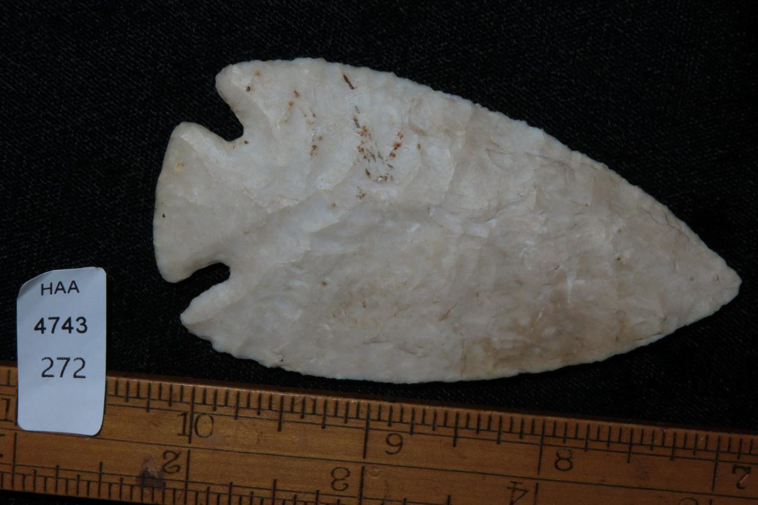 3 3/8" Ocala/Hardove. Motley COA. Found in Madison County, IL. From the James and Joe George Collection. Joe George was an avid collector and finder of Native American artifacts in the greater St Louis Missouri area. Joe collected his entire life. Upon his passing he turned his collection over to his son James. James was also a very avid collector. He enjoyed walking various waterways and attending artifact shows. James is looking forward to passing down his collection to the relic community for caretaking.