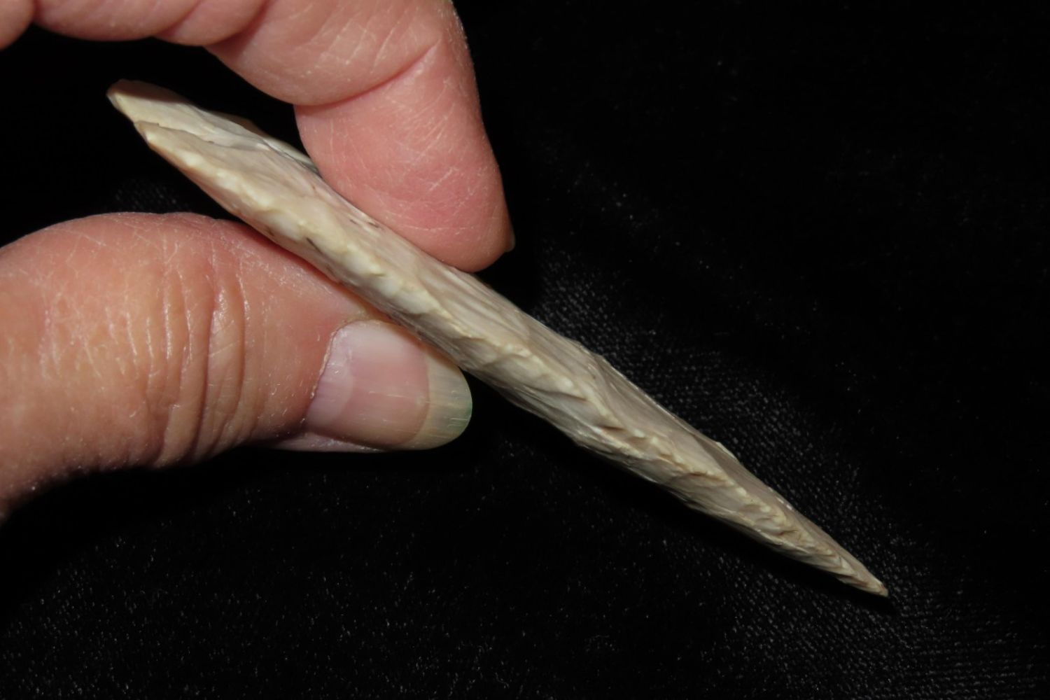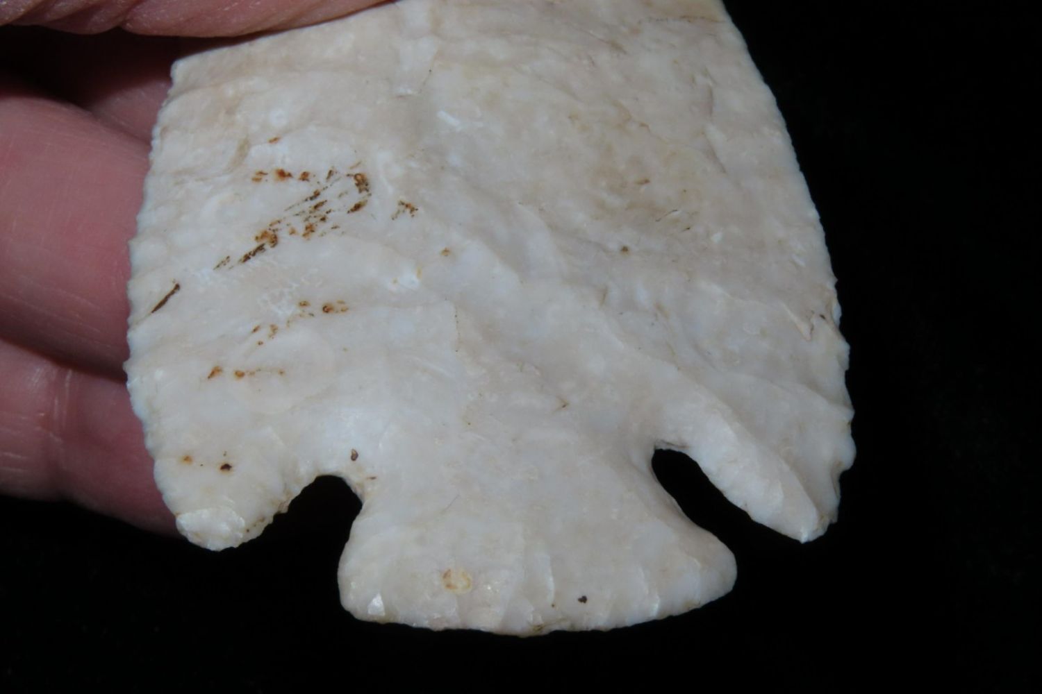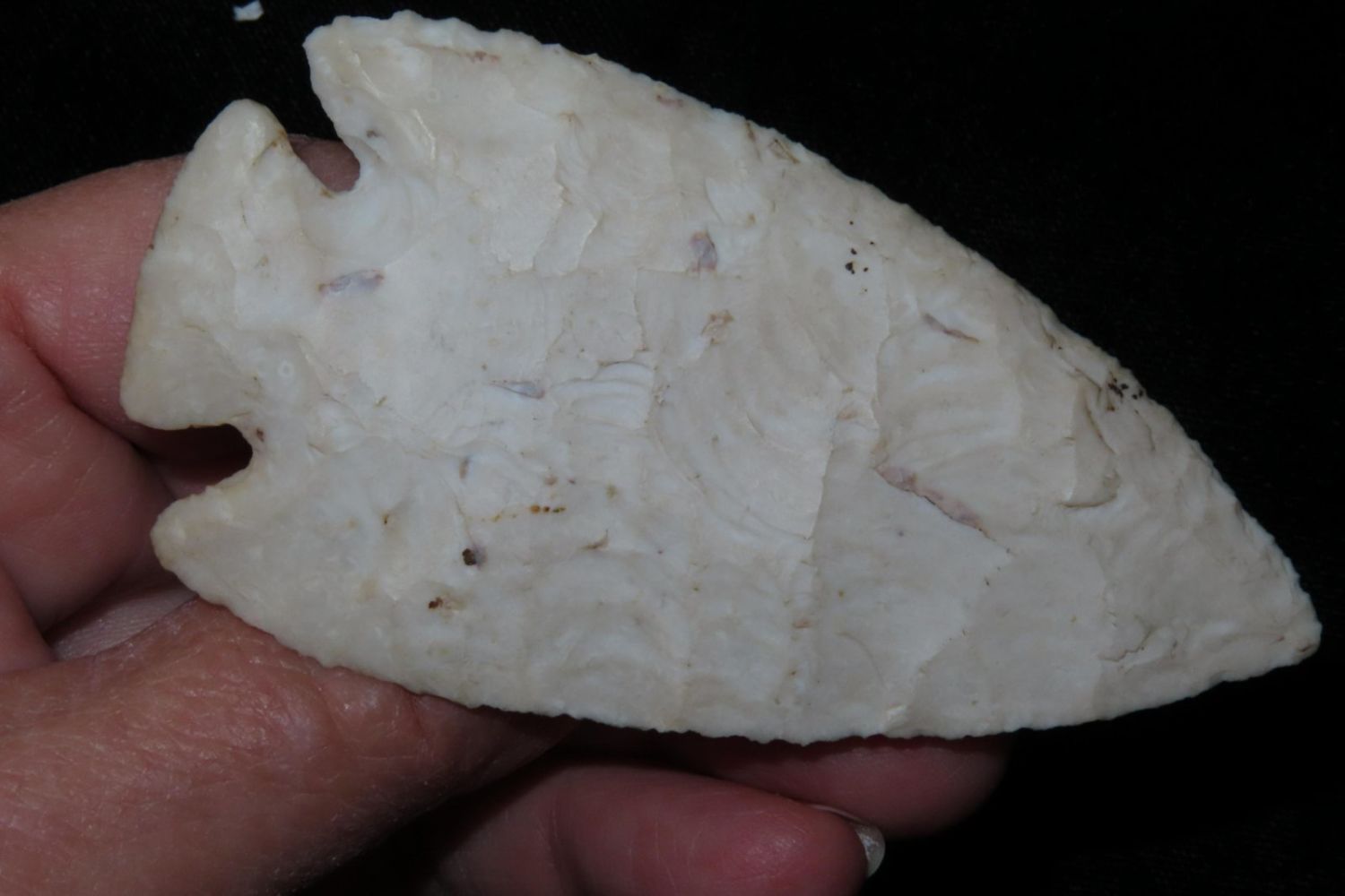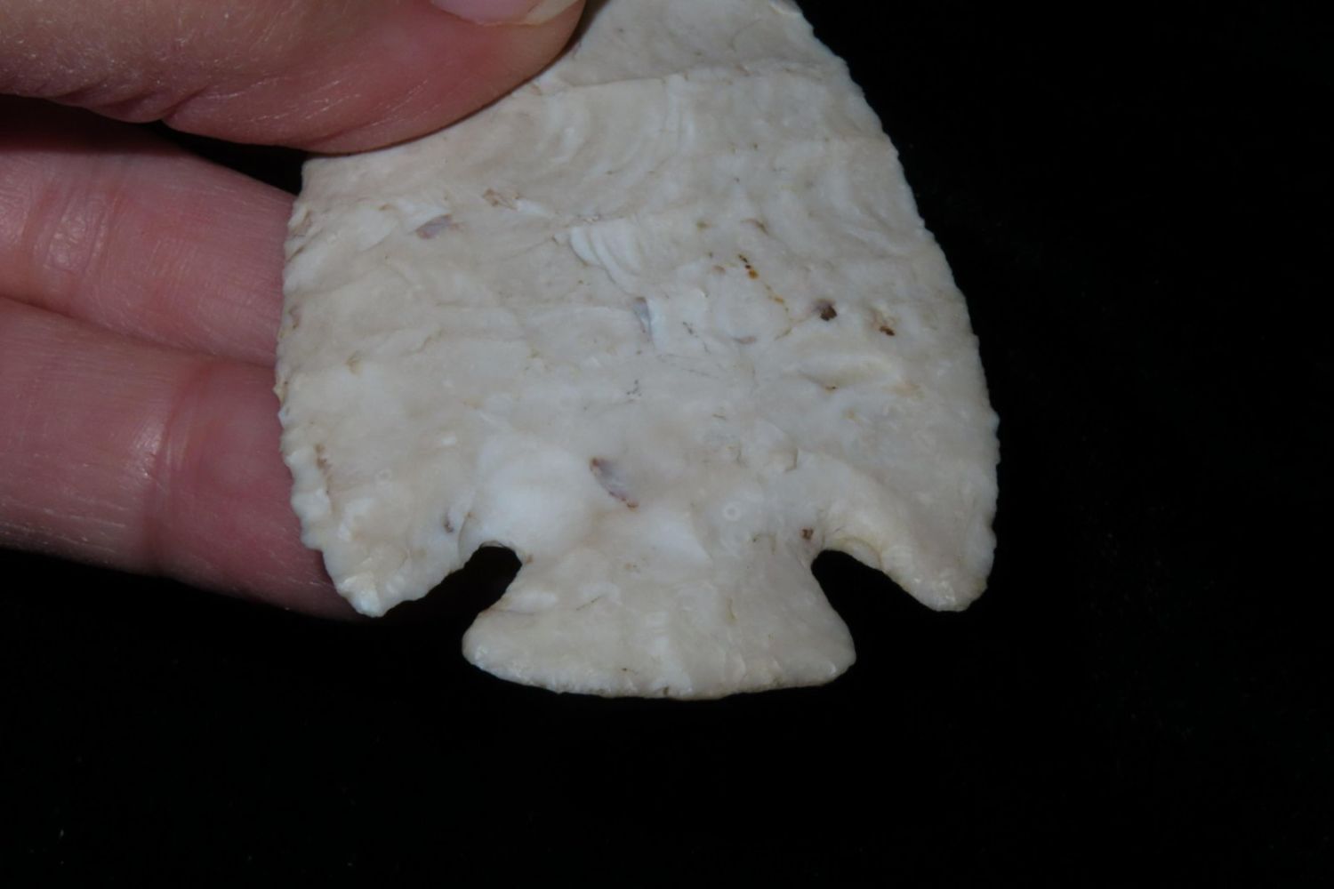 3 3/8" Ocala/Hardove. Motley COA. Found in Madison County, IL. From the James and Joe George Collection. Joe George was an avid collector and finder of Native American artifacts in the greater St Louis Missouri area. Joe collected his entire life. Upon his passing he turned his collection over to his son James. James was also a very avid collector. He enjoyed walking various waterways and attending artifact shows. James is looking forward to passing down his collection to the relic community for caretaking.