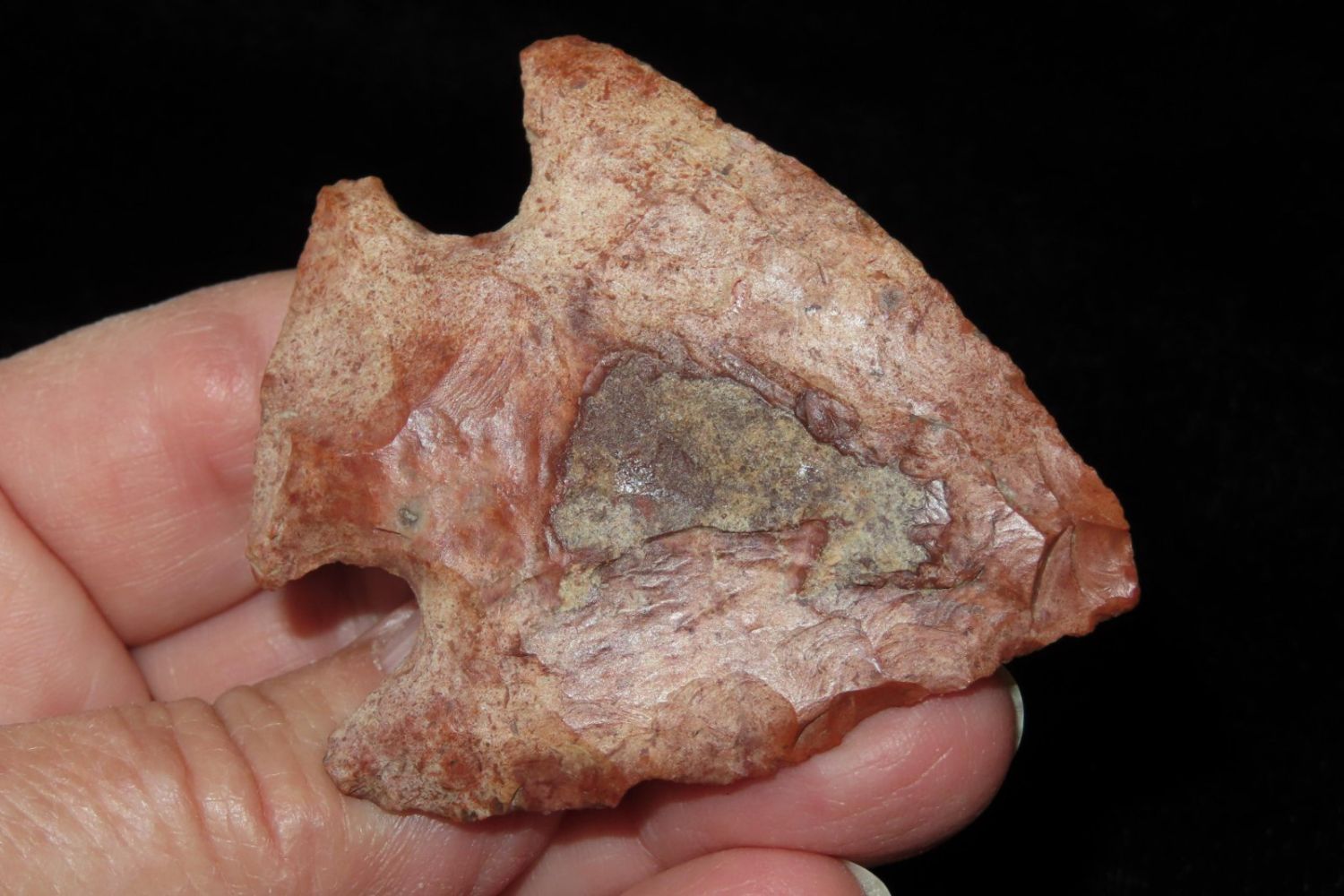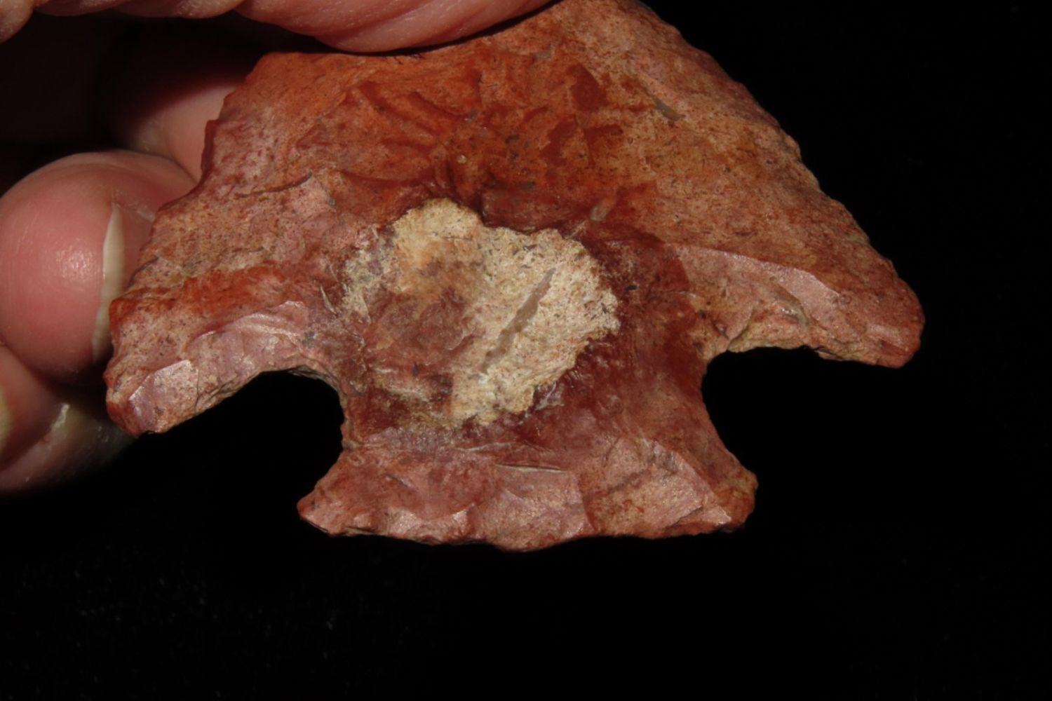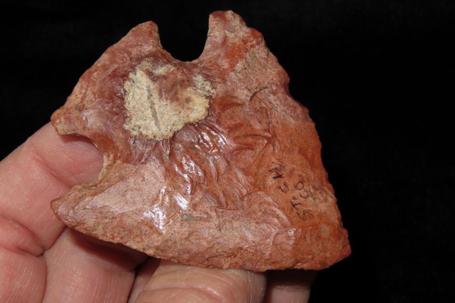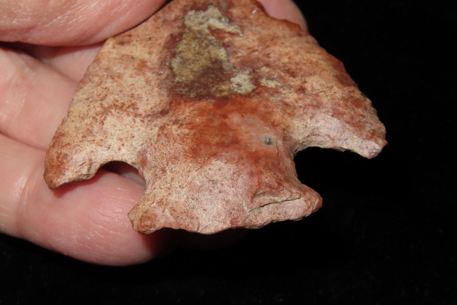 2 3/8" Snyders. Found in St. Charles County, MO. Wonderful color. From the James and Joe George Collection. Joe George was an avid collector and finder of Native American artifacts in the greater St Louis Missouri area. Joe collected his entire life. Upon his passing he turned his collection over to his son James. James was also a very avid collector. He enjoyed walking various waterways and attending artifact shows. James is looking forward to passing down his collection to the relic community for caretaking.