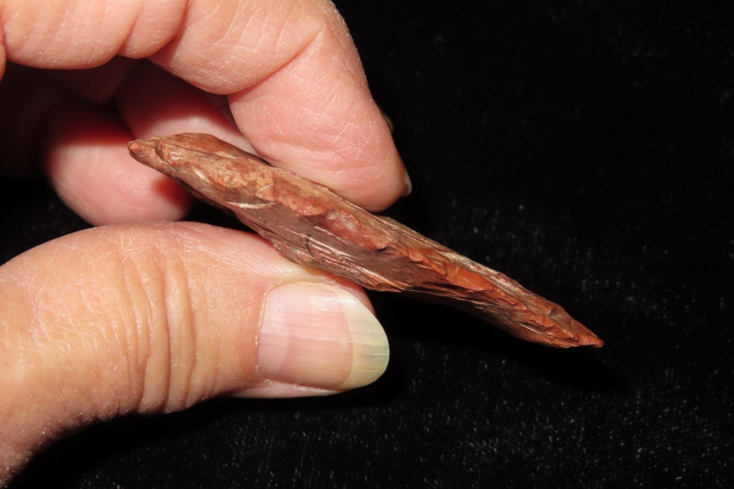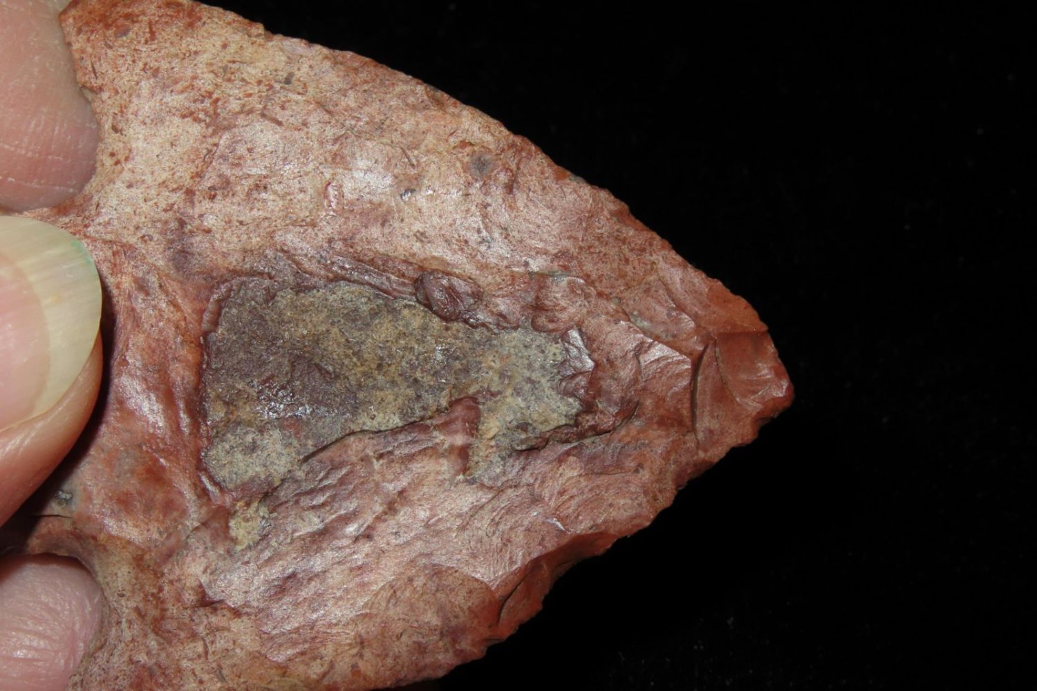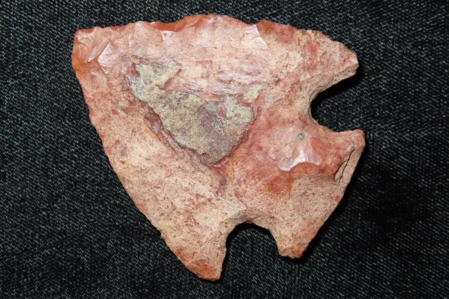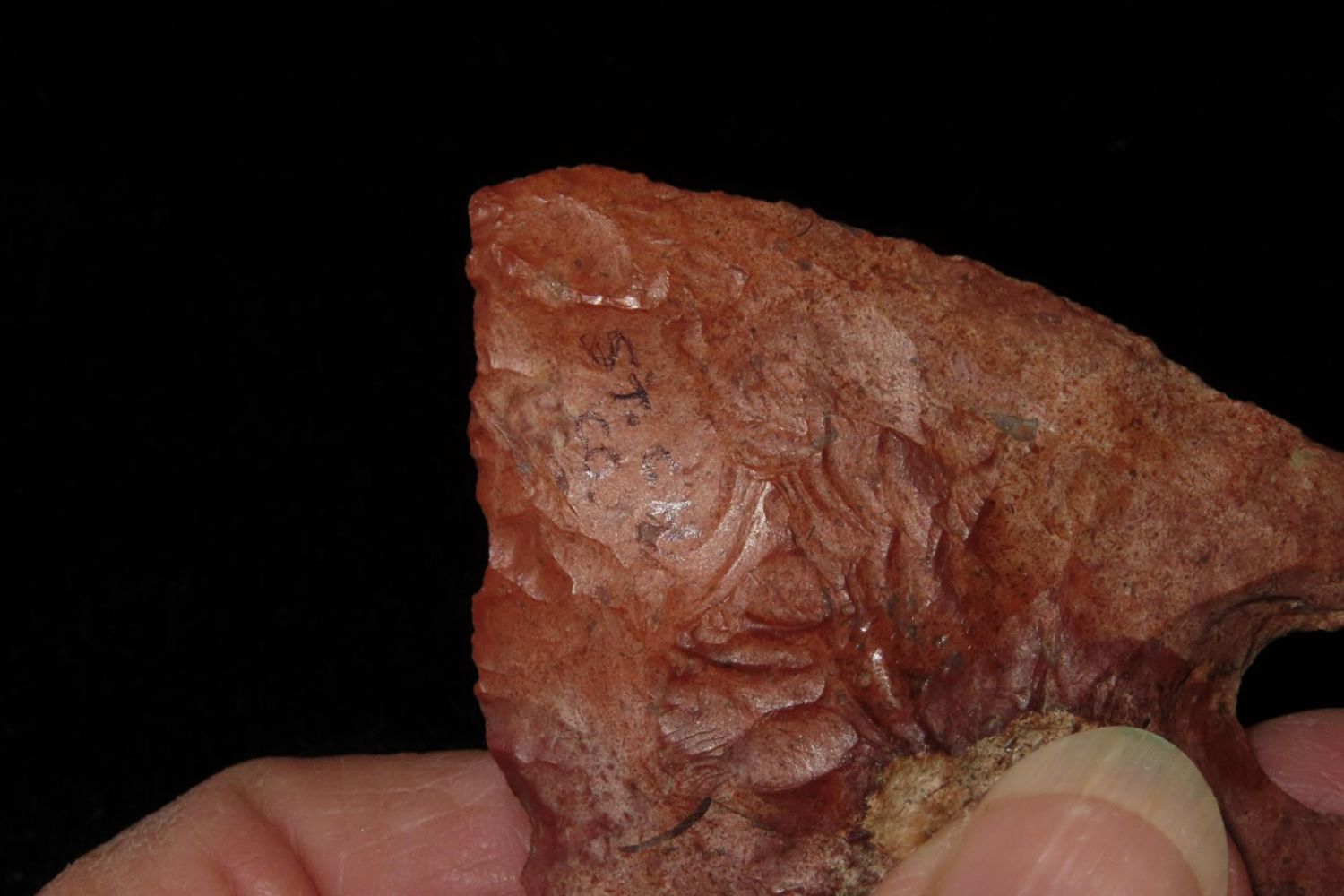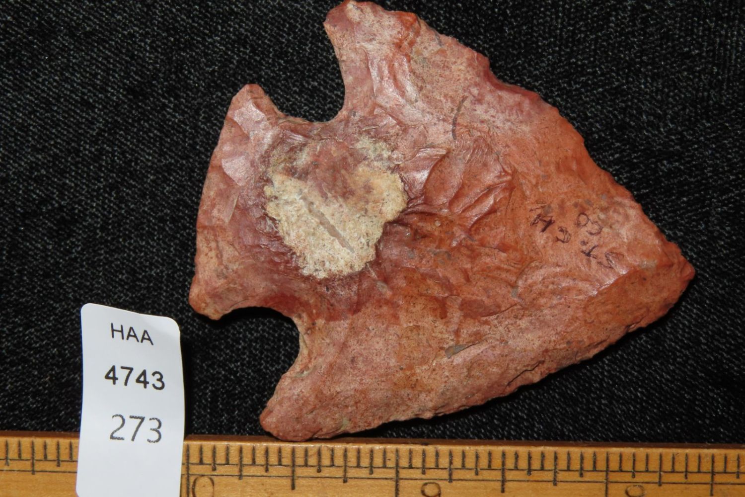 2 3/8" Snyders. Found in St. Charles County, MO. Wonderful color. From the James and Joe George Collection. Joe George was an avid collector and finder of Native American artifacts in the greater St Louis Missouri area. Joe collected his entire life. Upon his passing he turned his collection over to his son James. James was also a very avid collector. He enjoyed walking various waterways and attending artifact shows. James is looking forward to passing down his collection to the relic community for caretaking.
