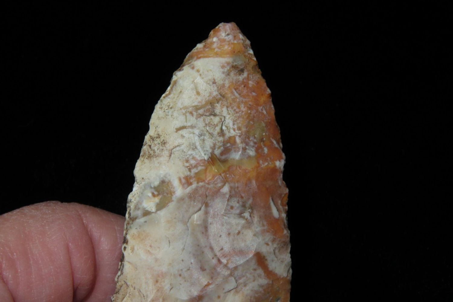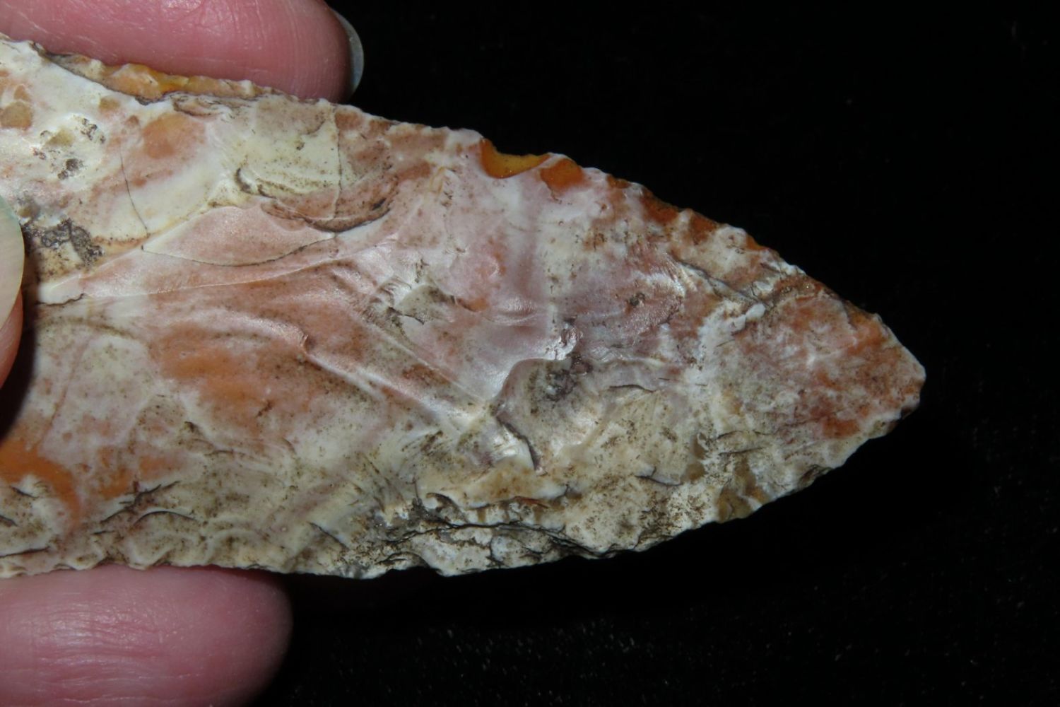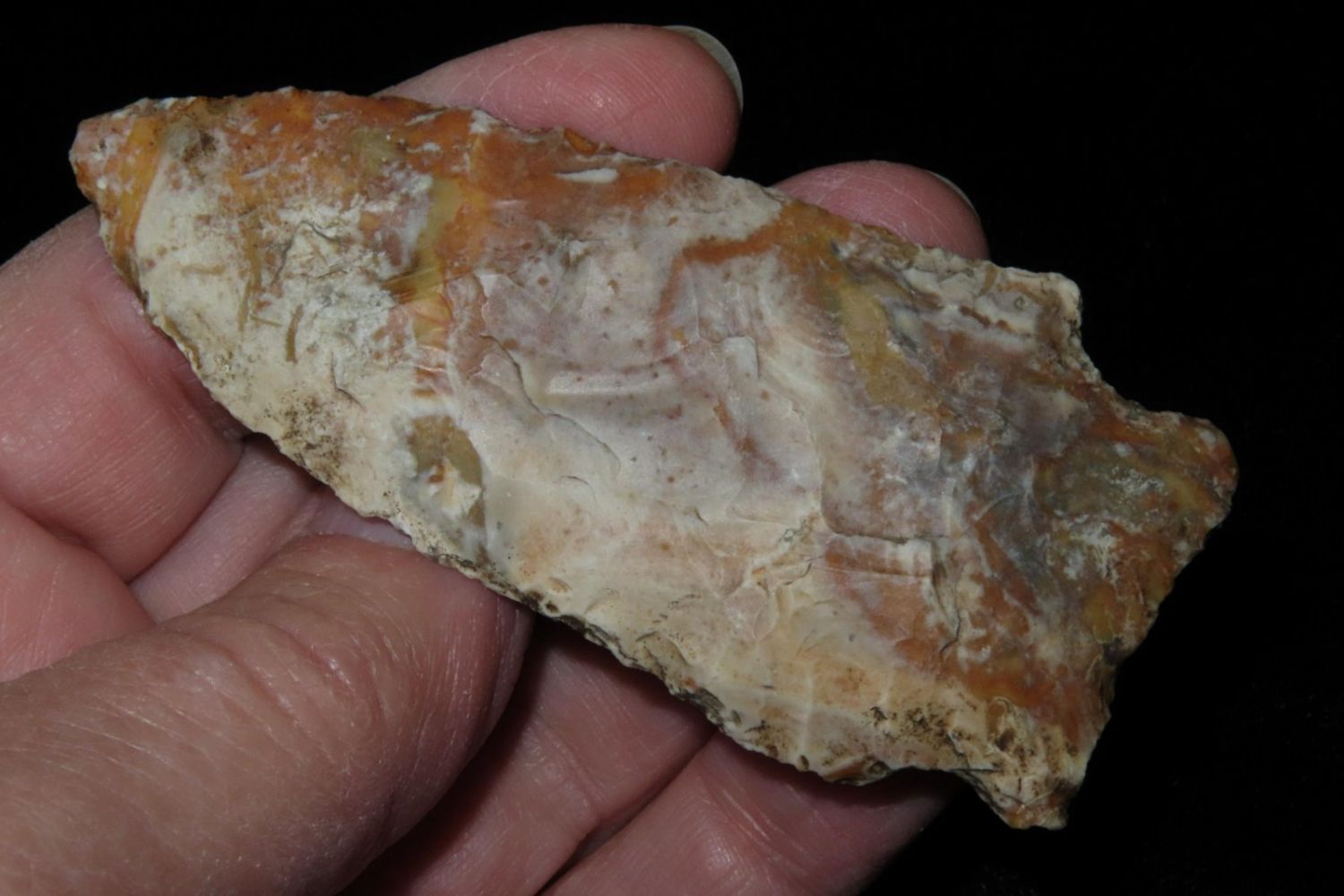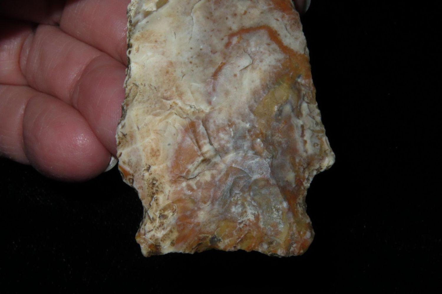 3 1/8" Rice Lobbed. Super creek polish. From the James and Joe George Collection. Joe George was an avid collector and finder of Native American artifacts in the greater St Louis Missouri area. Joe collected his entire life. Upon his passing he turned his collection over to his son James. James was also a very avid collector. He enjoyed walking various waterways and attending artifact shows. James is looking forward to passing down his collection to the relic community for caretaking.