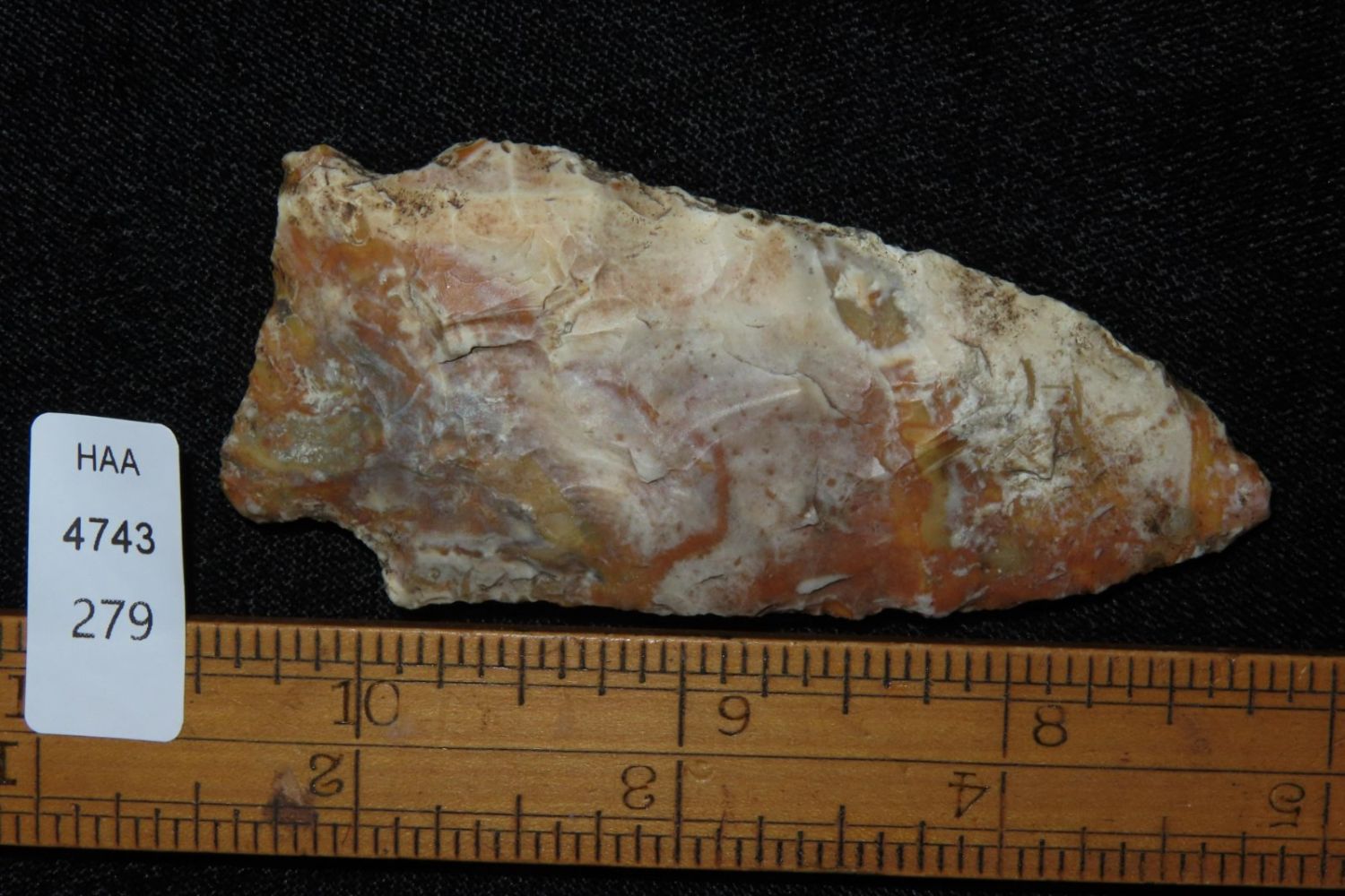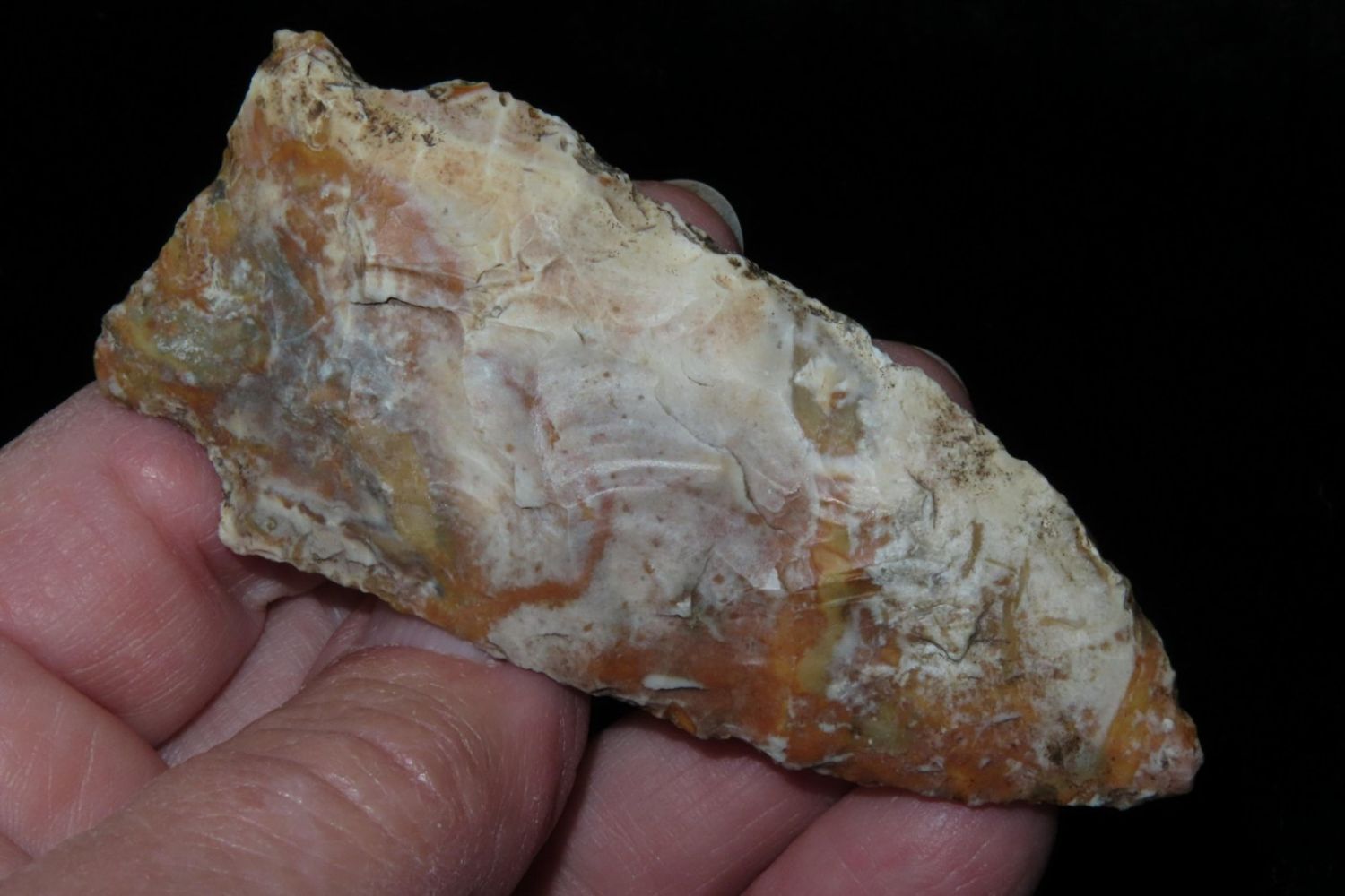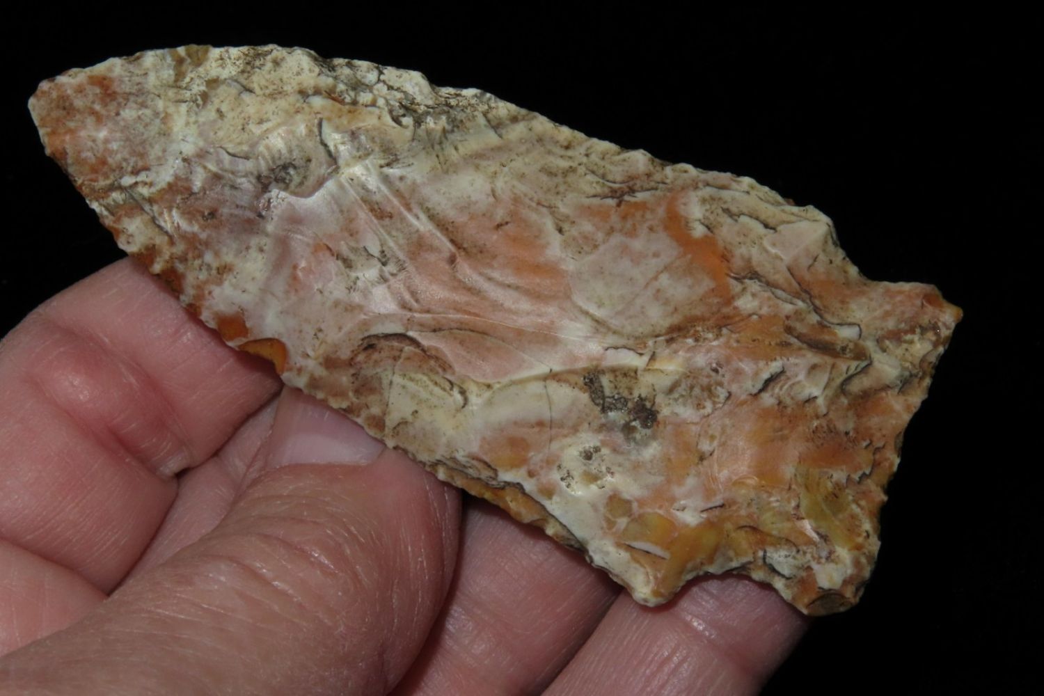 3 1/8" Rice Lobbed. Super creek polish. From the James and Joe George Collection. Joe George was an avid collector and finder of Native American artifacts in the greater St Louis Missouri area. Joe collected his entire life. Upon his passing he turned his collection over to his son James. James was also a very avid collector. He enjoyed walking various waterways and attending artifact shows. James is looking forward to passing down his collection to the relic community for caretaking.