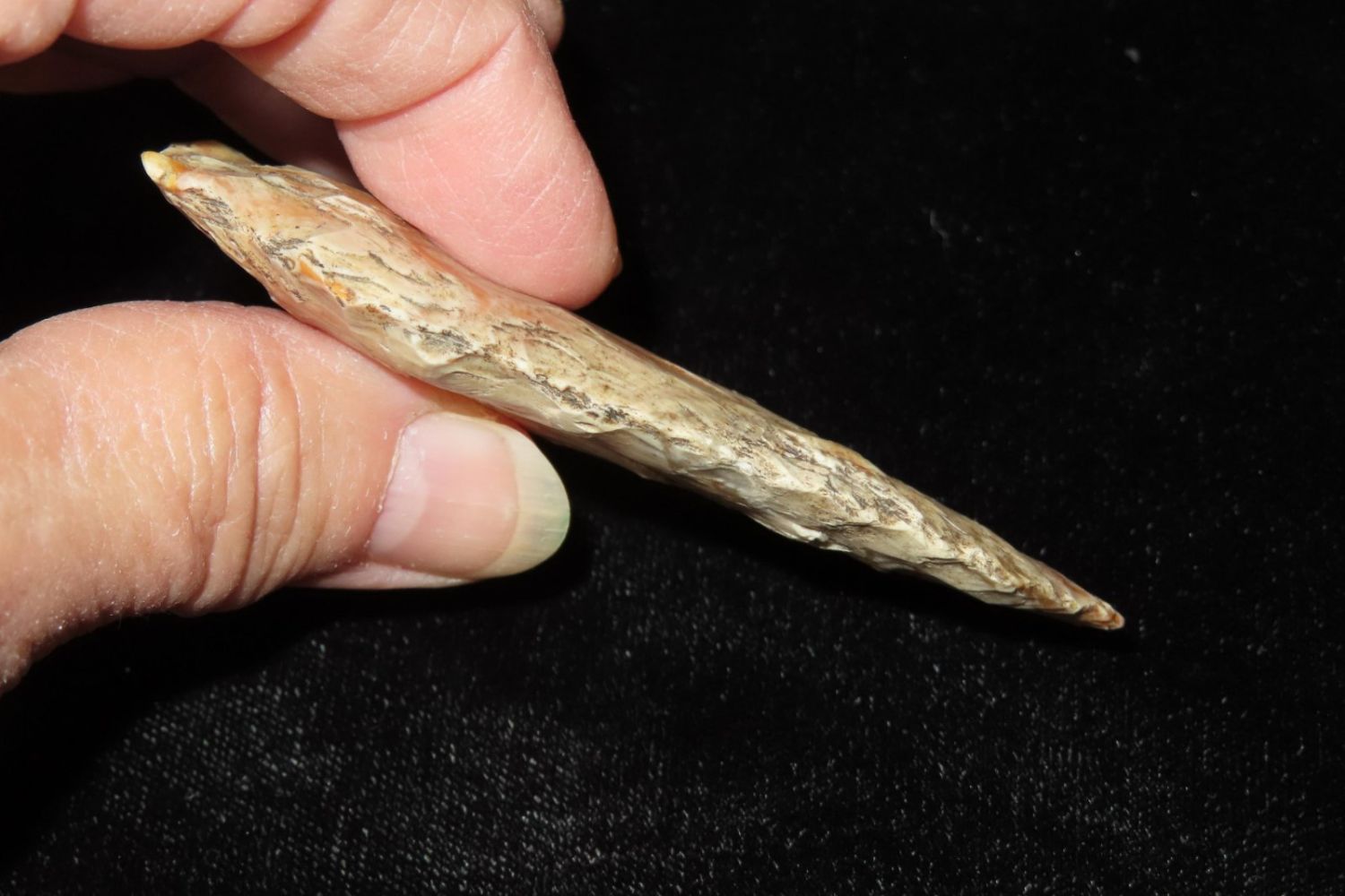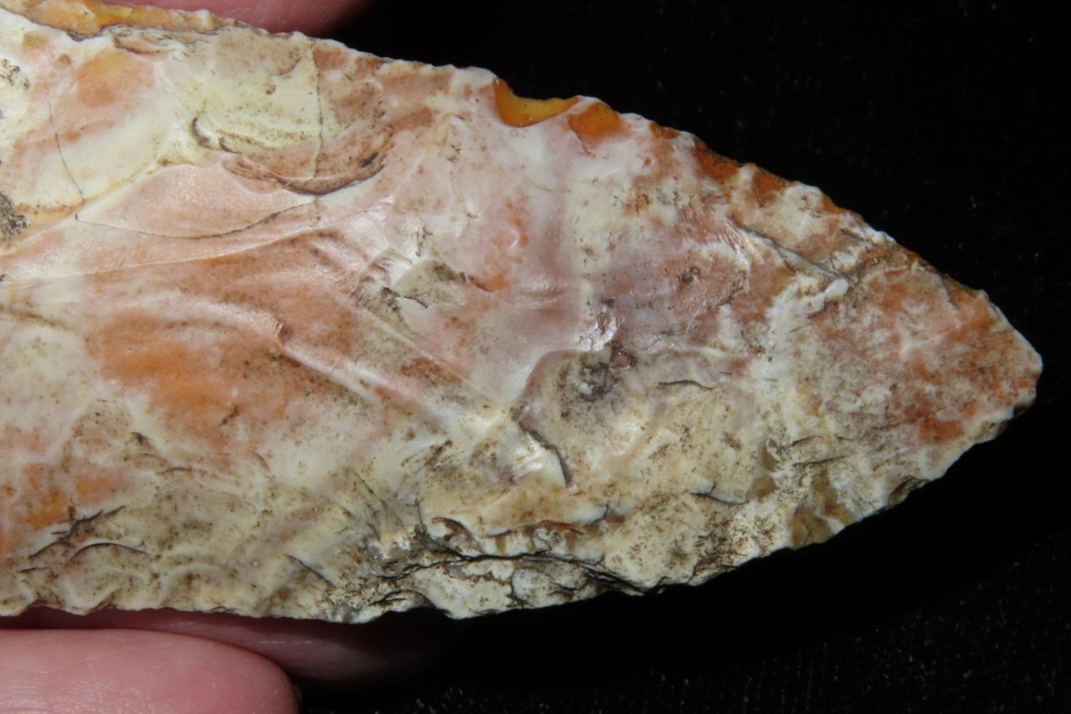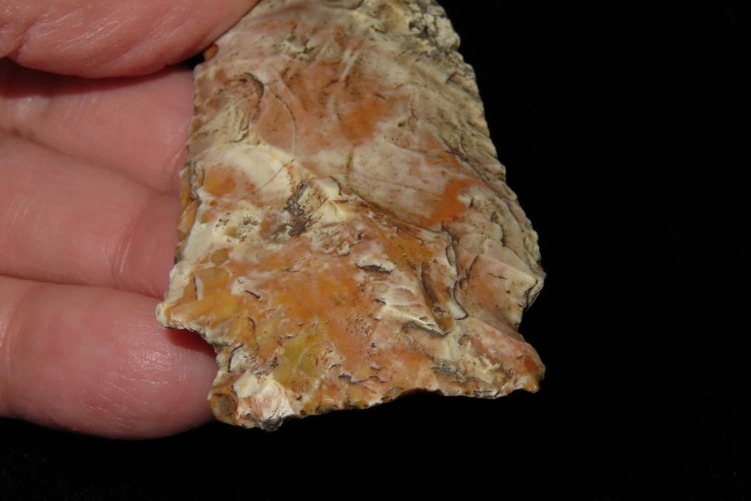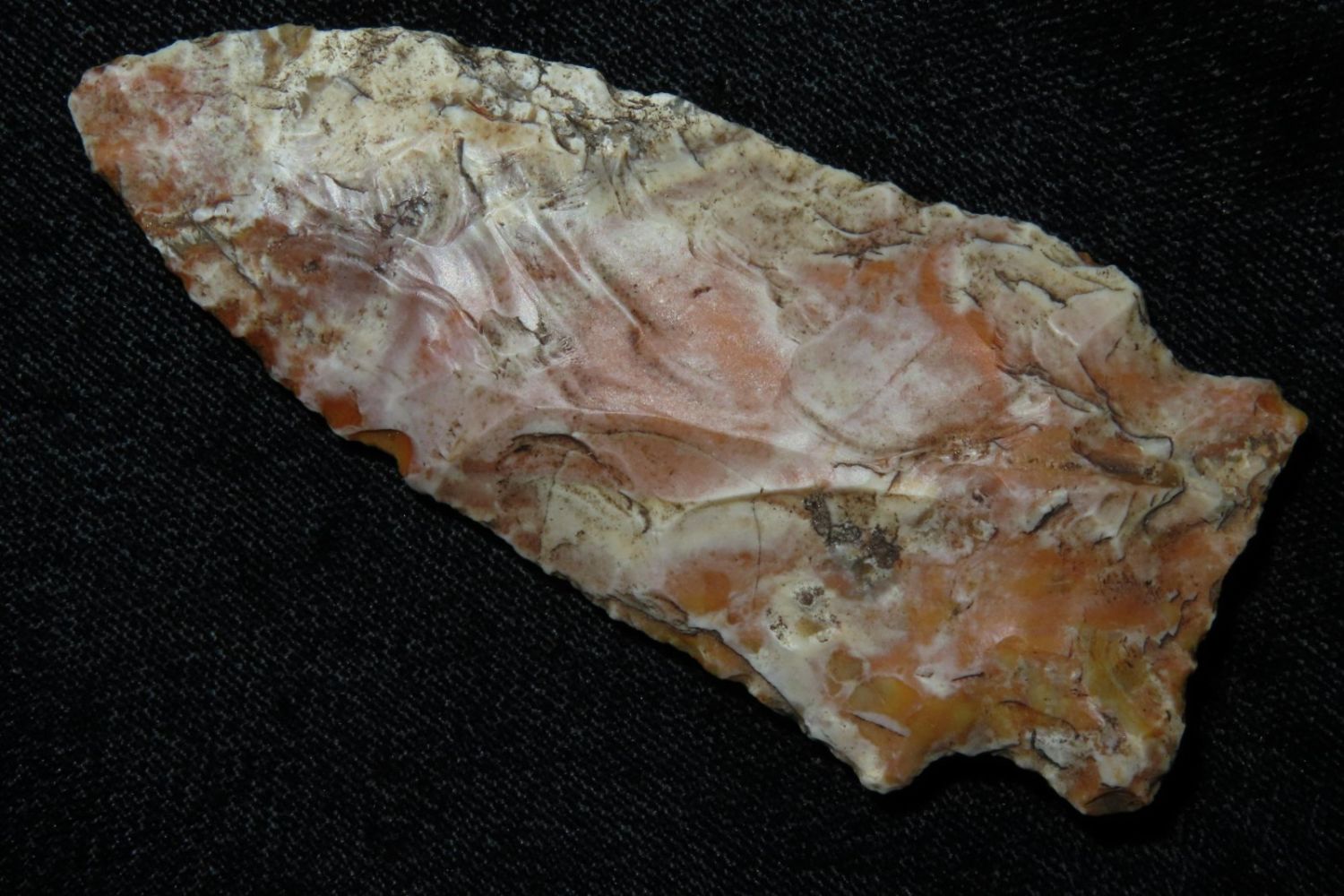 3 1/8" Rice Lobbed. Super creek polish. From the James and Joe George Collection. Joe George was an avid collector and finder of Native American artifacts in the greater St Louis Missouri area. Joe collected his entire life. Upon his passing he turned his collection over to his son James. James was also a very avid collector. He enjoyed walking various waterways and attending artifact shows. James is looking forward to passing down his collection to the relic community for caretaking.