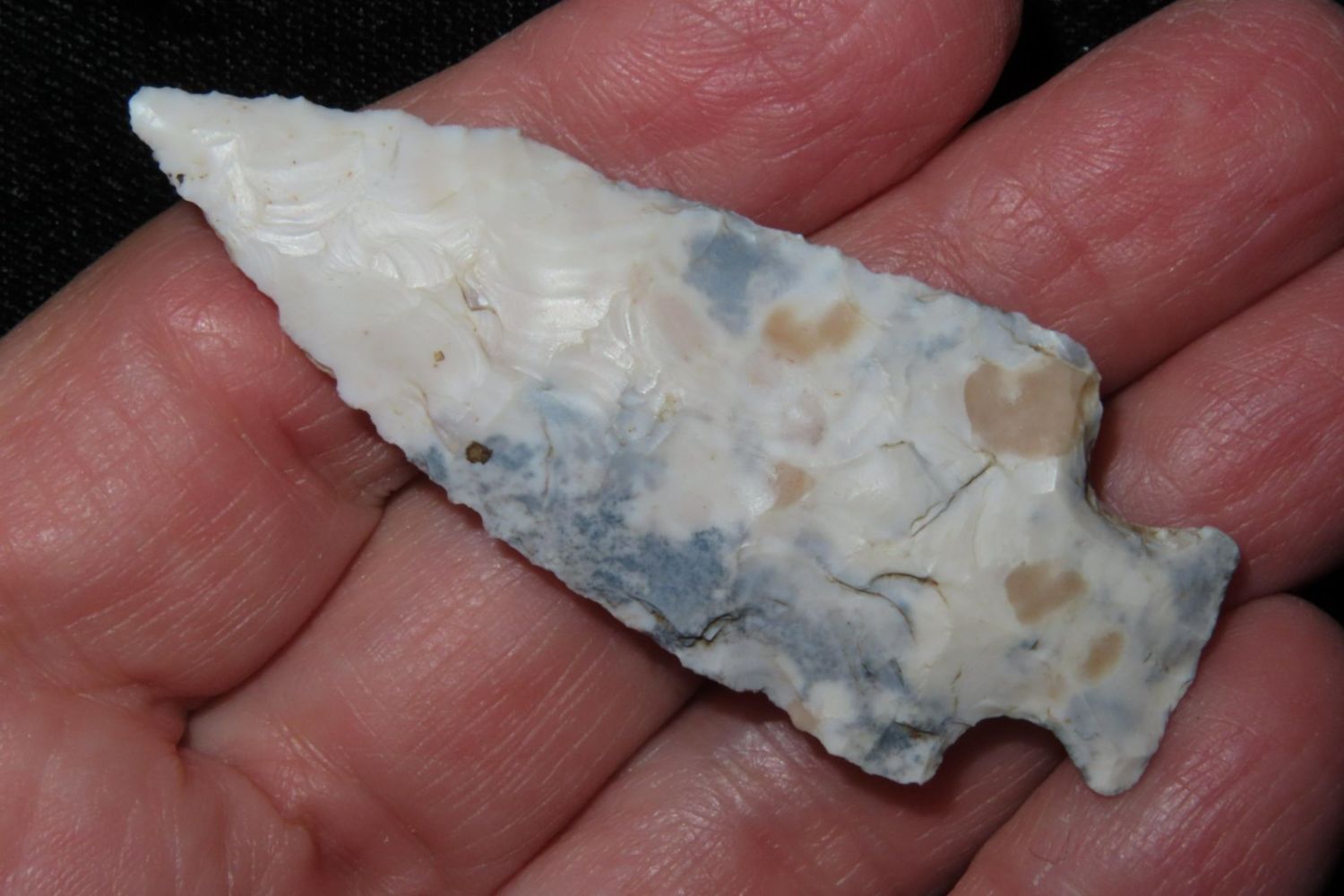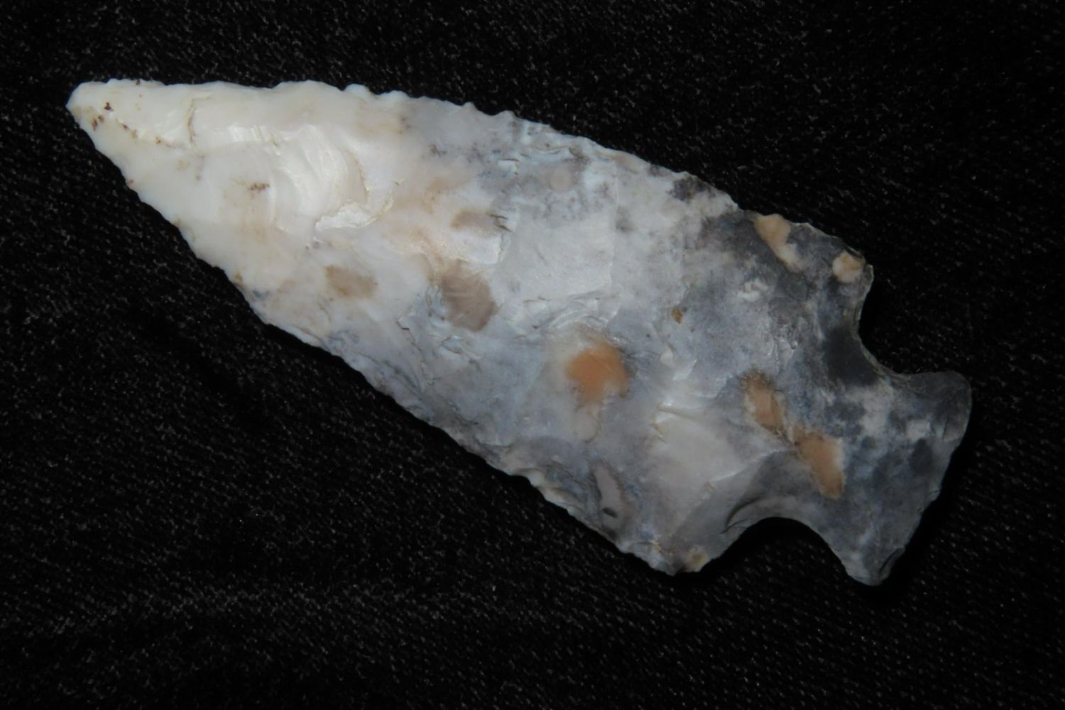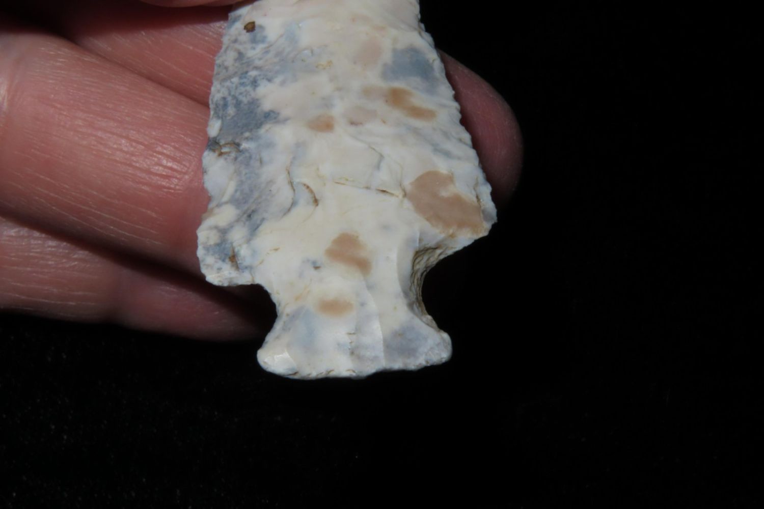2 3/8" Tablerock/Bottleneck with wild two toned material. From the James and Joe George Collection. Joe George was an avid collector and finder of Native American artifacts in the greater St Louis Missouri area. Joe collected his entire life. Upon his passing he turned his collection over to his son James. James was also a very avid collector. He enjoyed walking various waterways and attending artifact shows. James is looking forward to passing down his collection to the relic community for caretaking.