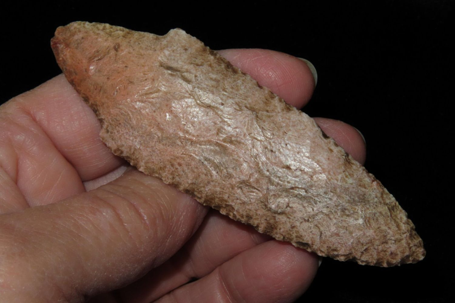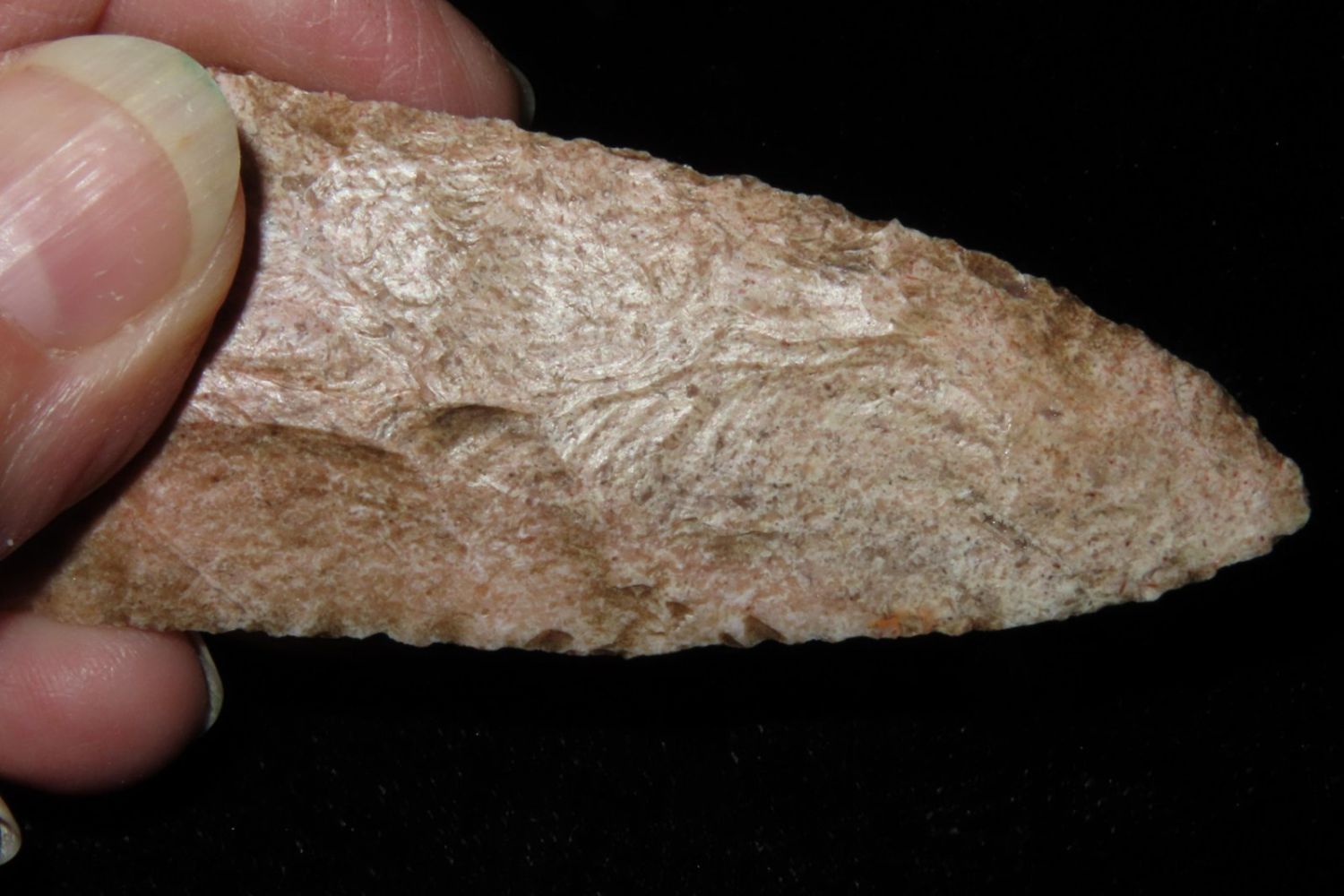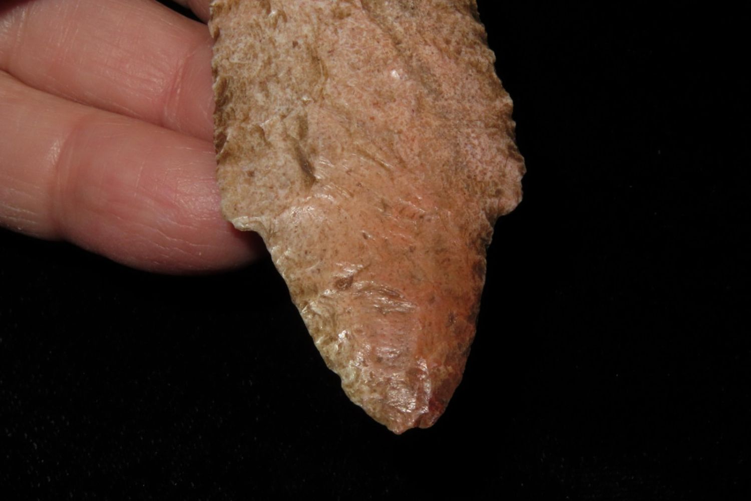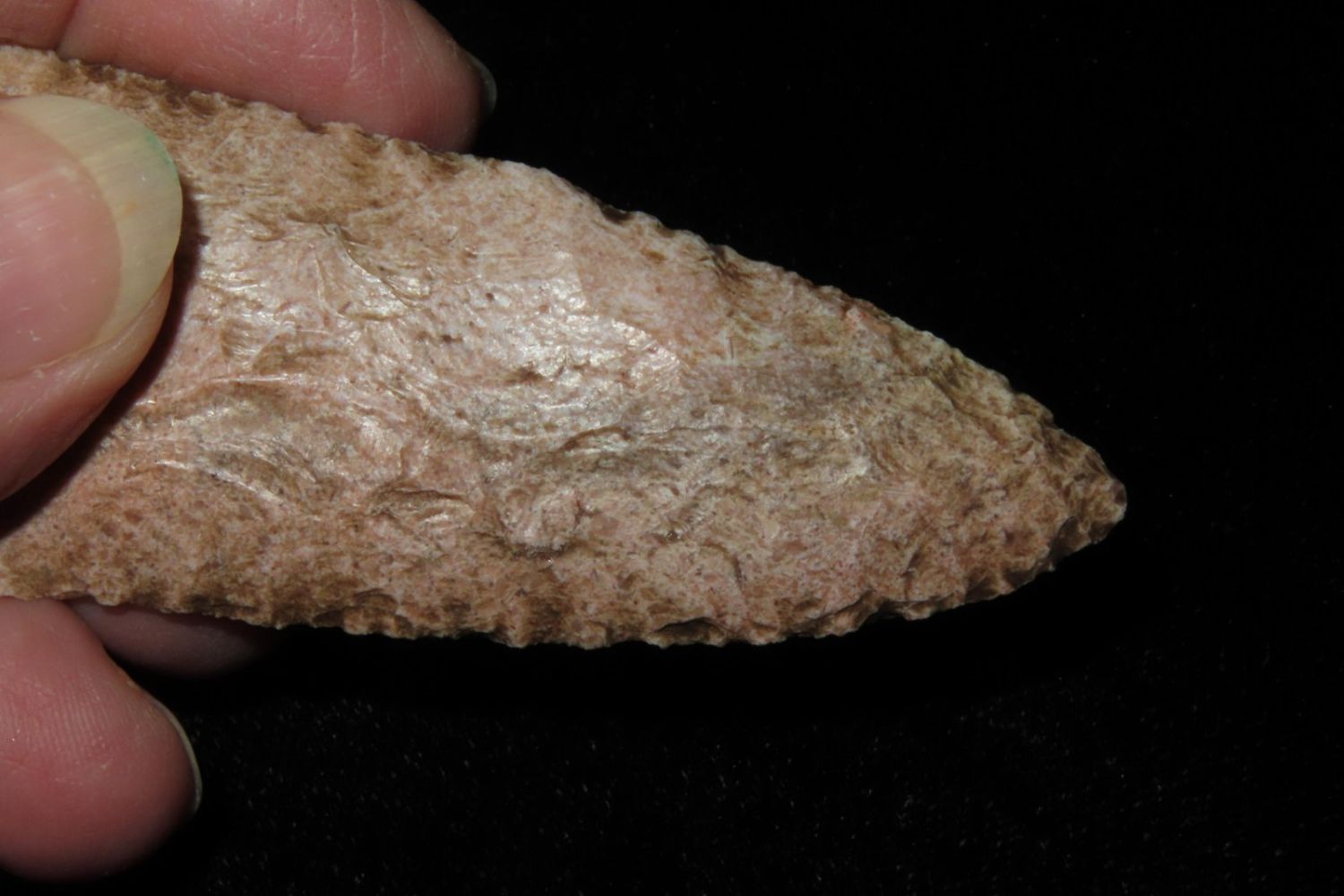 3 5/8" Adena with nice red color. From the James and Joe George Collection. Joe George was an avid collector and finder of Native American artifacts in the greater St Louis Missouri area. Joe collected his entire life. Upon his passing he turned his collection over to his son James. James was also a very avid collector. He enjoyed walking various waterways and attending artifact shows. James is looking forward to passing down his collection to the relic community for caretaking.