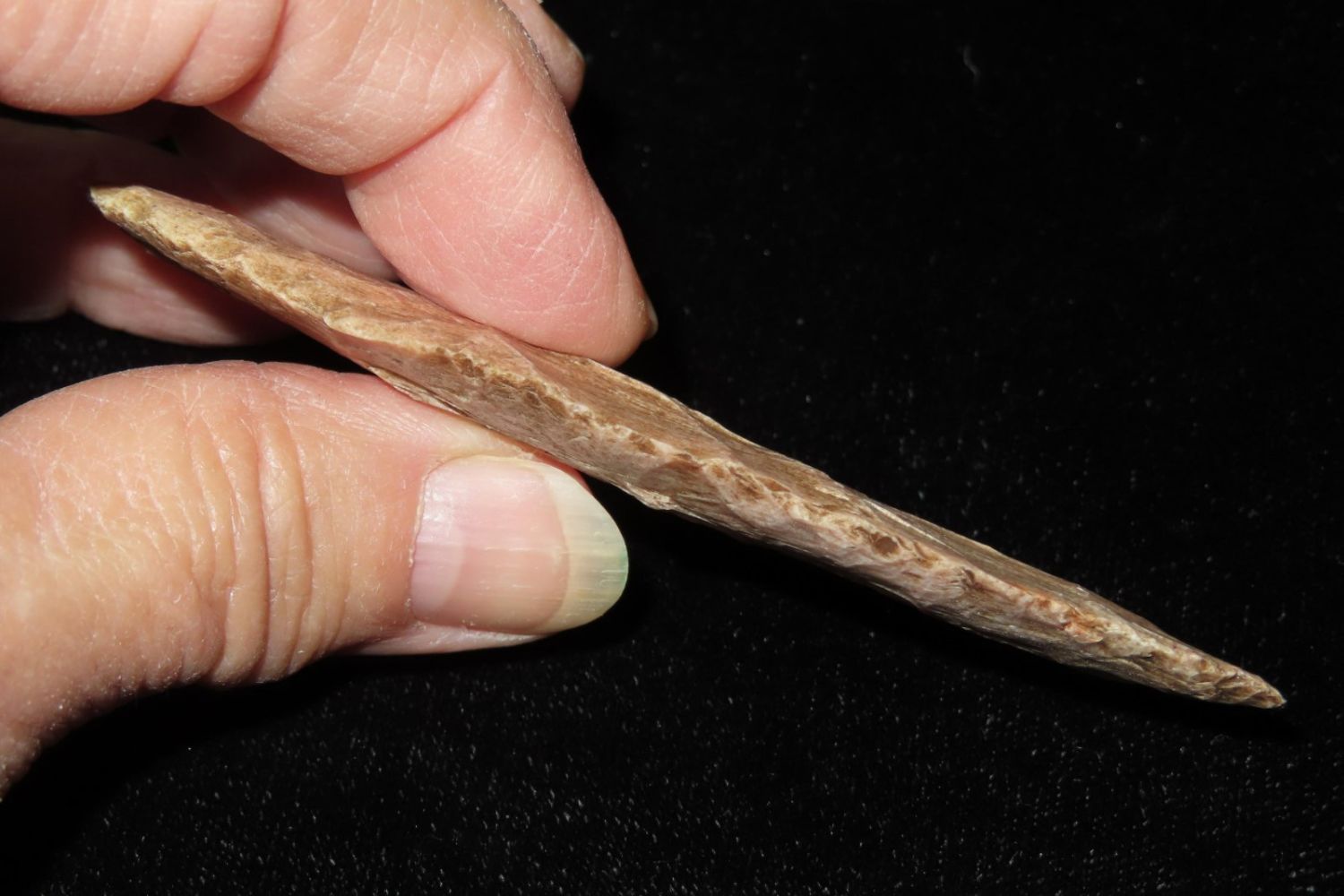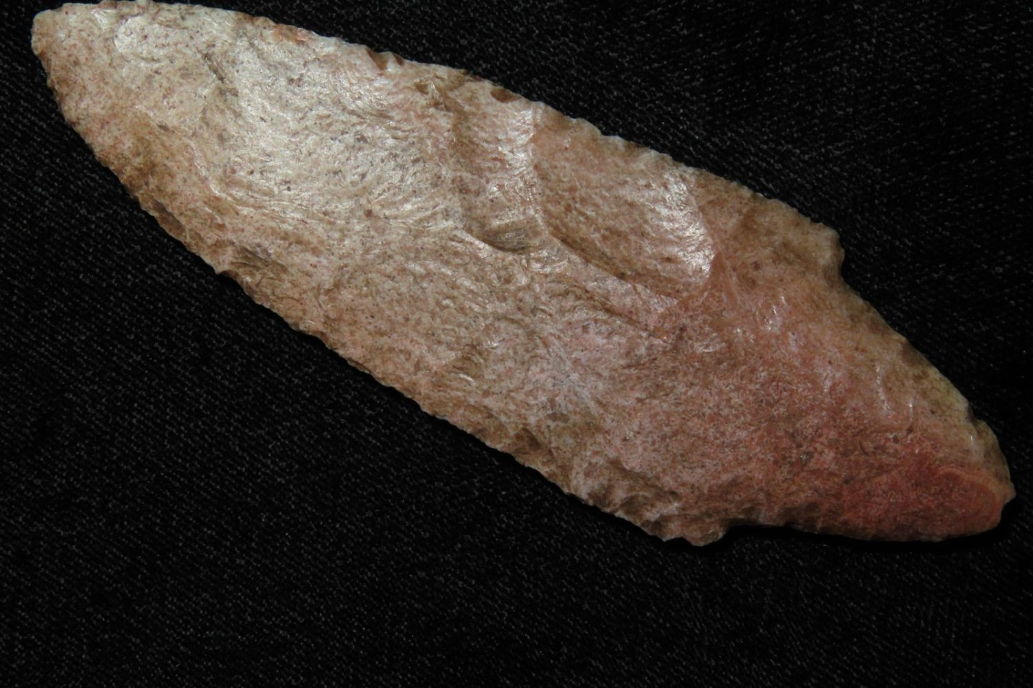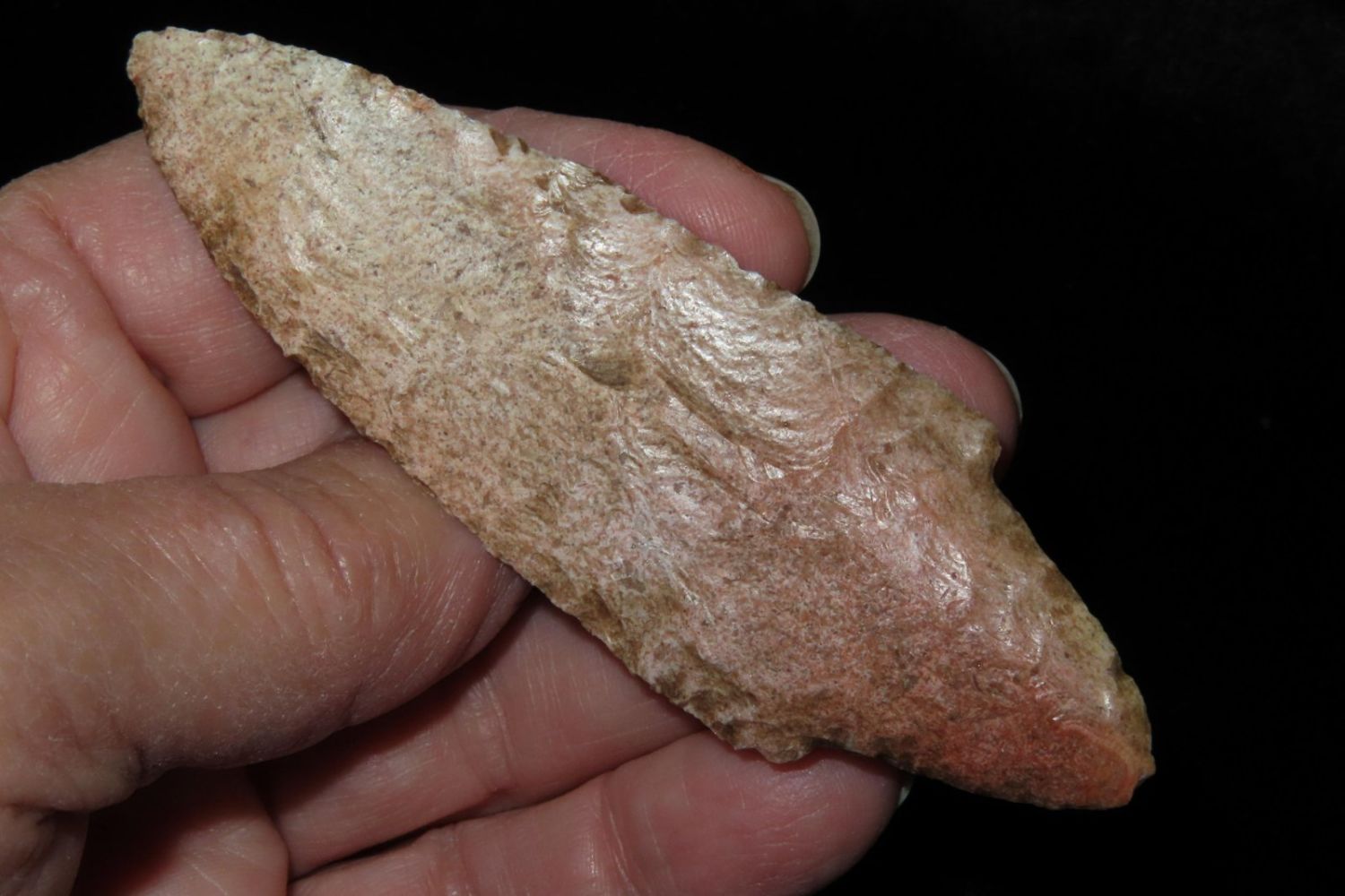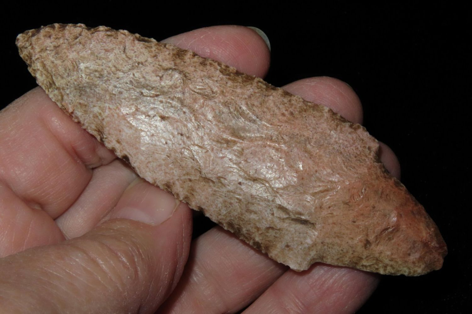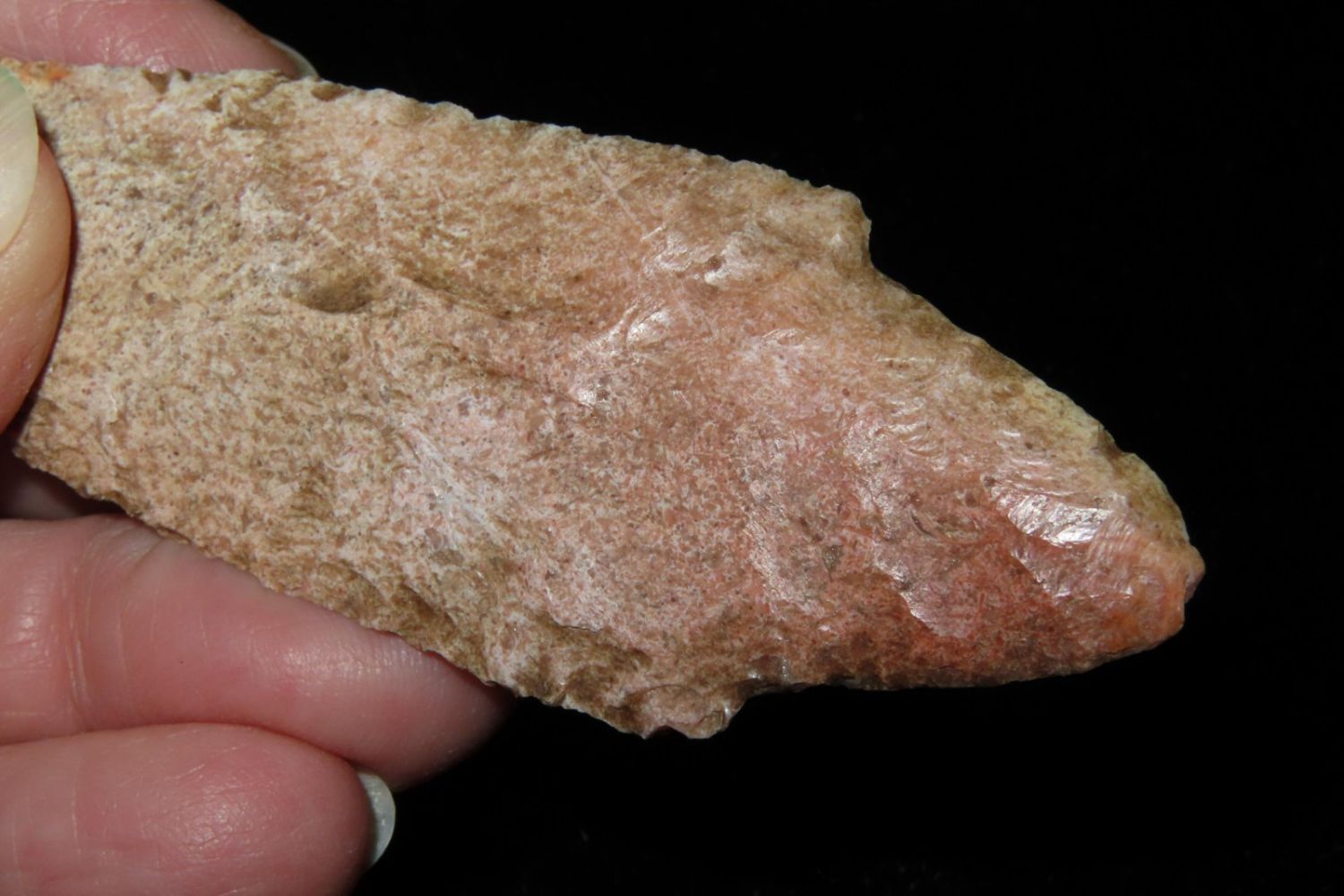 3 5/8" Adena with nice red color. From the James and Joe George Collection. Joe George was an avid collector and finder of Native American artifacts in the greater St Louis Missouri area. Joe collected his entire life. Upon his passing he turned his collection over to his son James. James was also a very avid collector. He enjoyed walking various waterways and attending artifact shows. James is looking forward to passing down his collection to the relic community for caretaking.