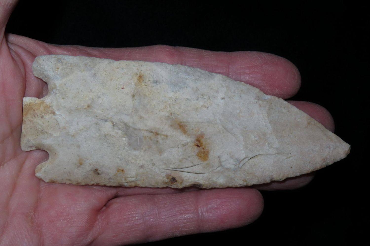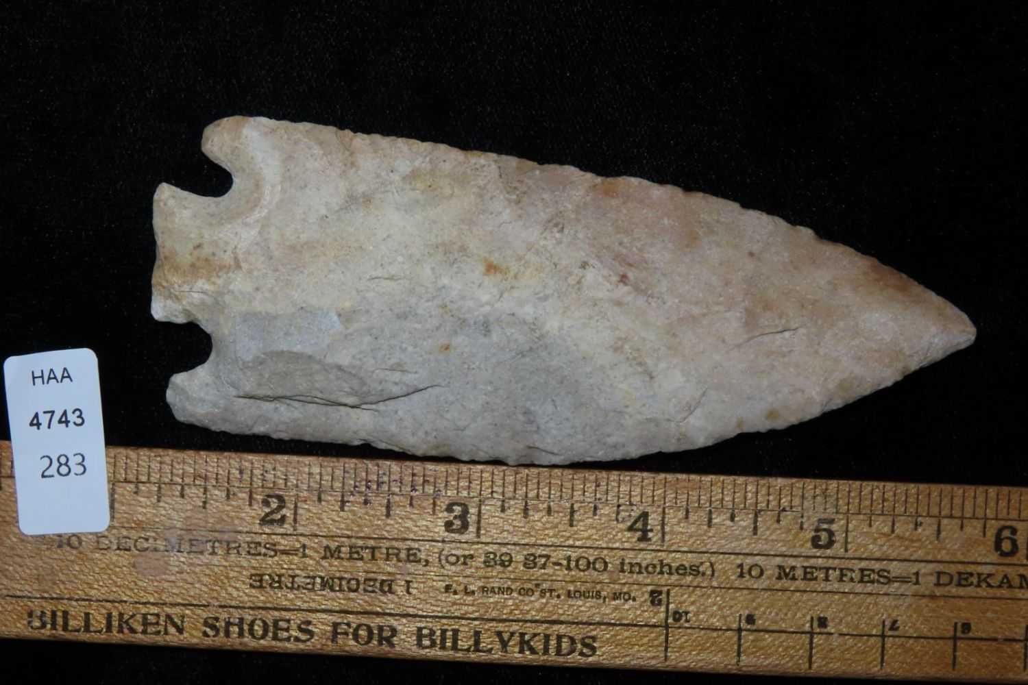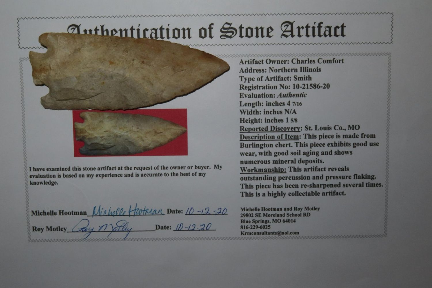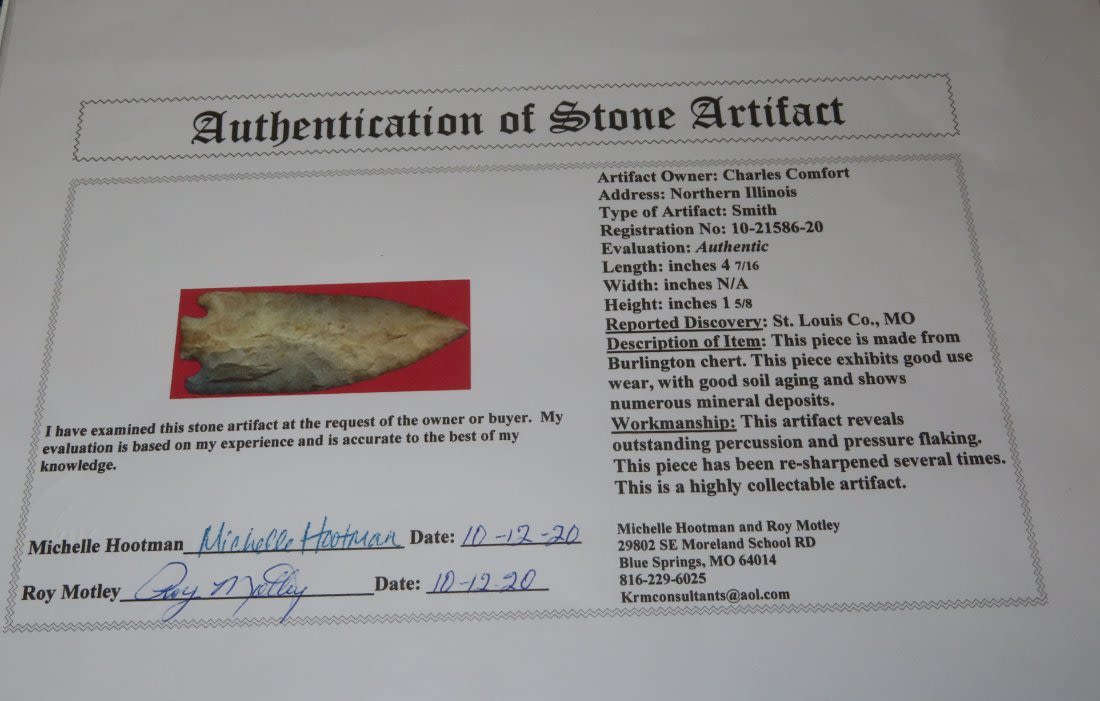 4 7/16" Smith. Motley COA. Found in St. Louis County, MO. From the James and Joe George Collection. Joe George was an avid collector and finder of Native American artifacts in the greater St Louis Missouri area. Joe collected his entire life. Upon his passing he turned his collection over to his son James. James was also a very avid collector. He enjoyed walking various waterways and attending artifact shows. James is looking forward to passing down his collection to the relic community for caretaking.
