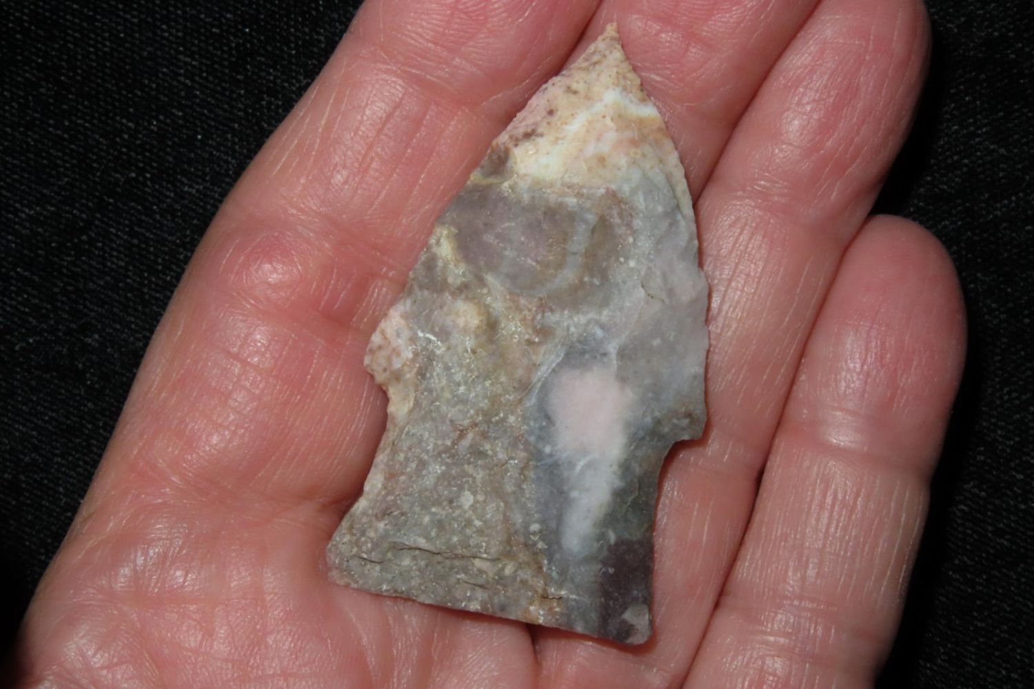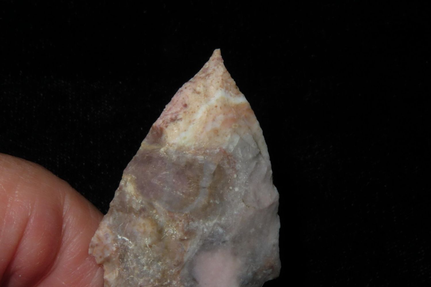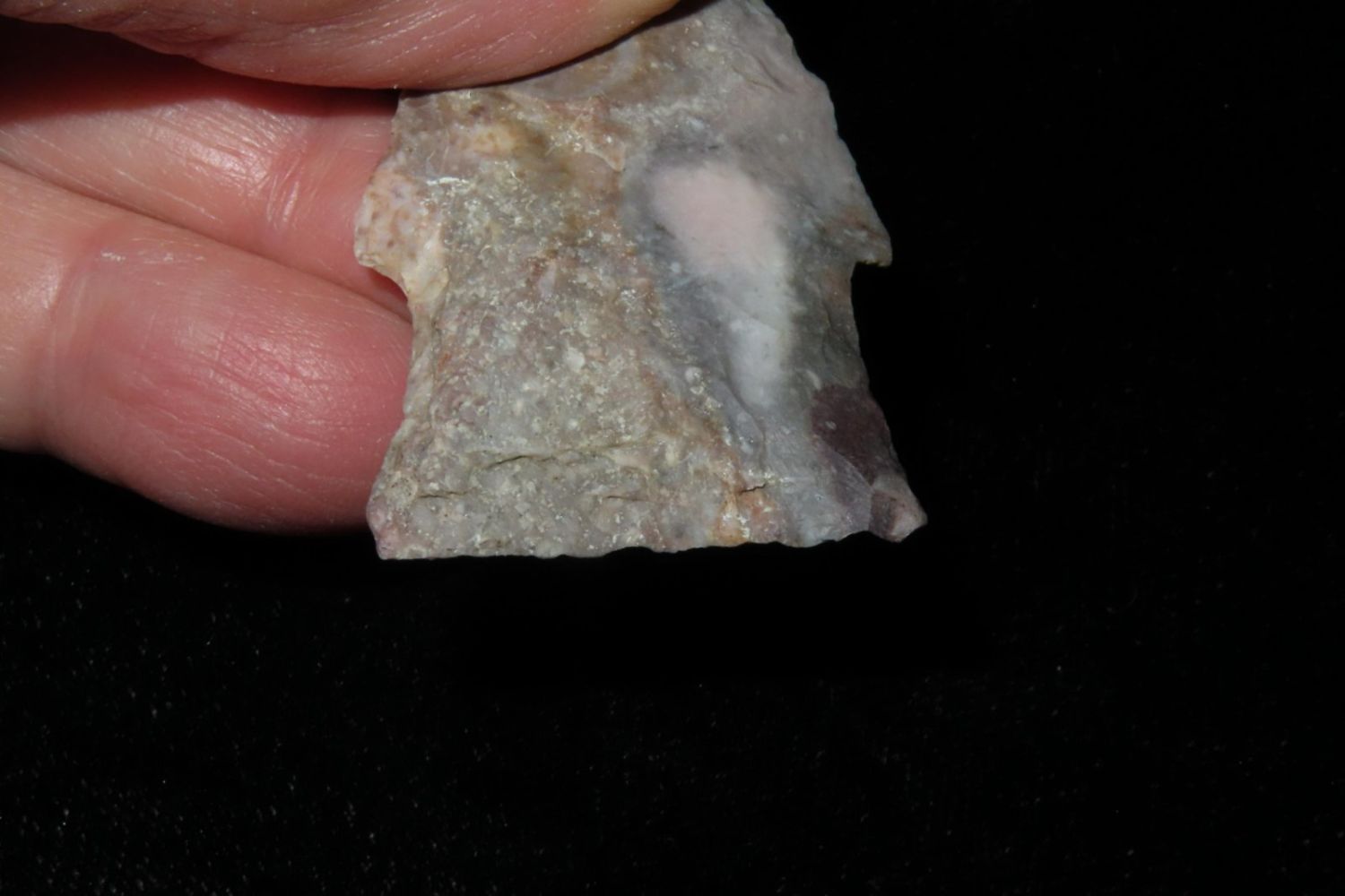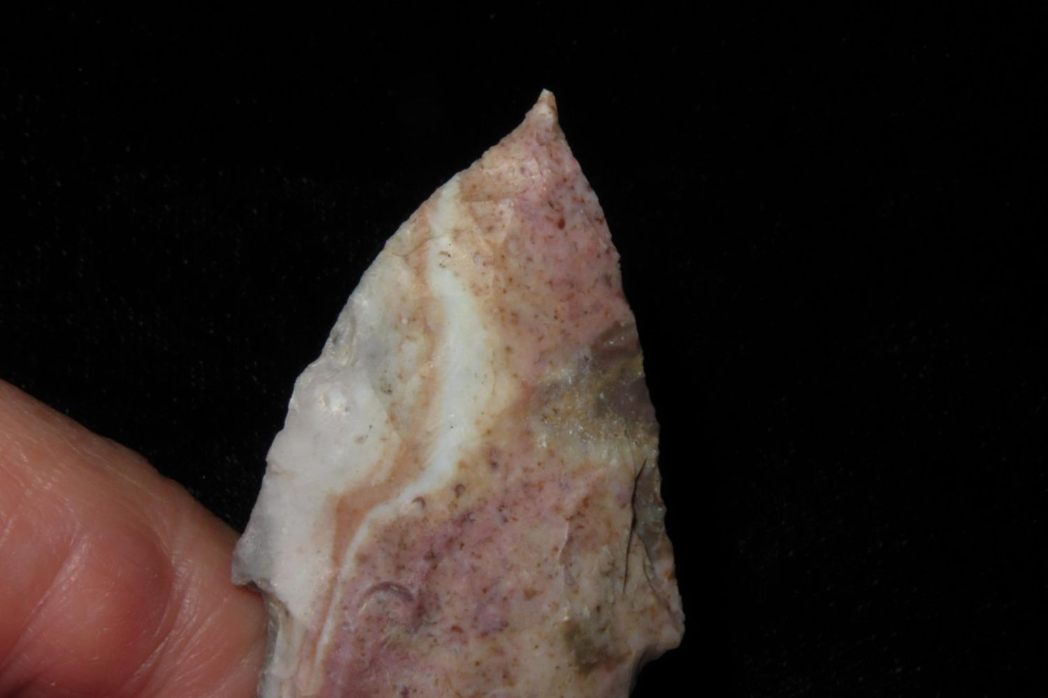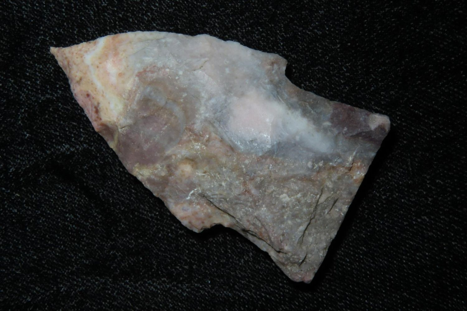 2" Needletip Rice Side Notch. Heat treated Mozarkite. From the James and Joe George Collection. Joe George was an avid collector and finder of Native American artifacts in the greater St Louis Missouri area. Joe collected his entire life. Upon his passing he turned his collection over to his son James. James was also a very avid collector. He enjoyed walking various waterways and attending artifact shows. James is looking forward to passing down his collection to the relic community for caretaking.
