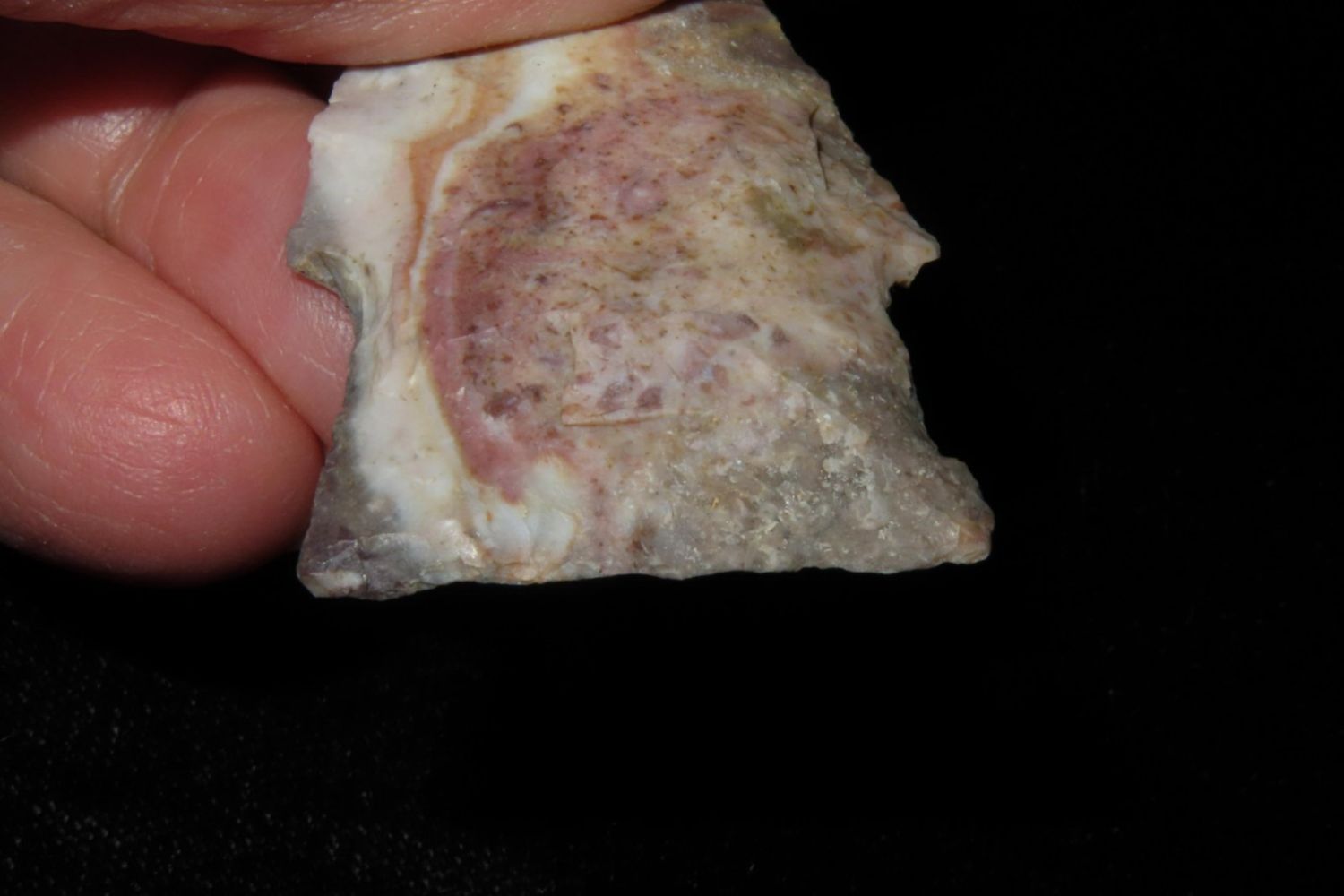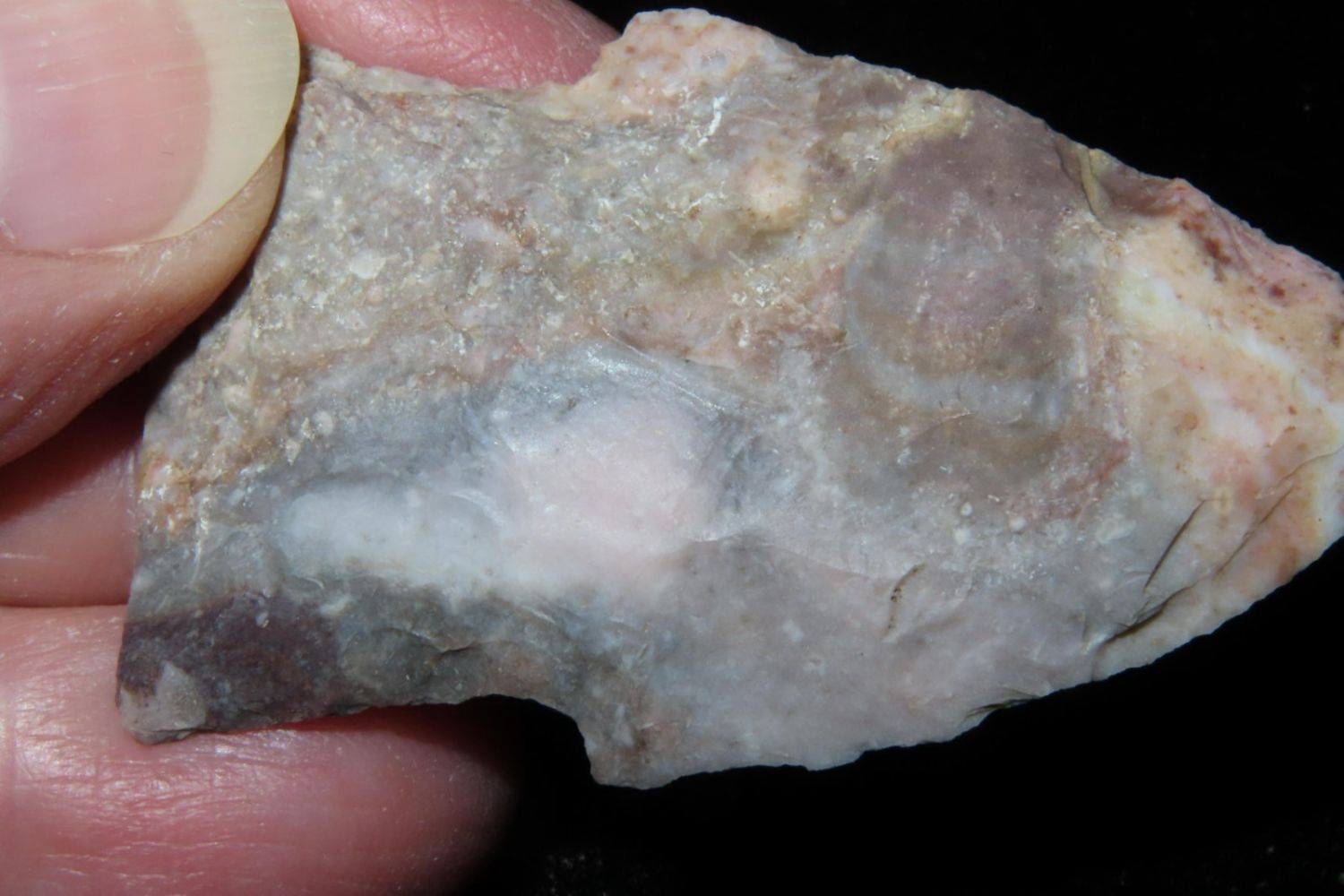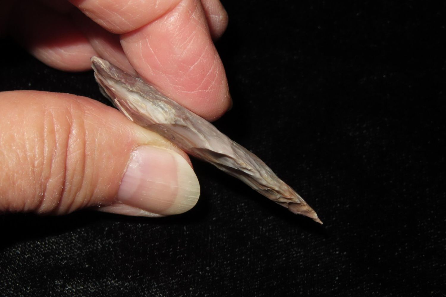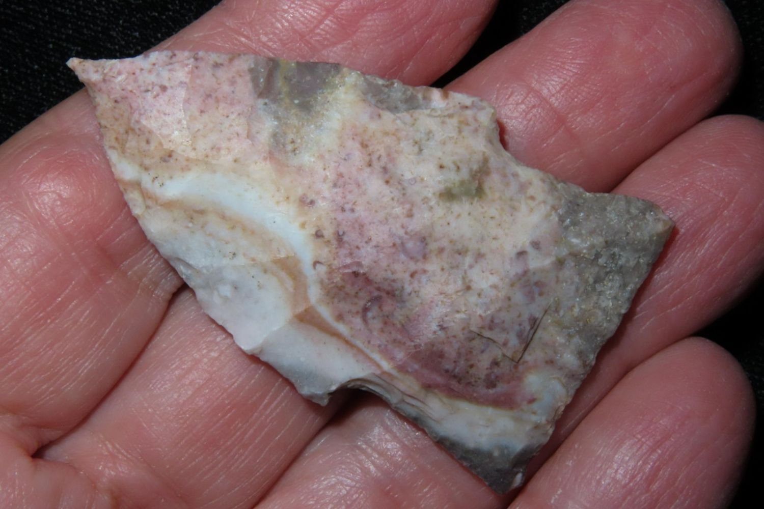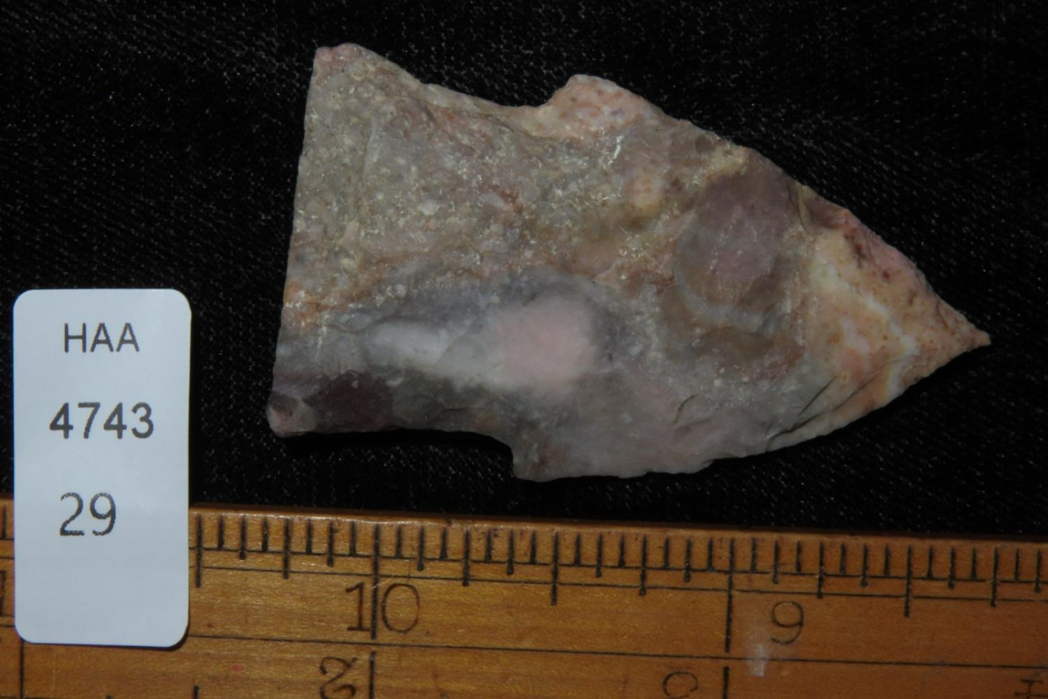 2" Needletip Rice Side Notch. Heat treated Mozarkite. From the James and Joe George Collection. Joe George was an avid collector and finder of Native American artifacts in the greater St Louis Missouri area. Joe collected his entire life. Upon his passing he turned his collection over to his son James. James was also a very avid collector. He enjoyed walking various waterways and attending artifact shows. James is looking forward to passing down his collection to the relic community for caretaking.