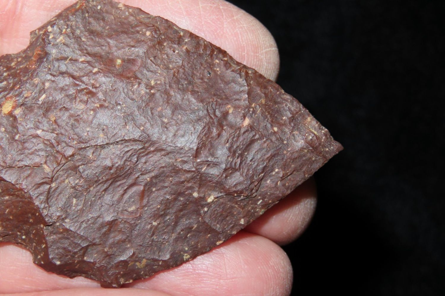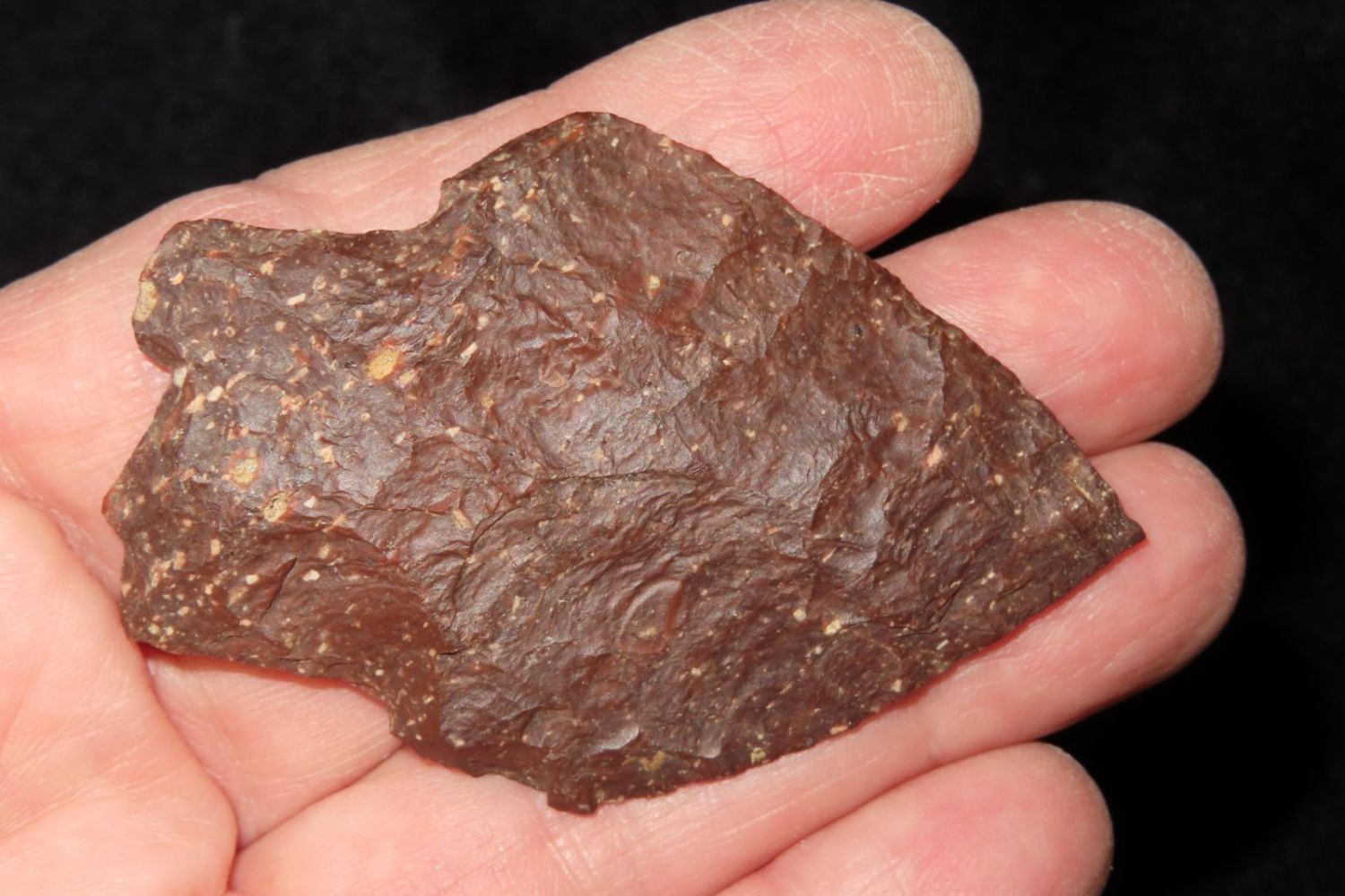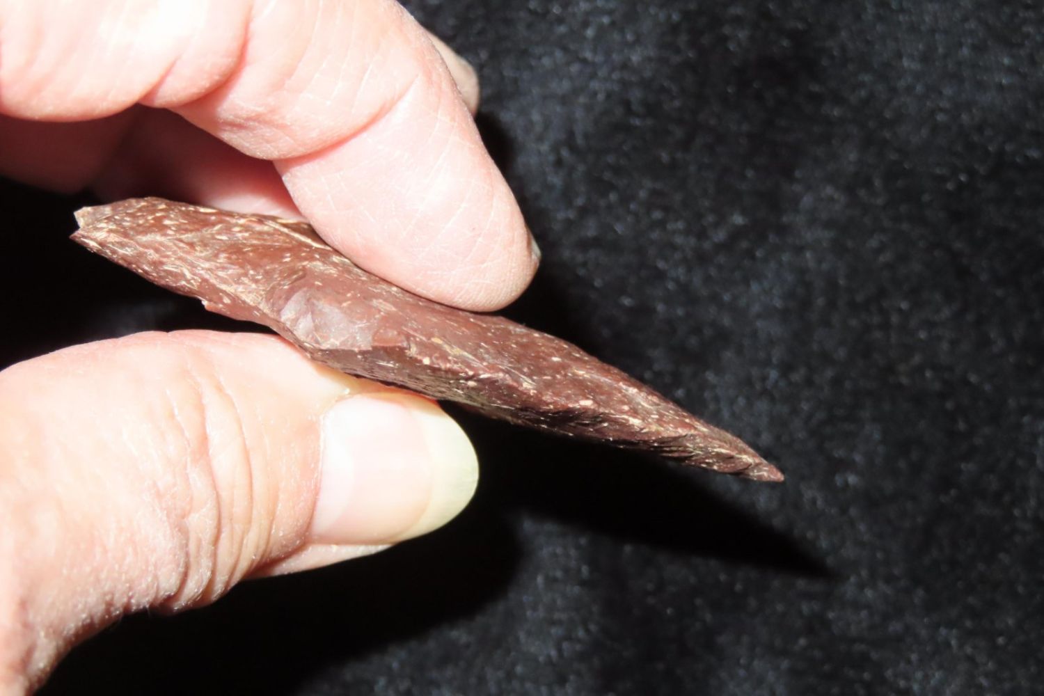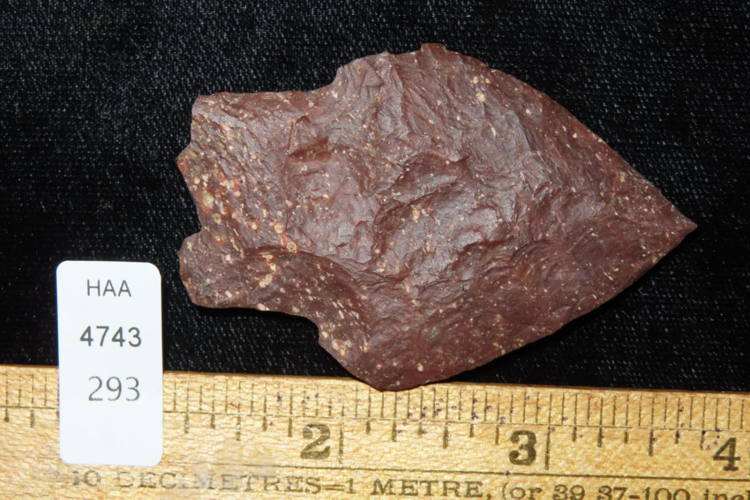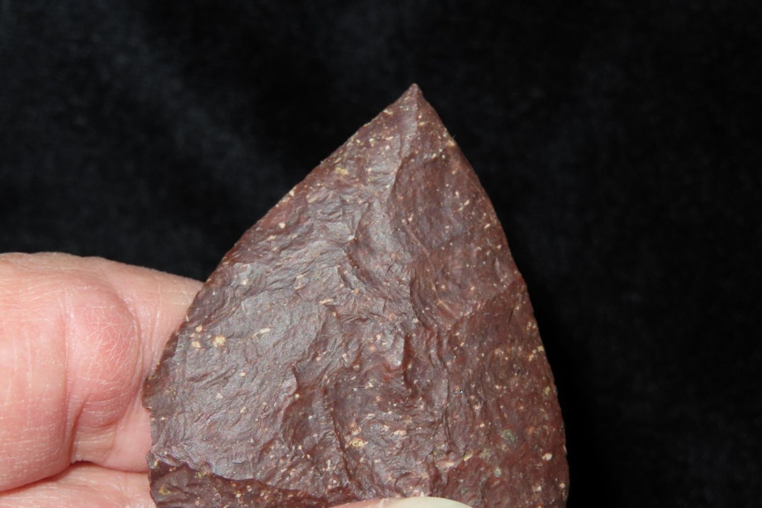 2 3/8" Red Rhyolite Needle Tip Point. From the James and Joe George Collection. Joe George was an avid collector and finder of Native American artifacts in the greater St Louis Missouri area. Joe collected his entire life. Upon his passing he turned his collection over to his son James. James was also a very avid collector. He enjoyed walking various waterways and attending artifact shows. James is looking forward to passing down his collection to the relic community for caretaking.