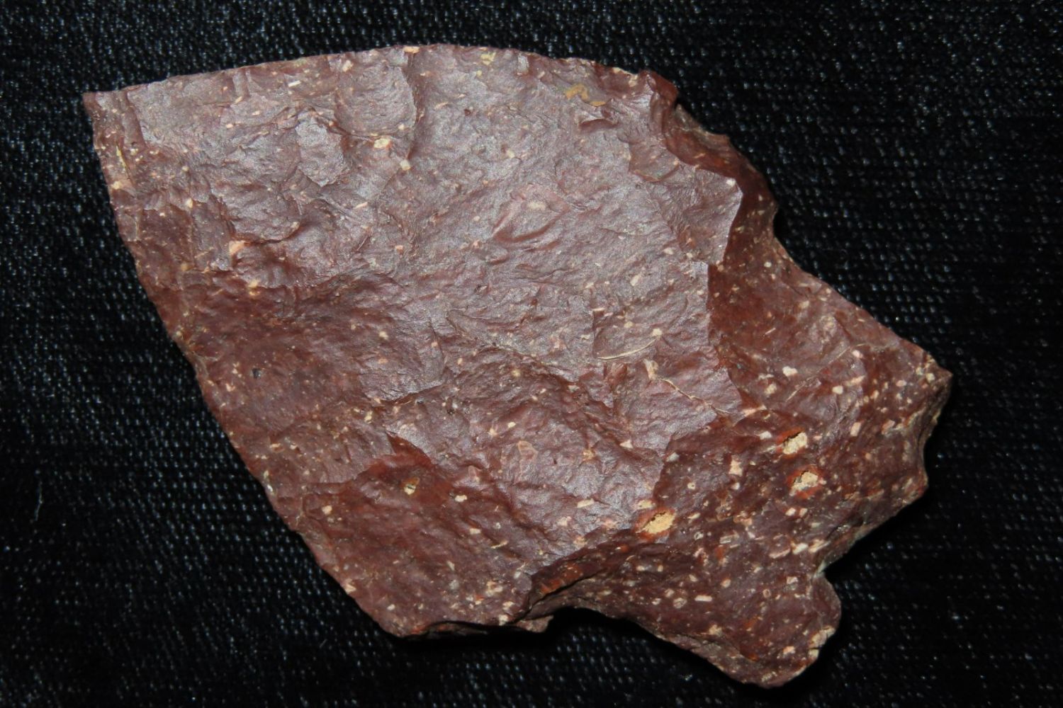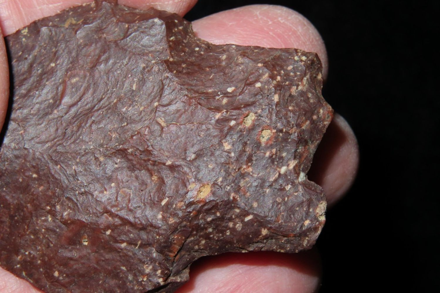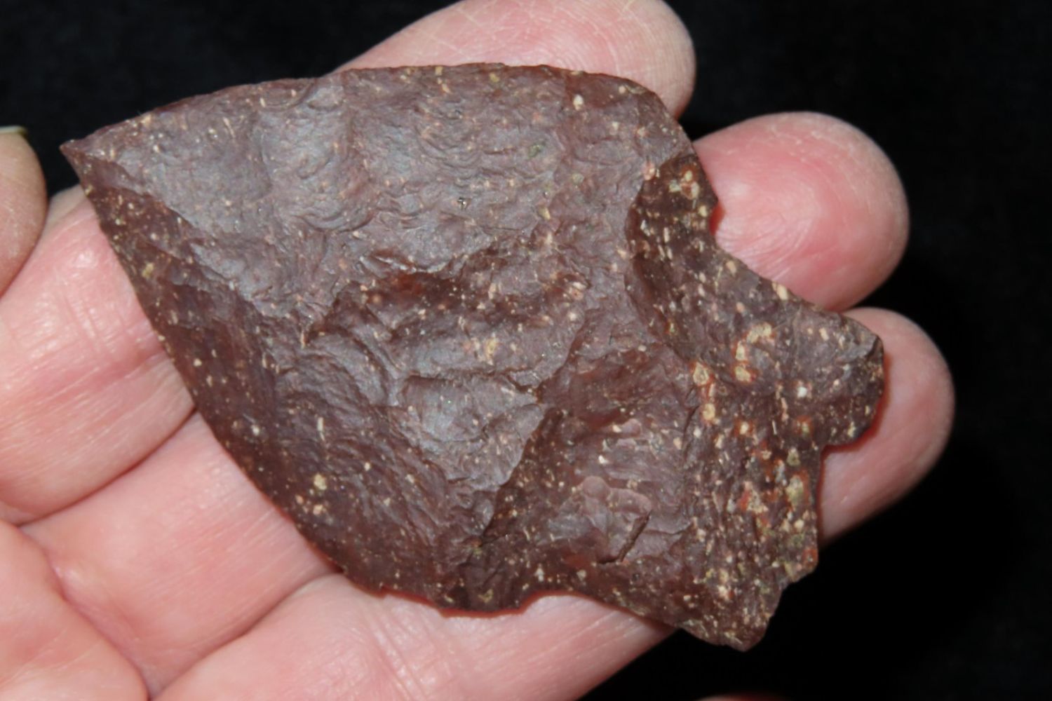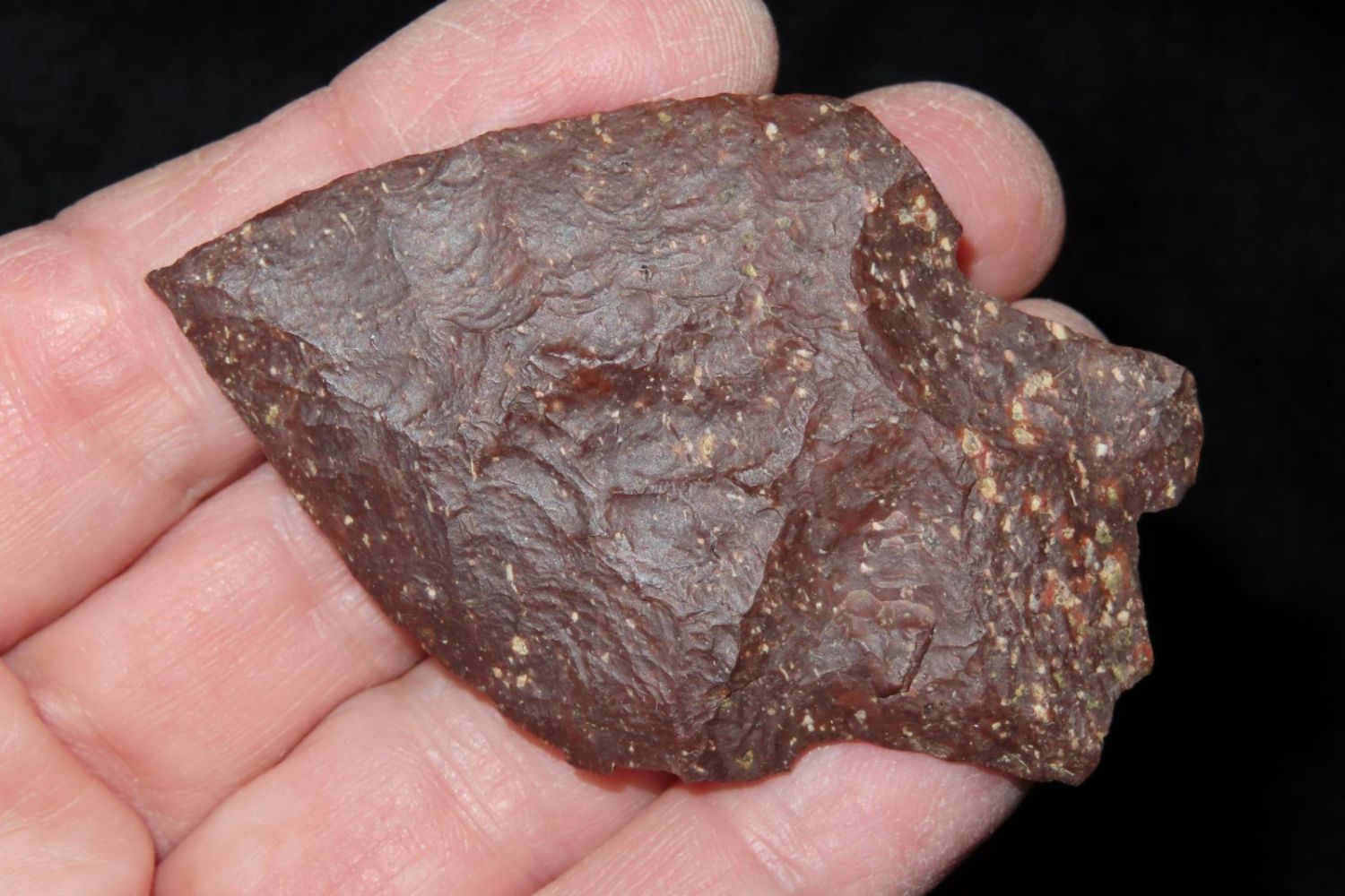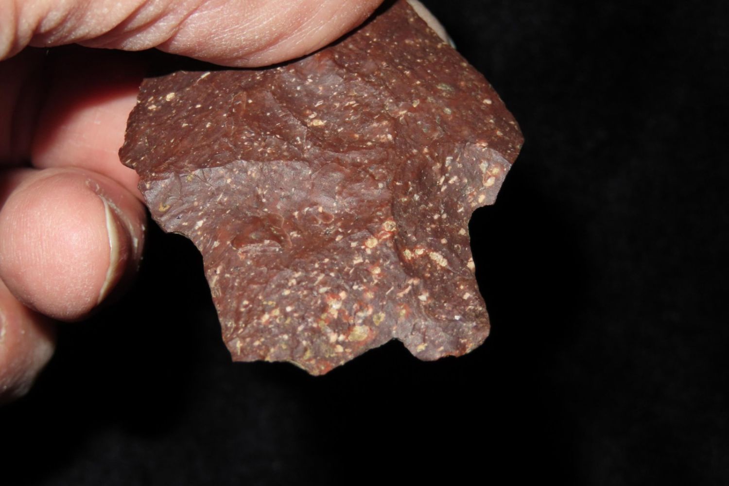 2 3/8" Red Rhyolite Needle Tip Point. From the James and Joe George Collection. Joe George was an avid collector and finder of Native American artifacts in the greater St Louis Missouri area. Joe collected his entire life. Upon his passing he turned his collection over to his son James. James was also a very avid collector. He enjoyed walking various waterways and attending artifact shows. James is looking forward to passing down his collection to the relic community for caretaking.