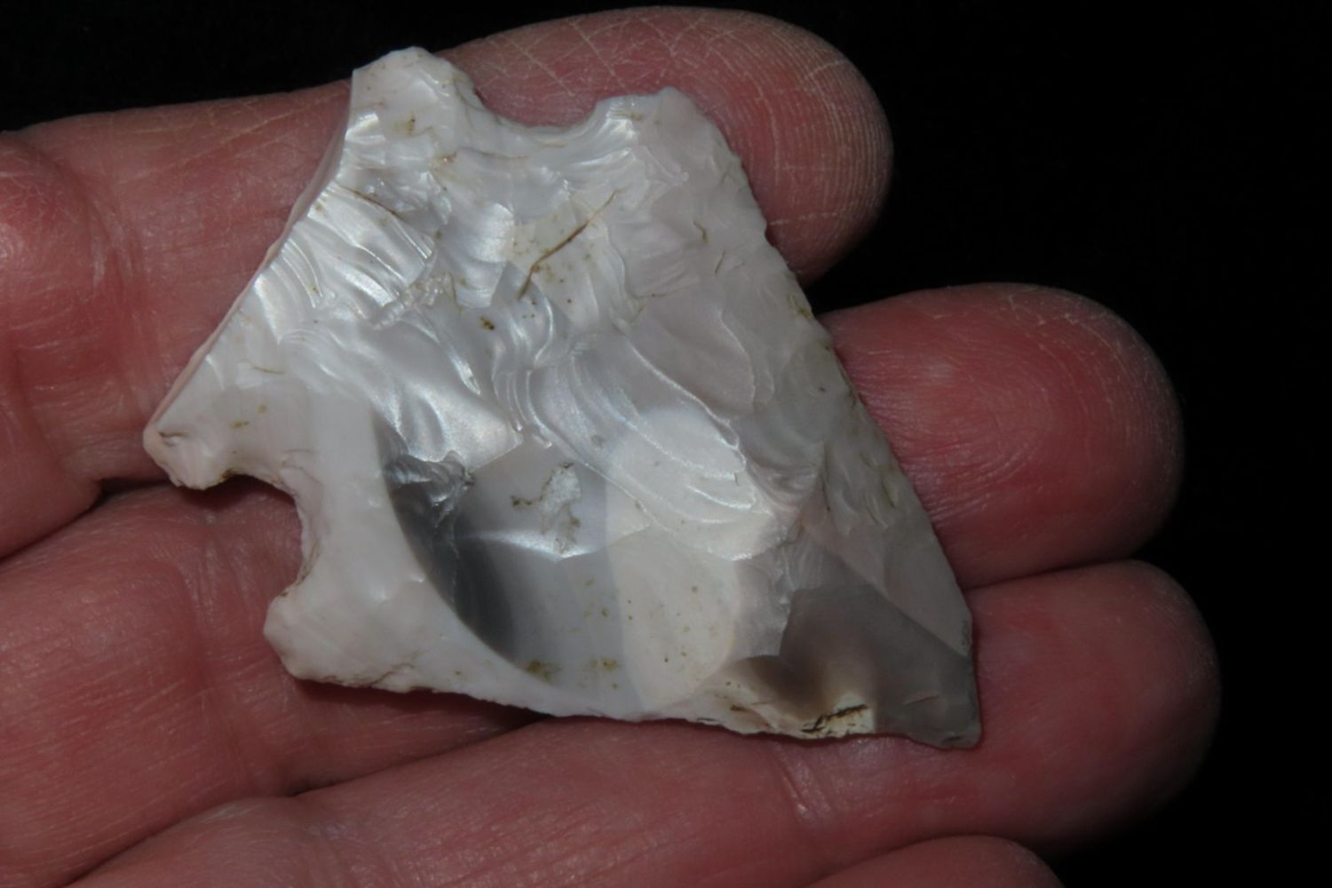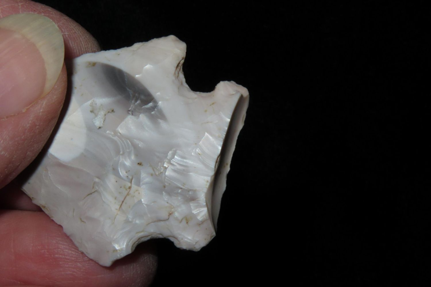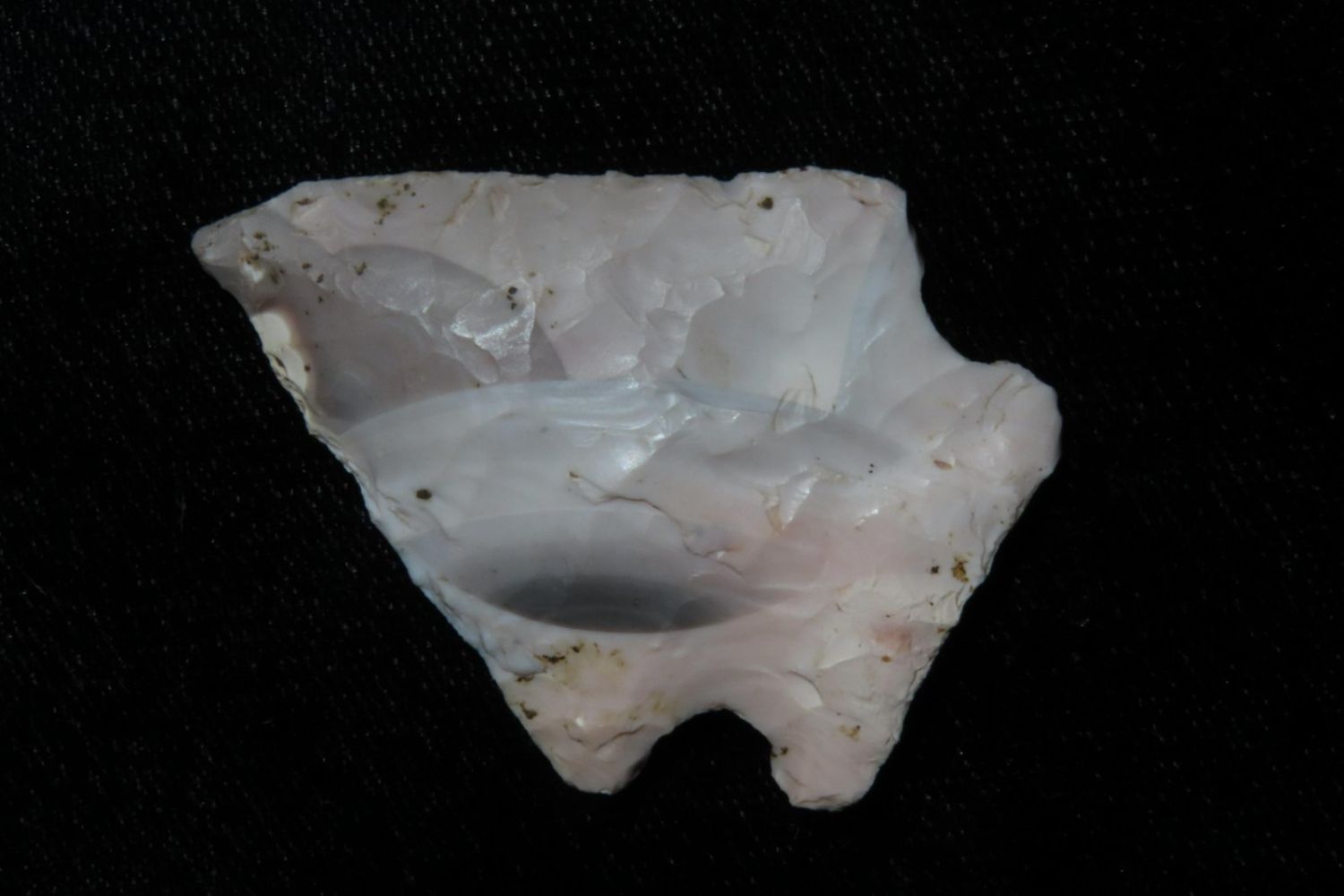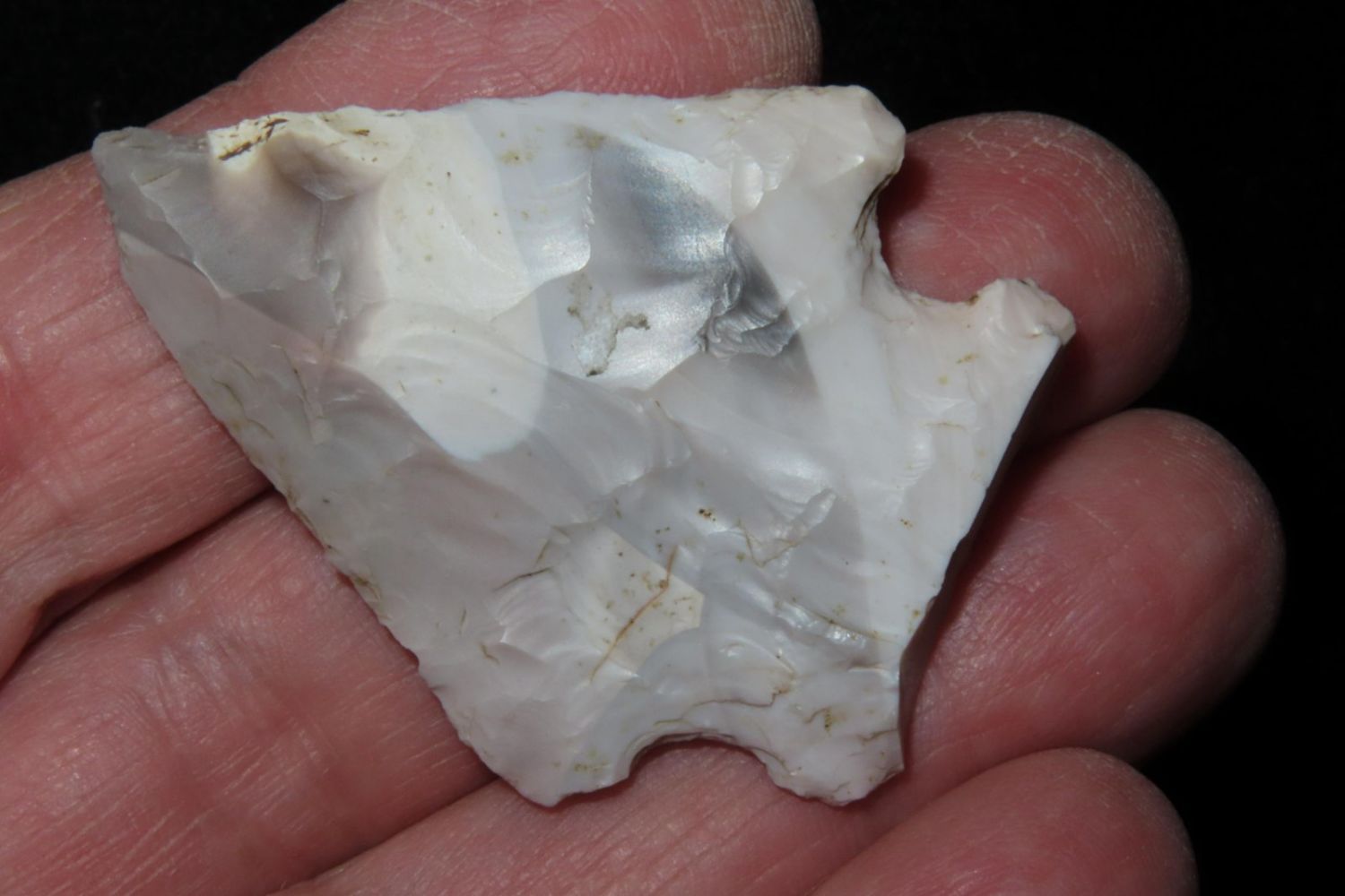 1 3/4" Salvage Side Notch. From the James and Joe George Collection. Joe George was an avid collector and finder of Native American artifacts in the greater St Louis Missouri area. Joe collected his entire life. Upon his passing he turned his collection over to his son James. James was also a very avid collector. He enjoyed walking various waterways and attending artifact shows. James is looking forward to passing down his collection to the relic community for caretaking.