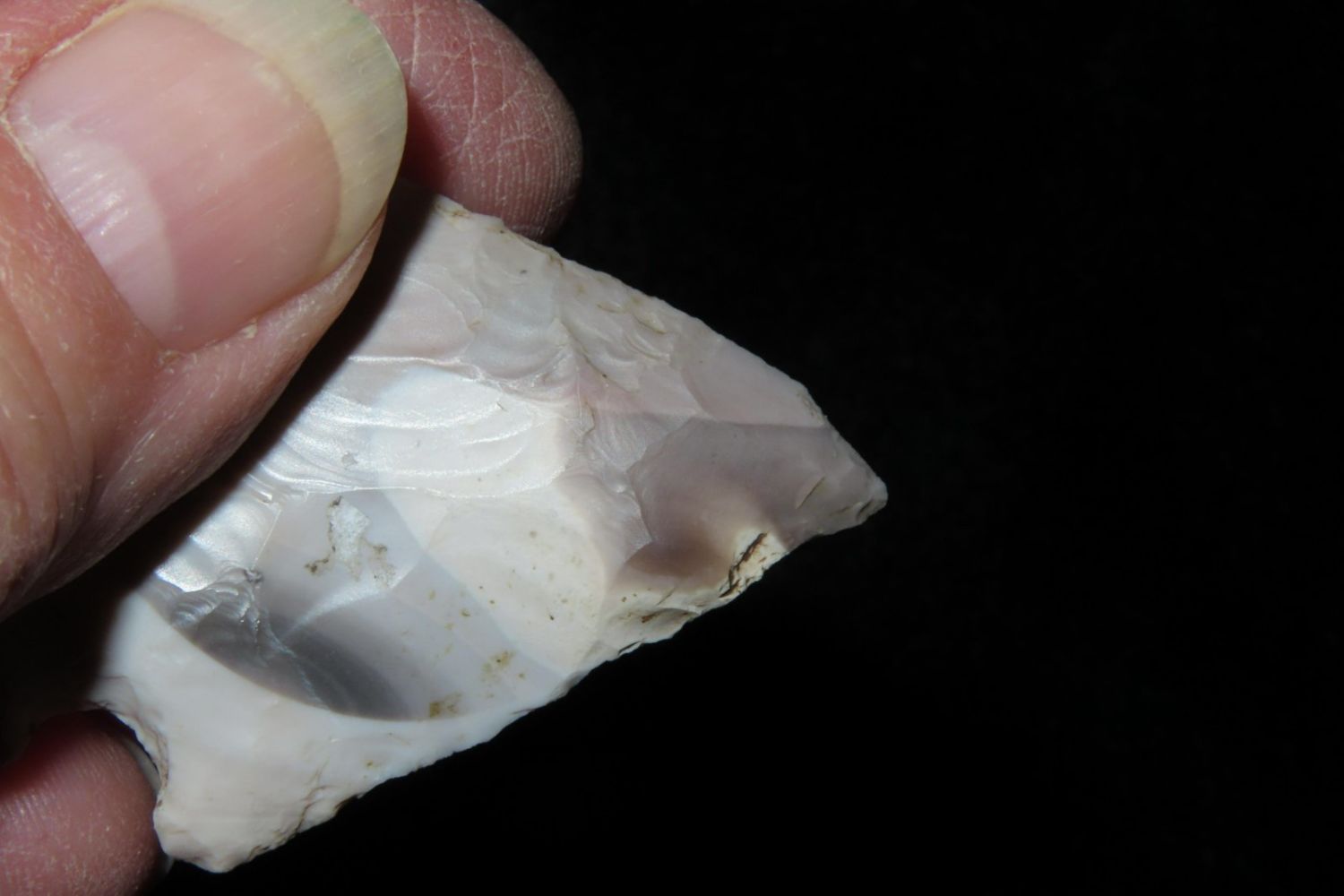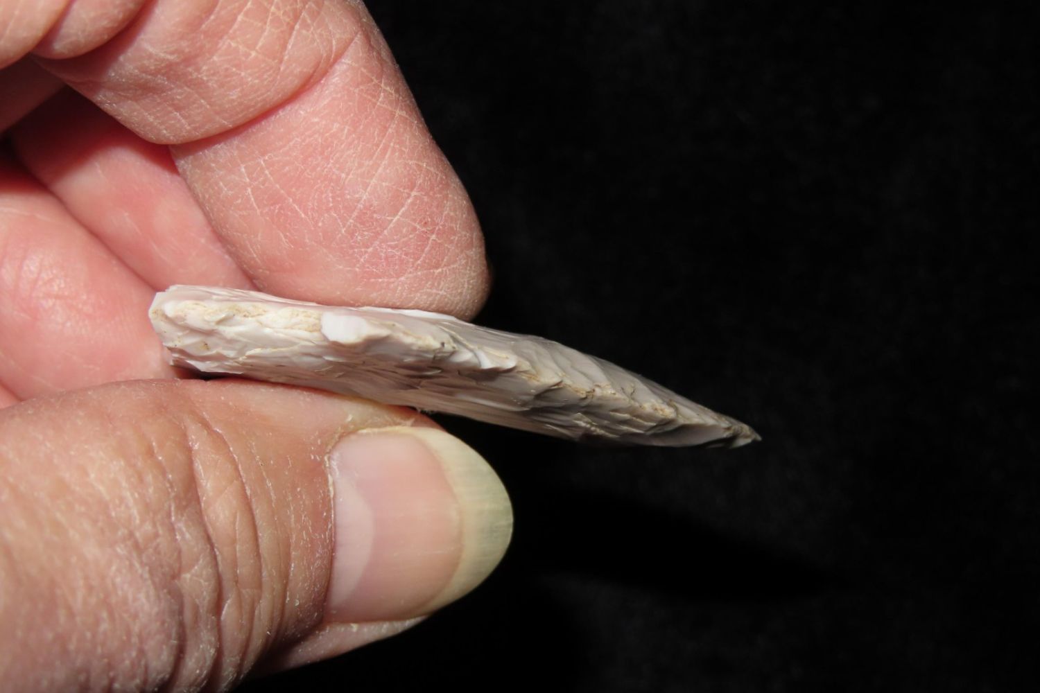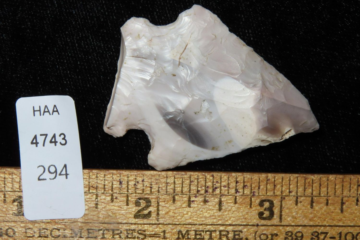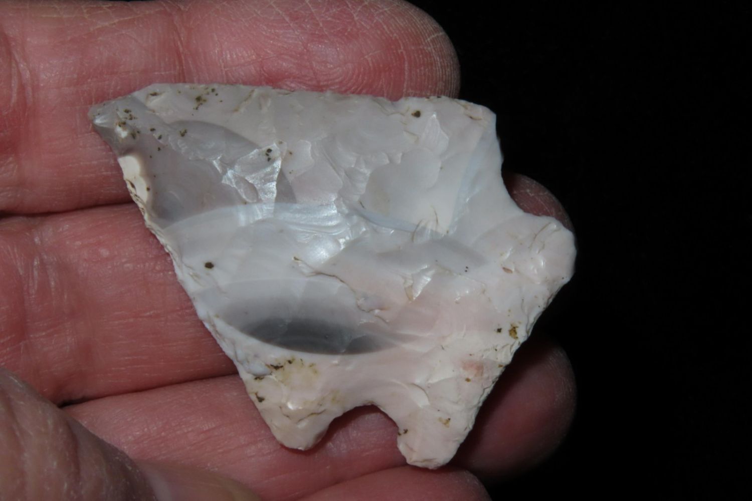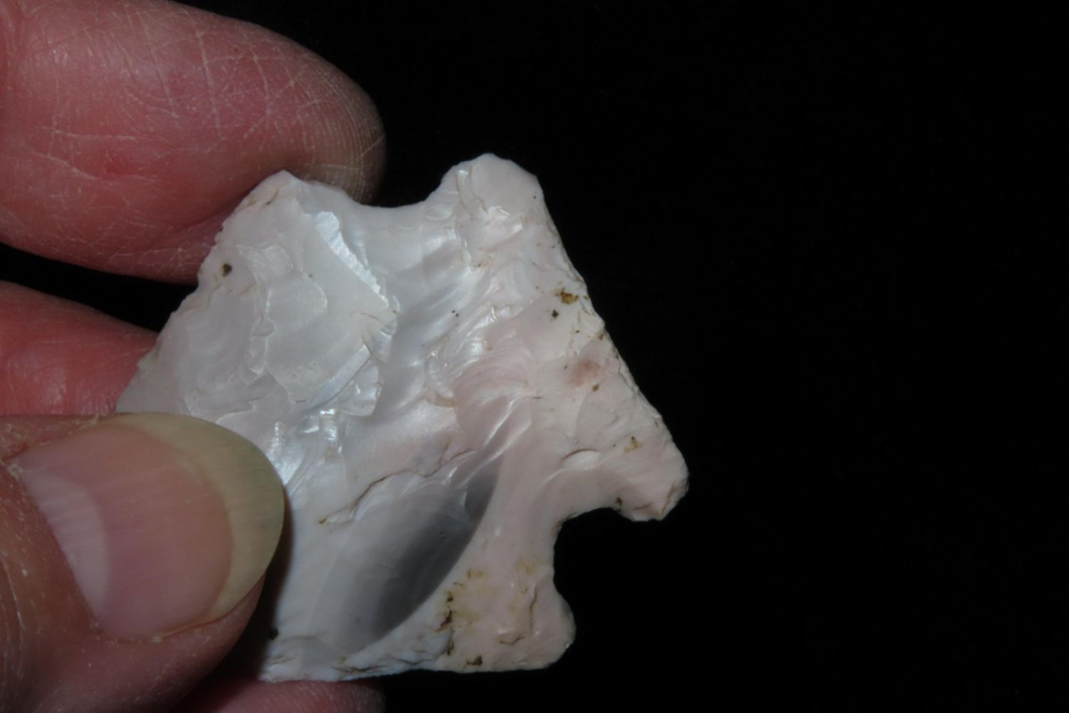 1 3/4" Salvage Side Notch. From the James and Joe George Collection. Joe George was an avid collector and finder of Native American artifacts in the greater St Louis Missouri area. Joe collected his entire life. Upon his passing he turned his collection over to his son James. James was also a very avid collector. He enjoyed walking various waterways and attending artifact shows. James is looking forward to passing down his collection to the relic community for caretaking.