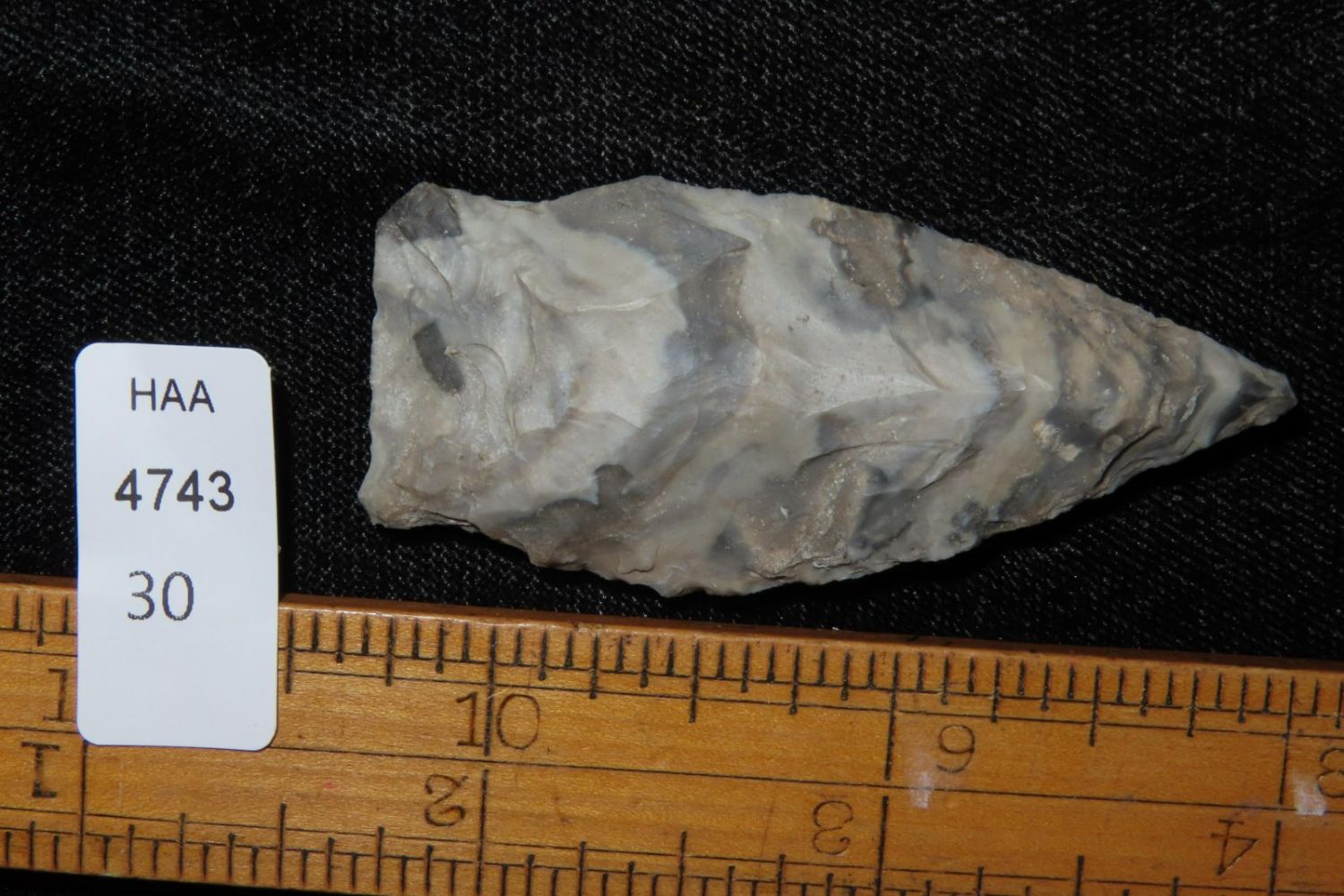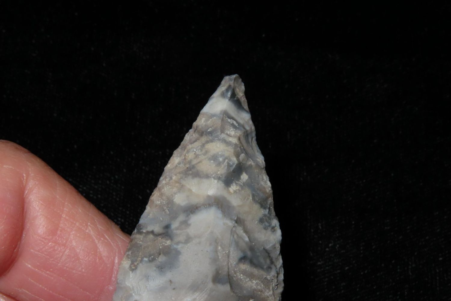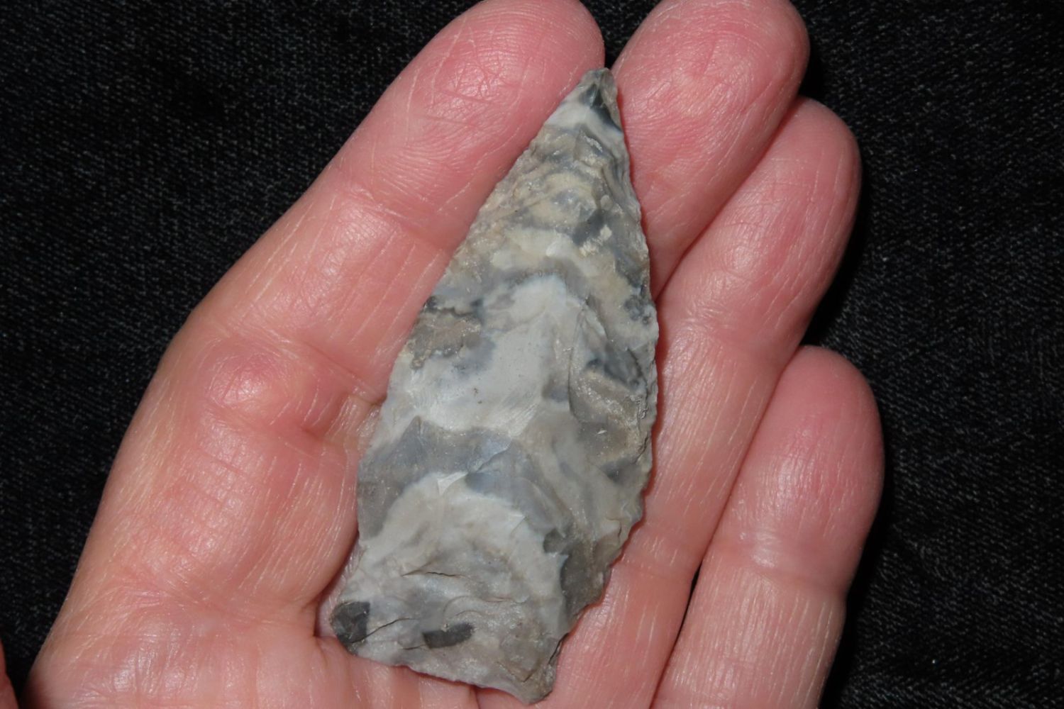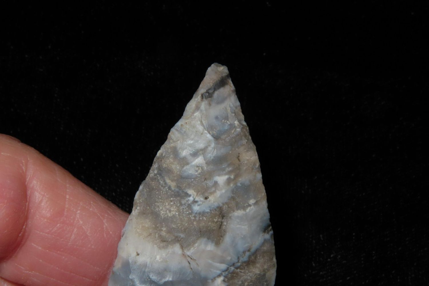 2 1/4" Rice Side Notch. From the James and Joe George Collection. Joe George was an avid collector and finder of Native American artifacts in the greater St Louis Missouri area. Joe collected his entire life. Upon his passing he turned his collection over to his son James. James was also a very avid collector. He enjoyed walking various waterways and attending artifact shows. James is looking forward to passing down his collection to the relic community for caretaking.
