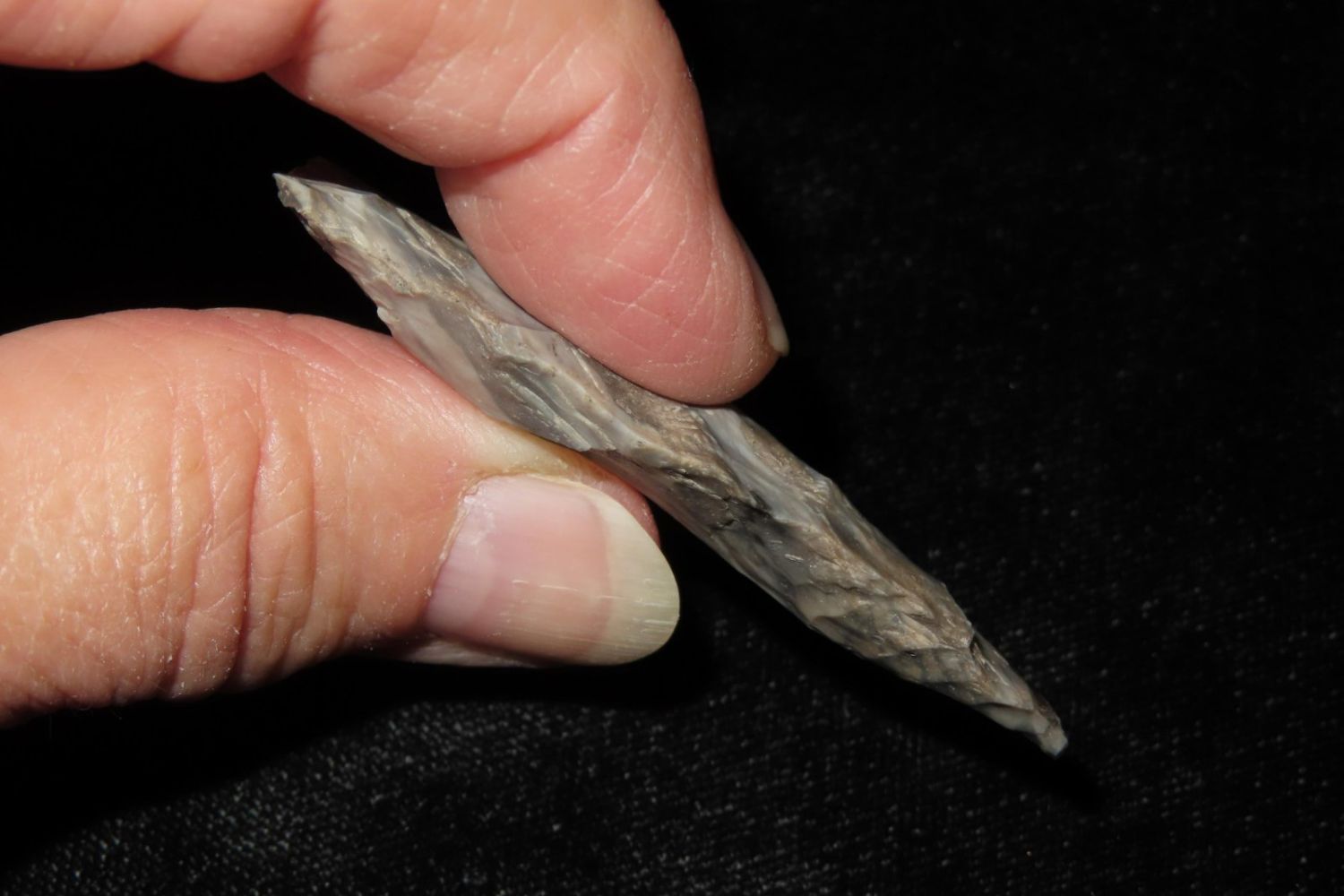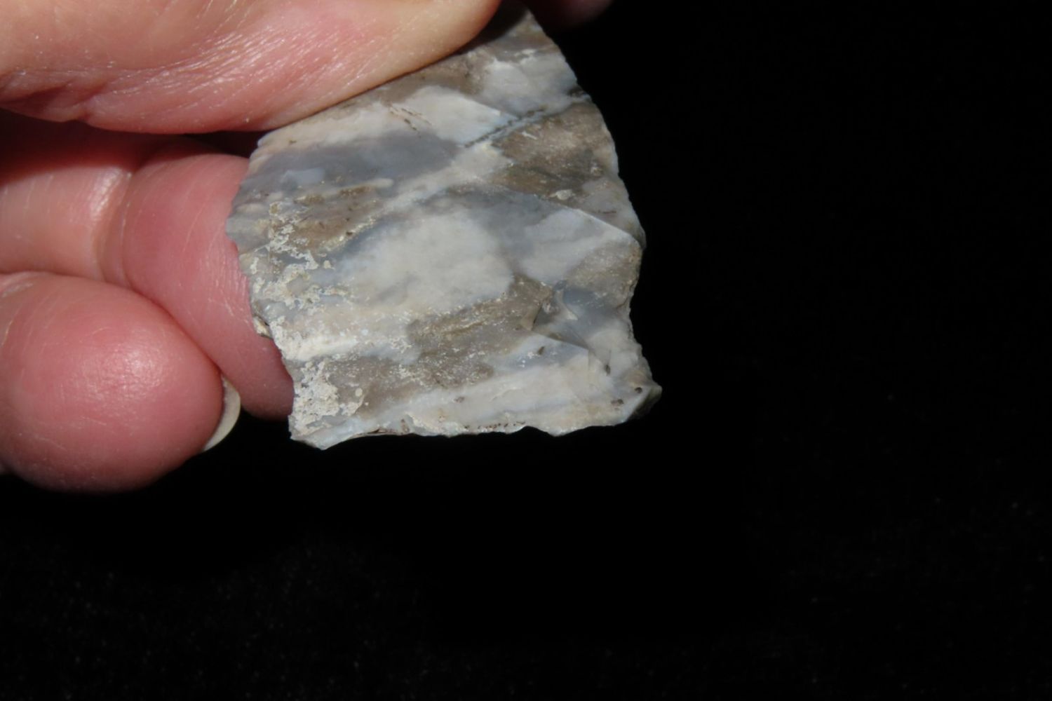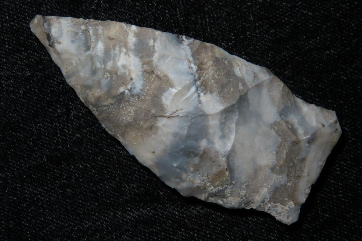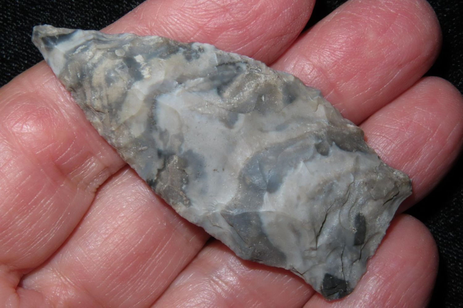 2 1/4" Rice Side Notch. From the James and Joe George Collection. Joe George was an avid collector and finder of Native American artifacts in the greater St Louis Missouri area. Joe collected his entire life. Upon his passing he turned his collection over to his son James. James was also a very avid collector. He enjoyed walking various waterways and attending artifact shows. James is looking forward to passing down his collection to the relic community for caretaking.