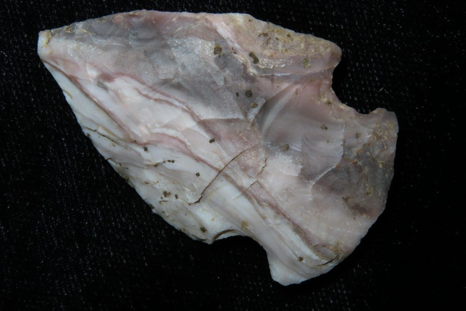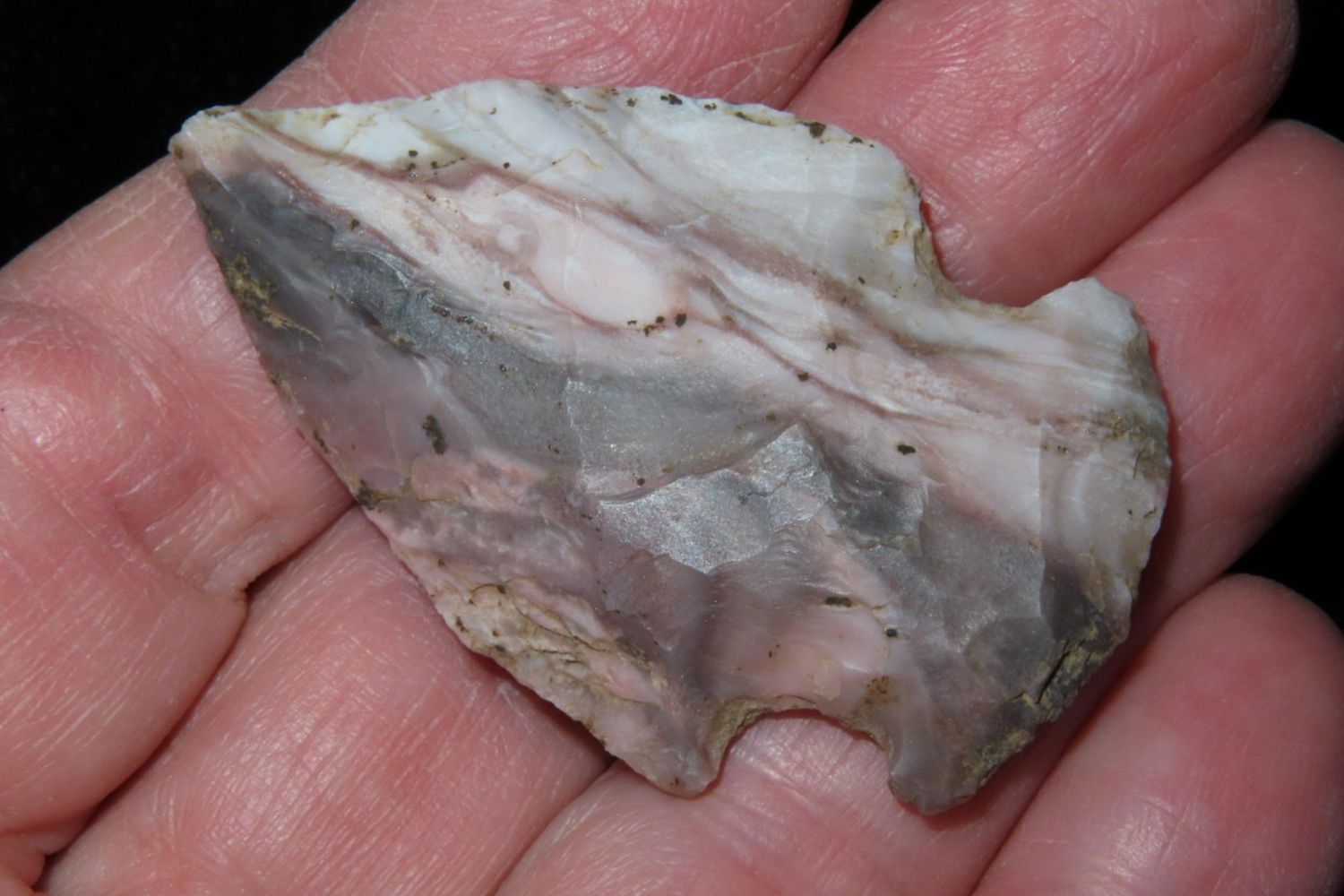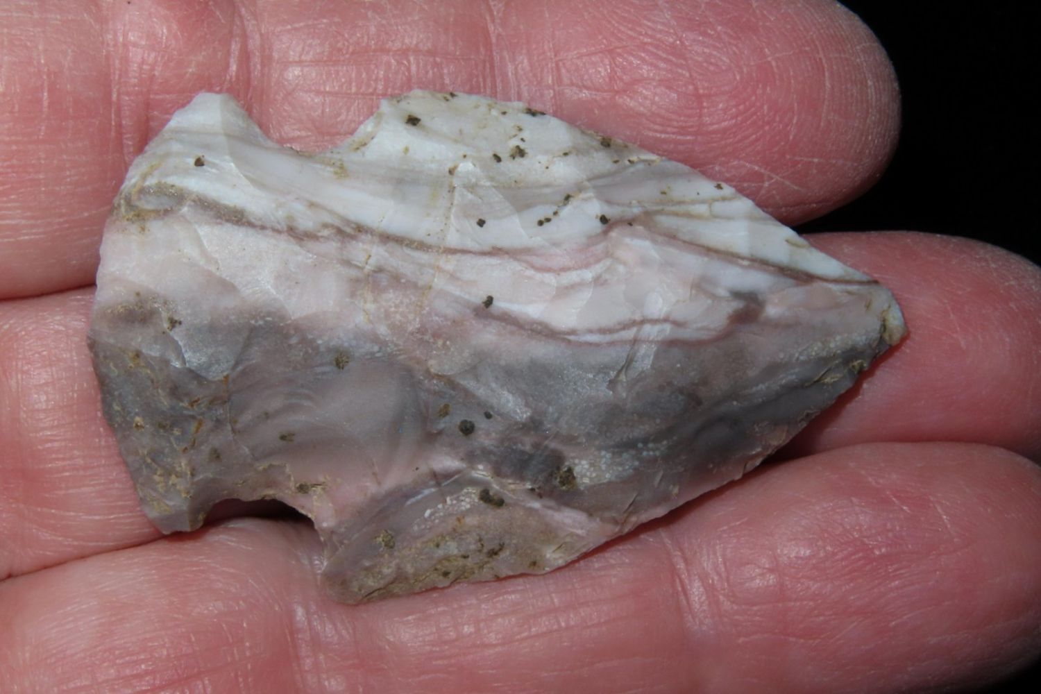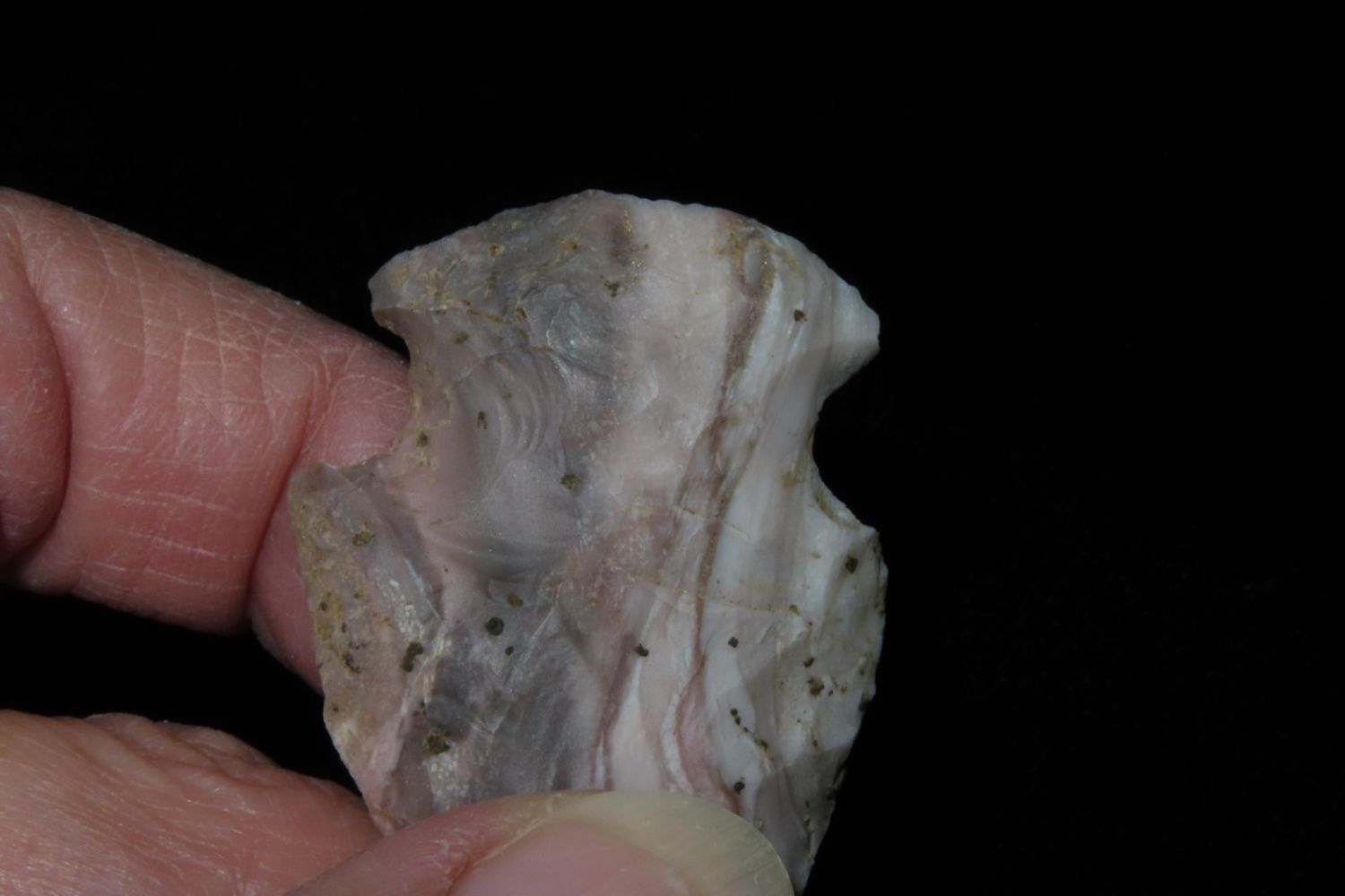 1 3/4" Colorful Gibson. From the James and Joe George Collection. Joe George was an avid collector and finder of Native American artifacts in the greater St Louis Missouri area. Joe collected his entire life. Upon his passing he turned his collection over to his son James. James was also a very avid collector. He enjoyed walking various waterways and attending artifact shows. James is looking forward to passing down his collection to the relic community for caretaking.