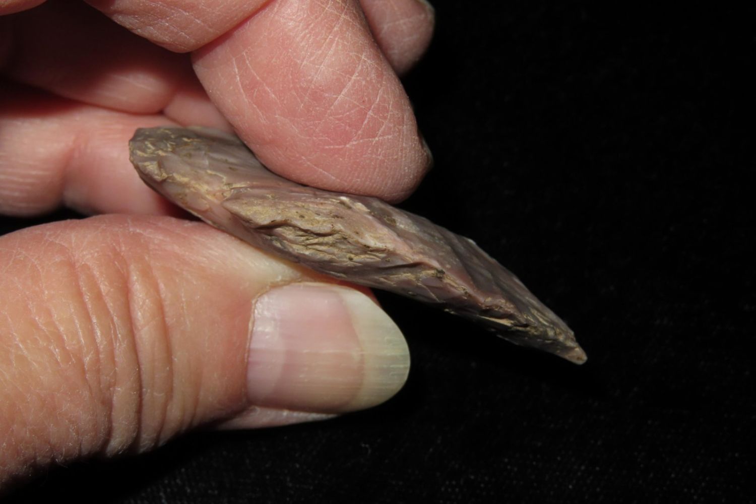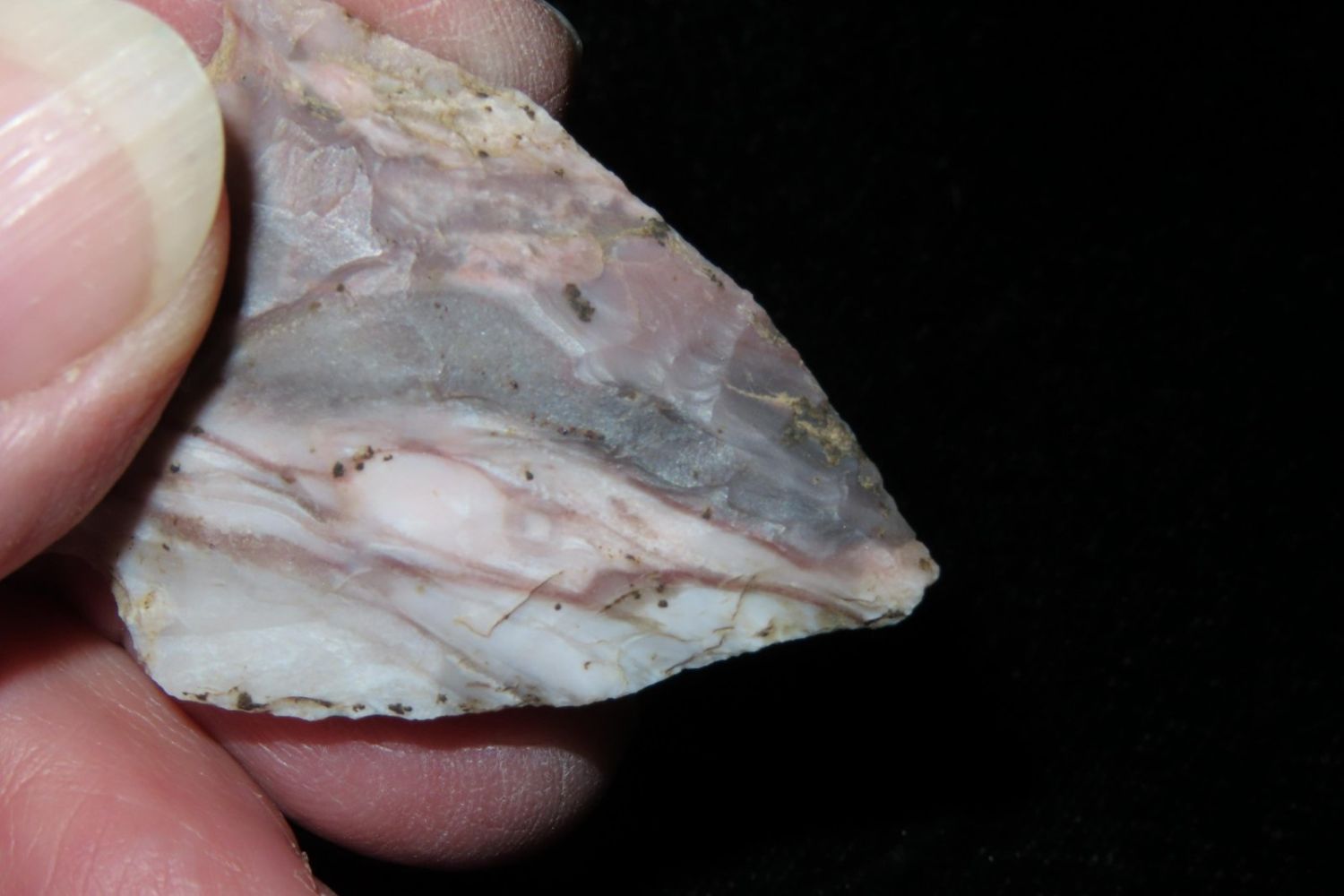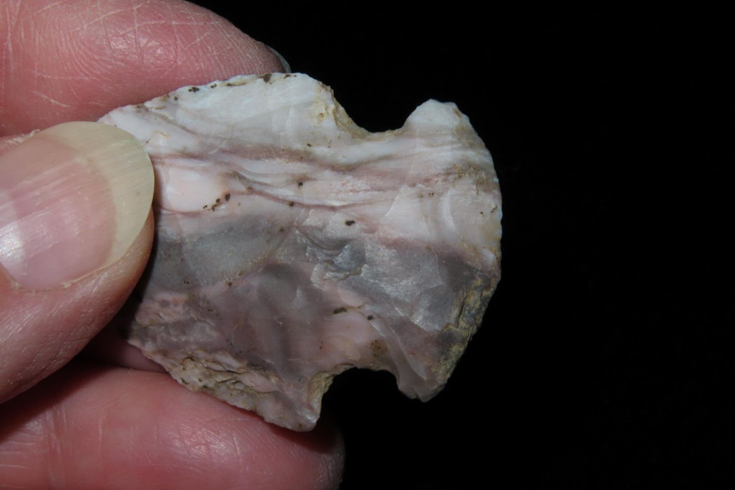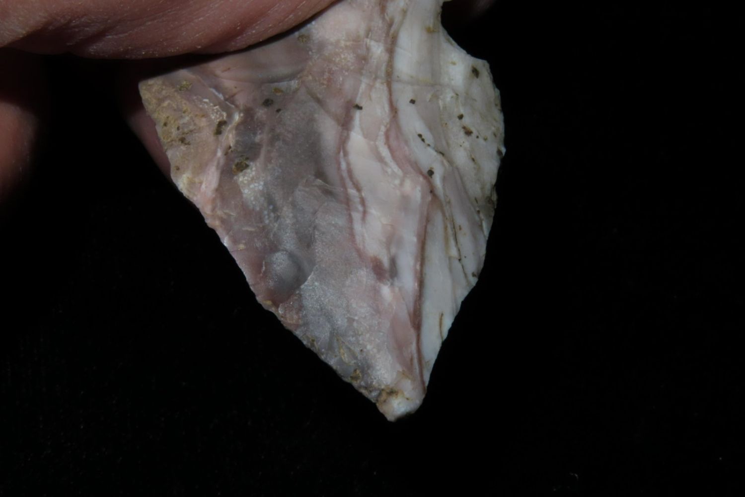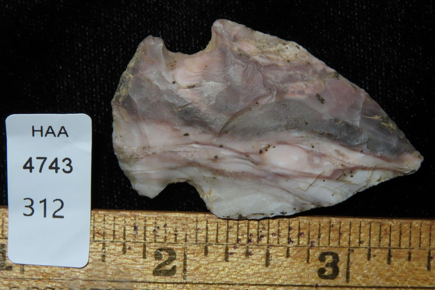 1 3/4" Colorful Gibson. From the James and Joe George Collection. Joe George was an avid collector and finder of Native American artifacts in the greater St Louis Missouri area. Joe collected his entire life. Upon his passing he turned his collection over to his son James. James was also a very avid collector. He enjoyed walking various waterways and attending artifact shows. James is looking forward to passing down his collection to the relic community for caretaking.
