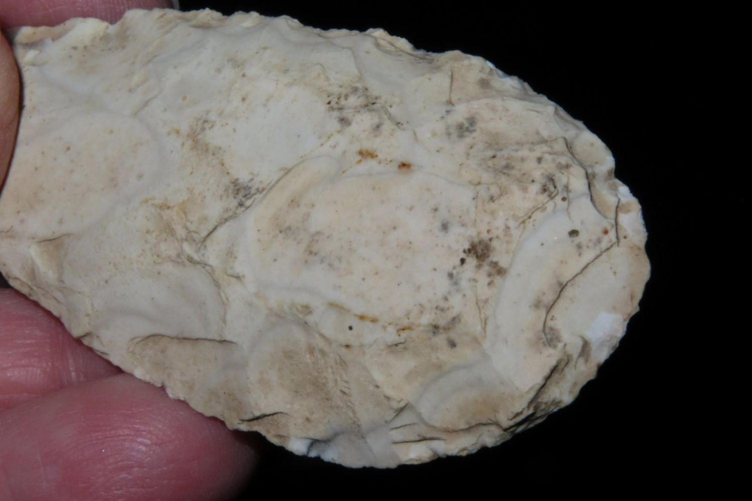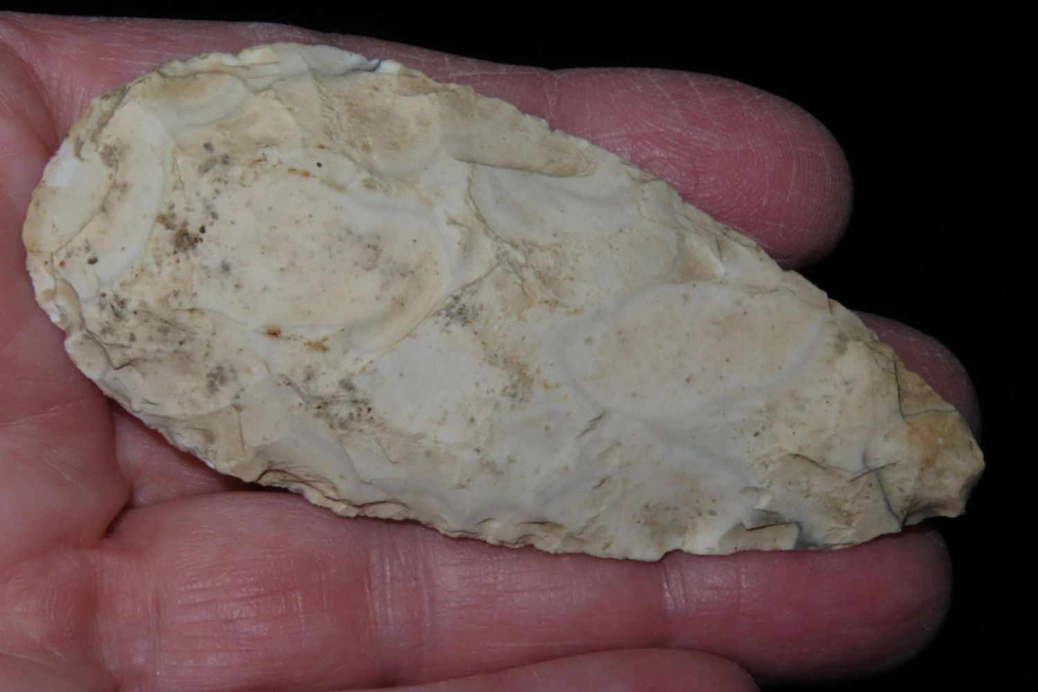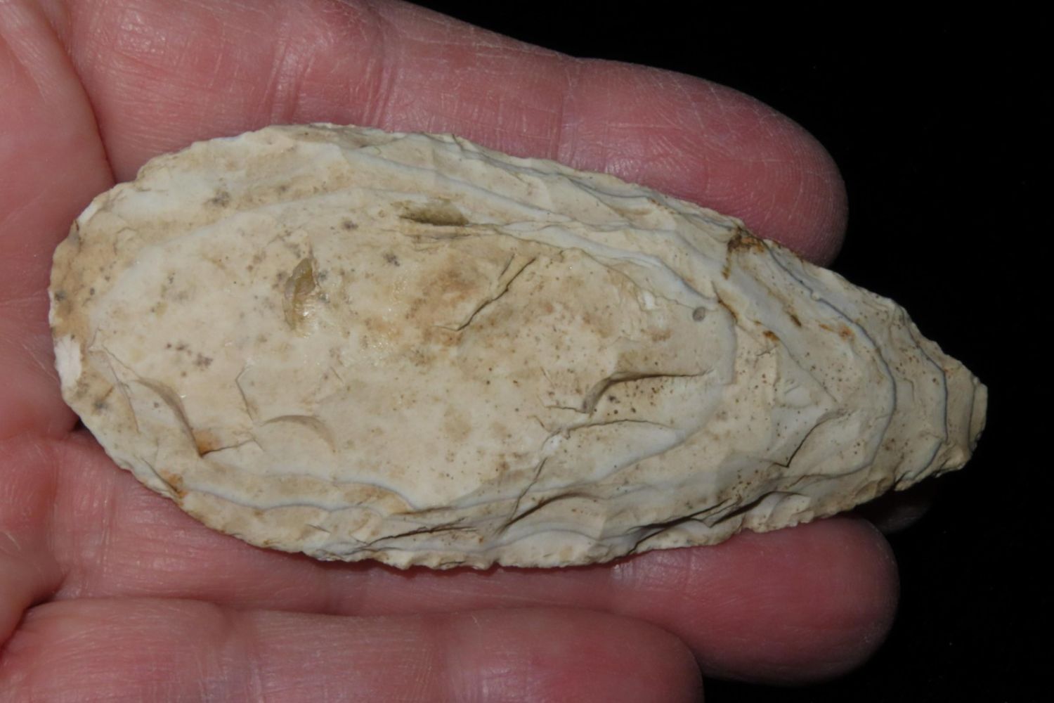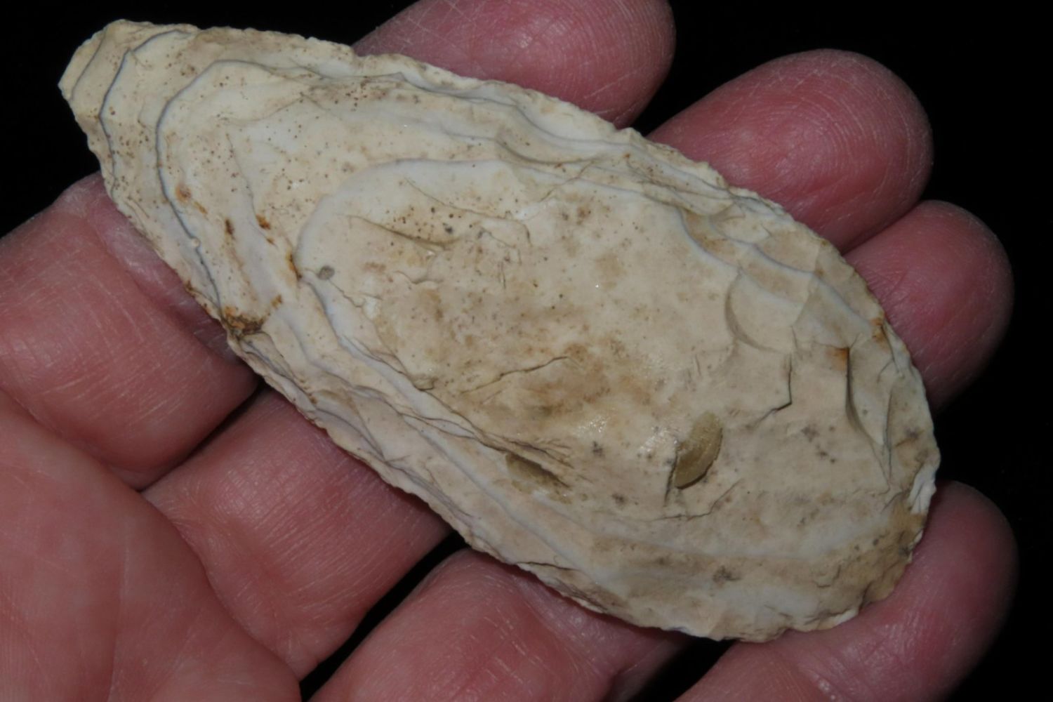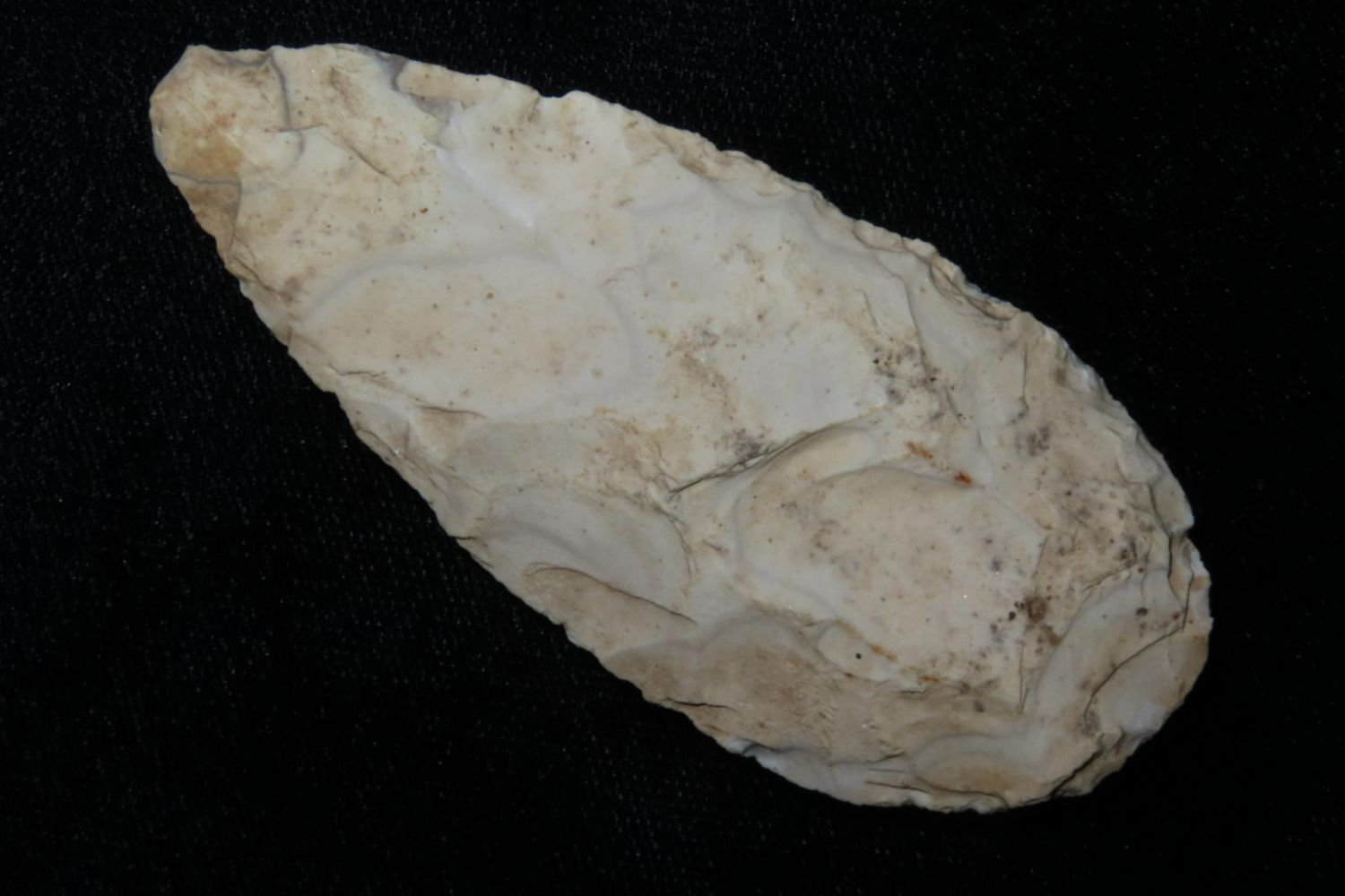 3" Ovoid Blade. From the James and Joe George Collection. Joe George was an avid collector and finder of Native American artifacts in the greater St Louis Missouri area. Joe collected his entire life. Upon his passing he turned his collection over to his son James. James was also a very avid collector. He enjoyed walking various waterways and attending artifact shows. James is looking forward to passing down his collection to the relic community for caretaking.