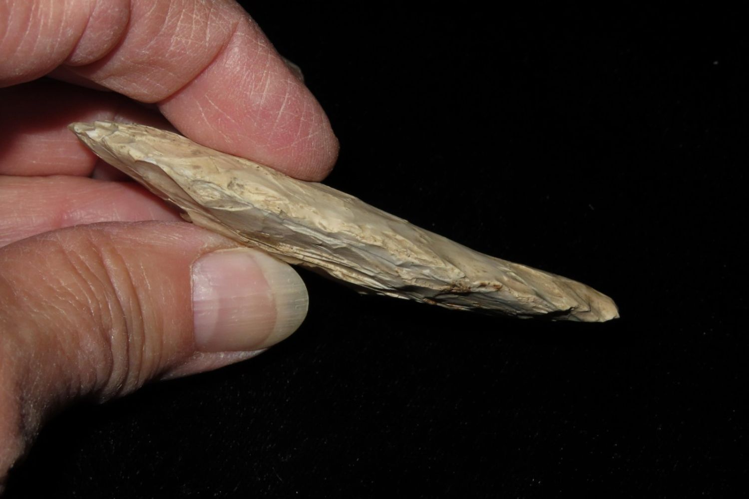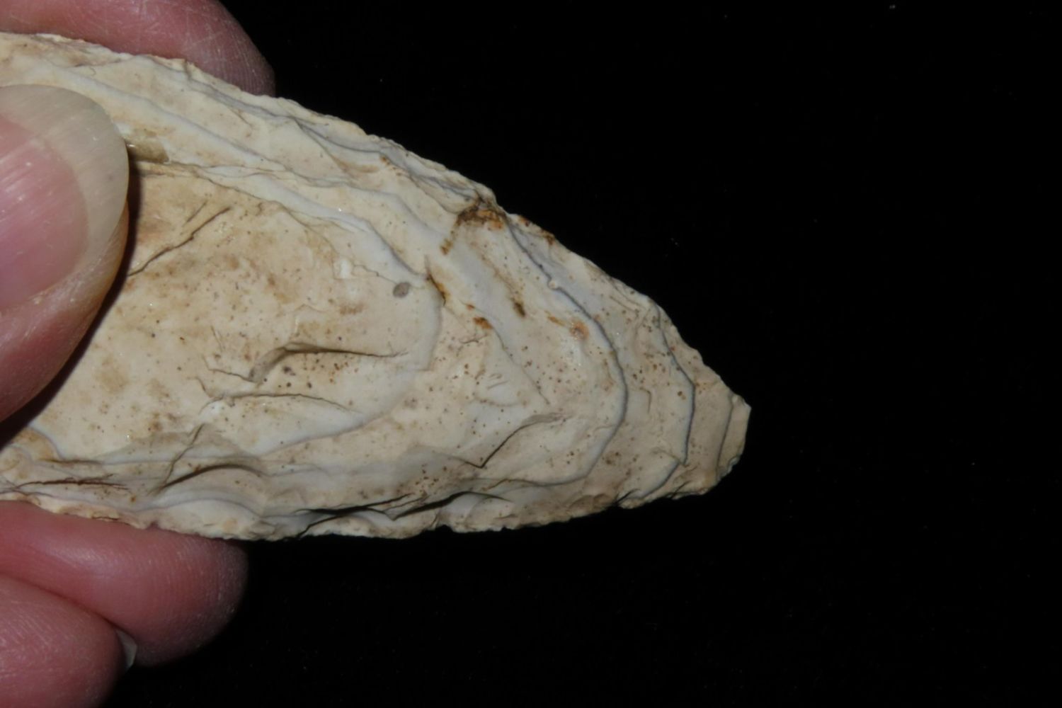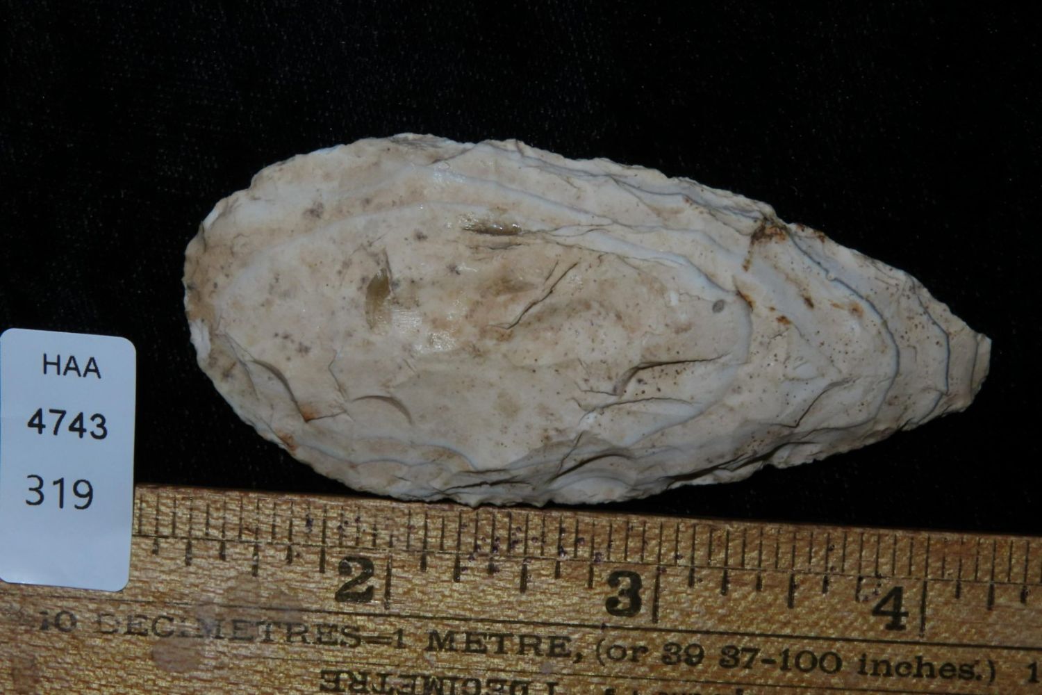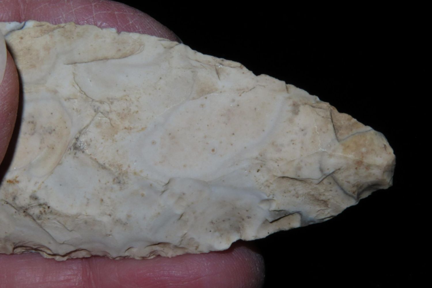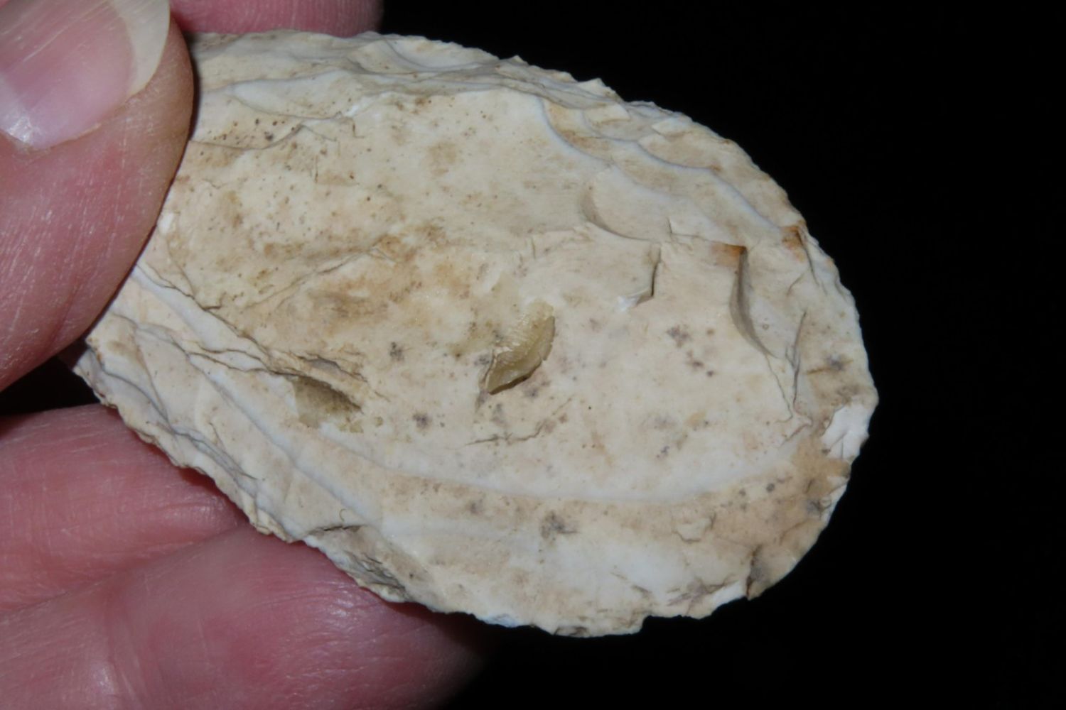 3" Ovoid Blade. From the James and Joe George Collection. Joe George was an avid collector and finder of Native American artifacts in the greater St Louis Missouri area. Joe collected his entire life. Upon his passing he turned his collection over to his son James. James was also a very avid collector. He enjoyed walking various waterways and attending artifact shows. James is looking forward to passing down his collection to the relic community for caretaking.