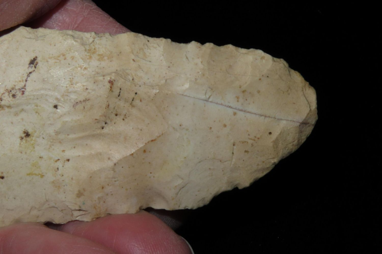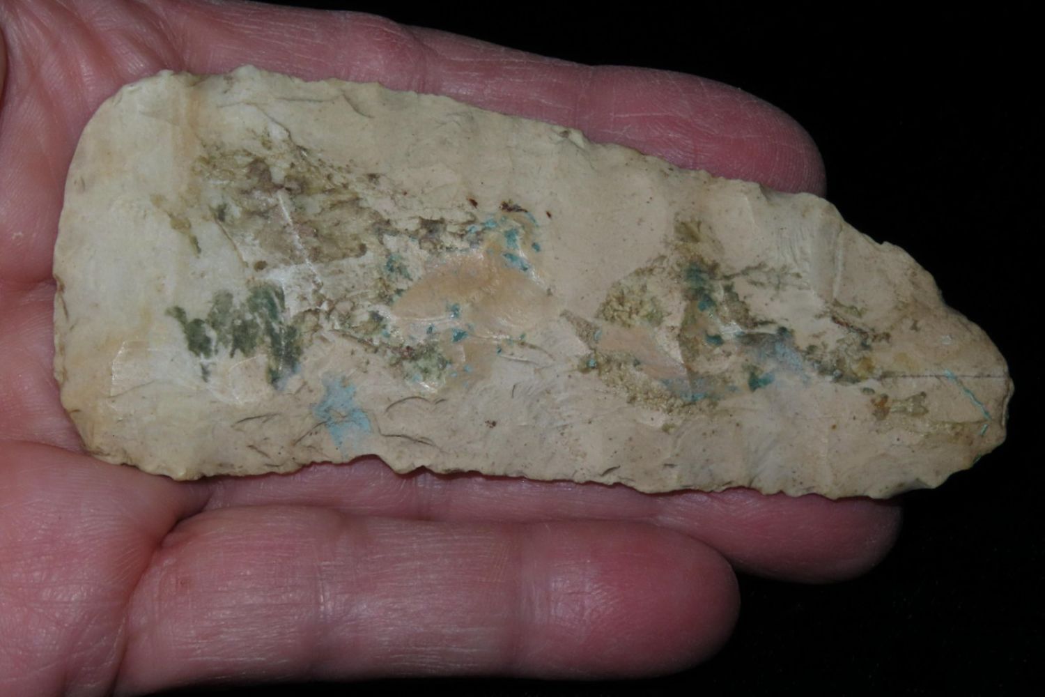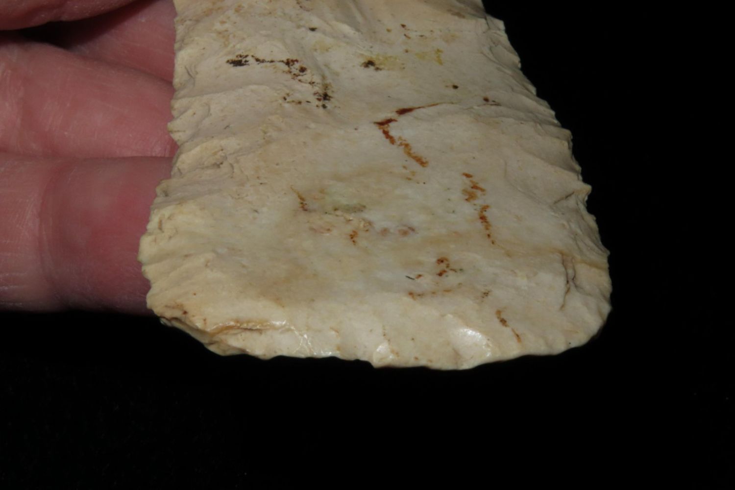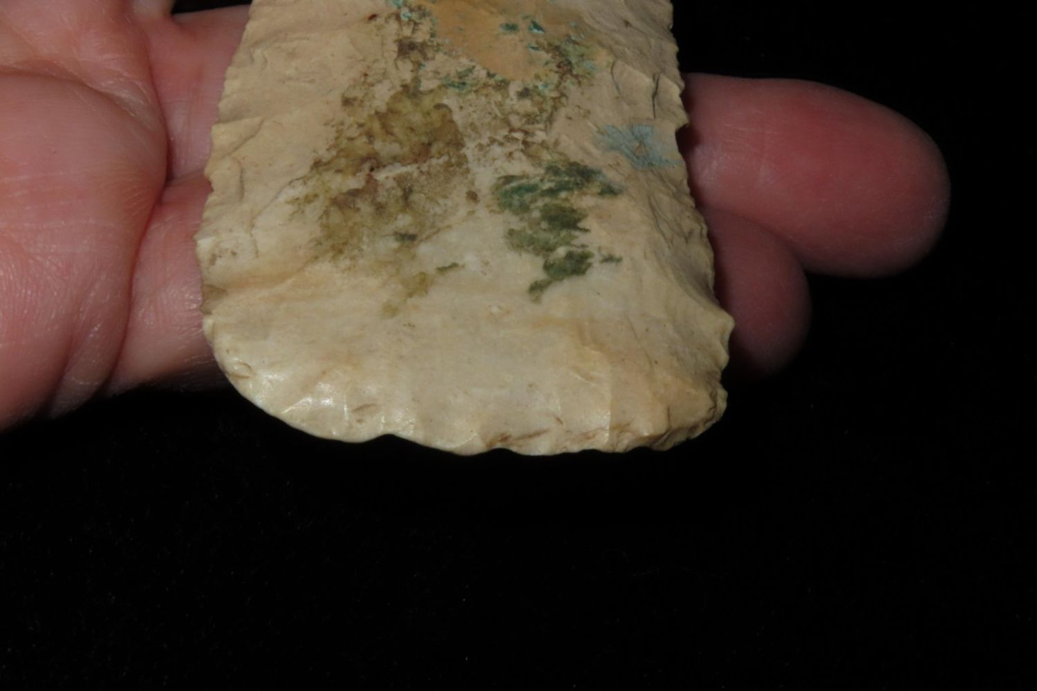 3 5/8" Early Archaic Knife. From the James and Joe George Collection. Joe George was an avid collector and finder of Native American artifacts in the greater St Louis Missouri area. Joe collected his entire life. Upon his passing he turned his collection over to his son James. James was also a very avid collector. He enjoyed walking various waterways and attending artifact shows. James is looking forward to passing down his collection to the relic community for caretaking.