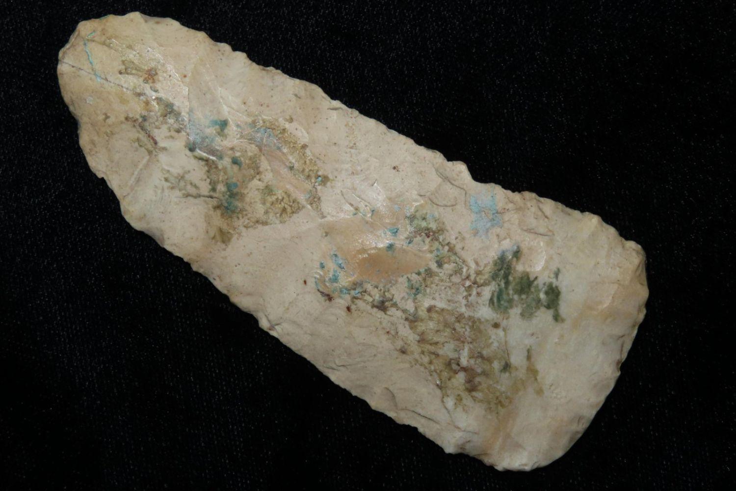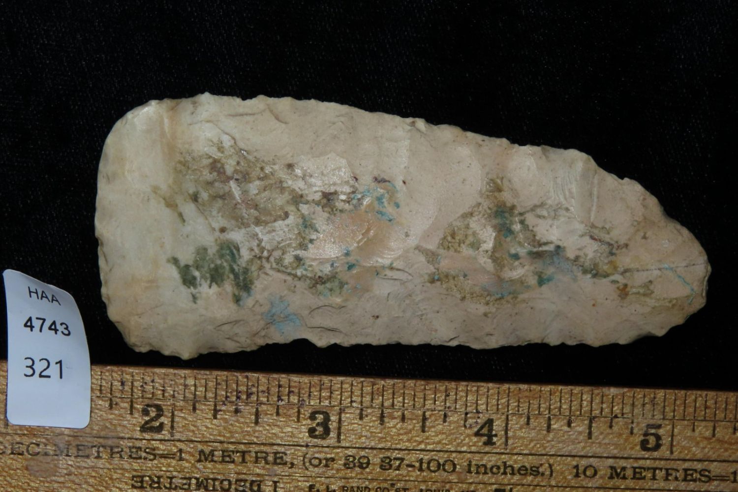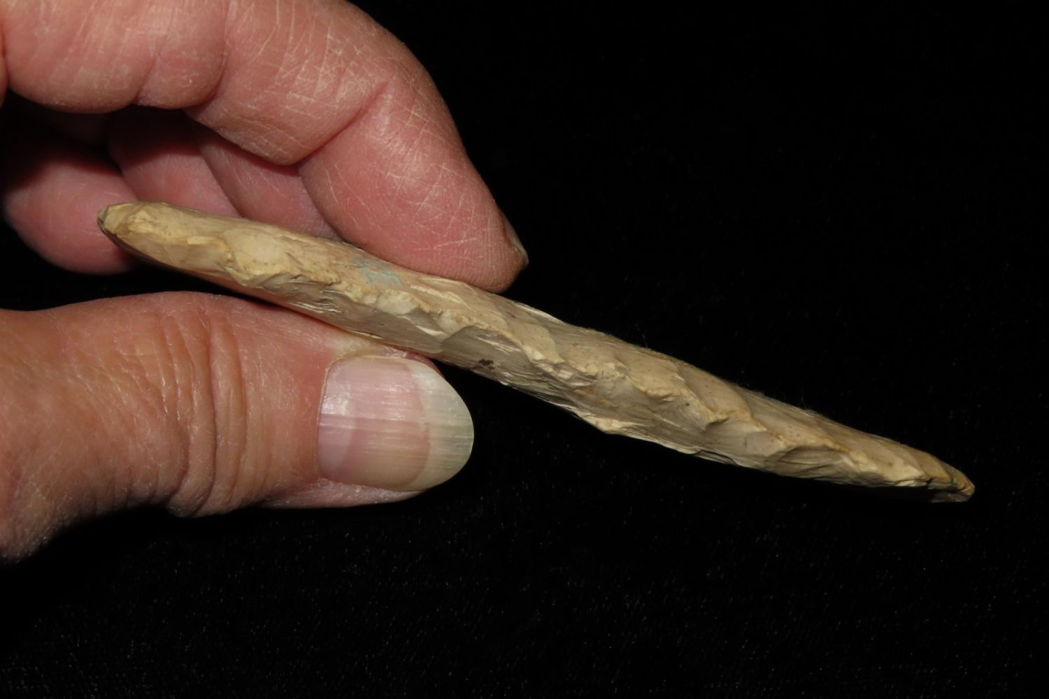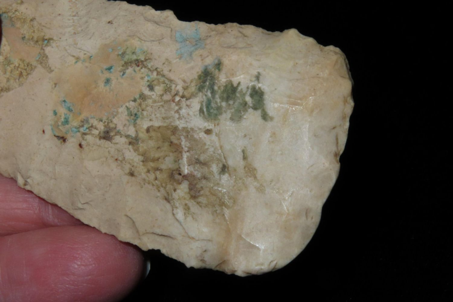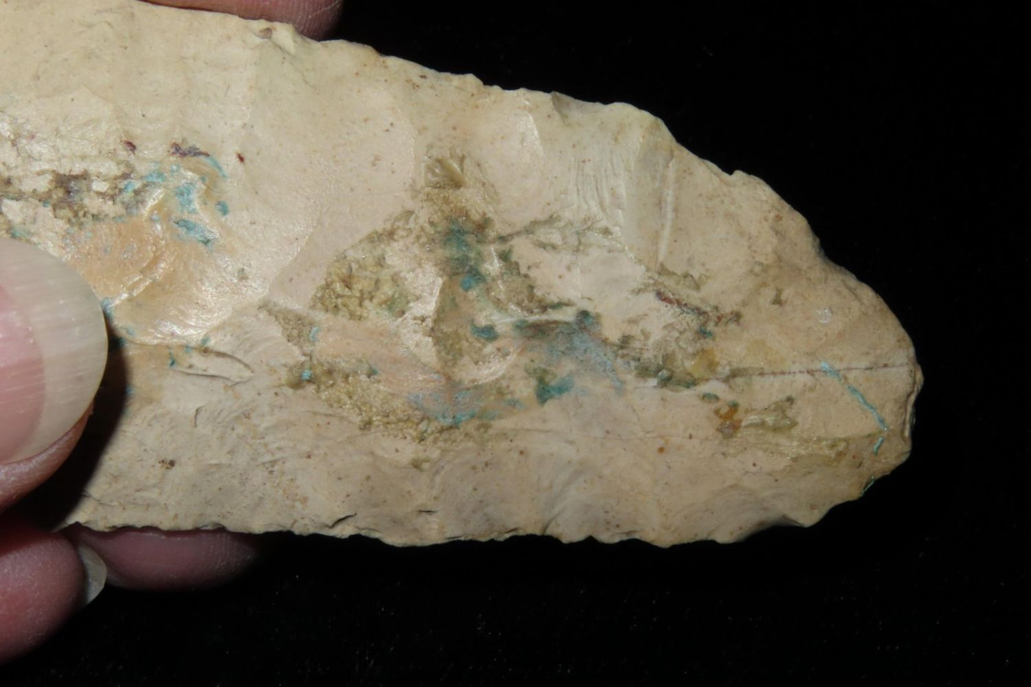3 5/8" Early Archaic Knife. From the James and Joe George Collection. Joe George was an avid collector and finder of Native American artifacts in the greater St Louis Missouri area. Joe collected his entire life. Upon his passing he turned his collection over to his son James. James was also a very avid collector. He enjoyed walking various waterways and attending artifact shows. James is looking forward to passing down his collection to the relic community for caretaking.