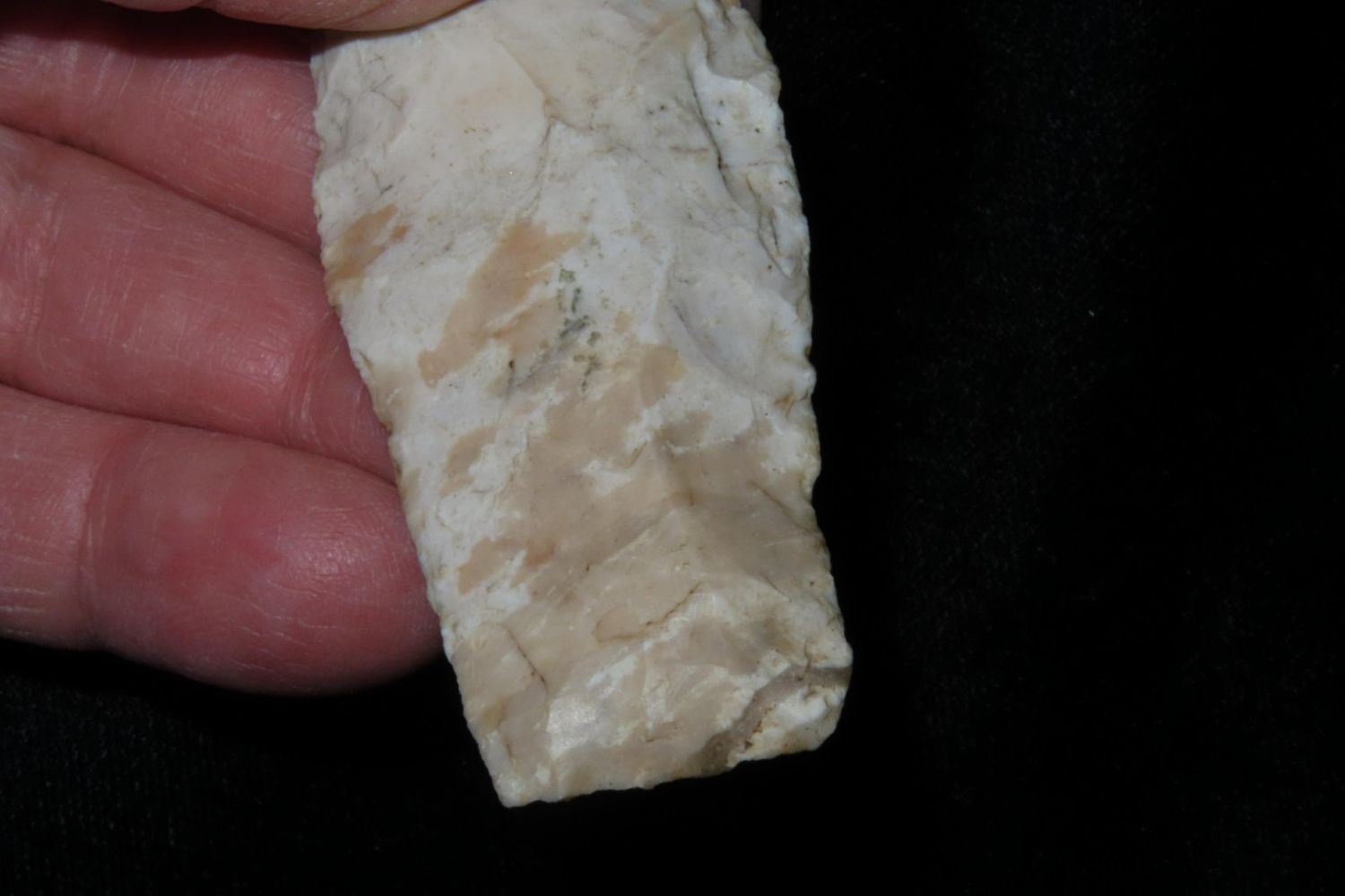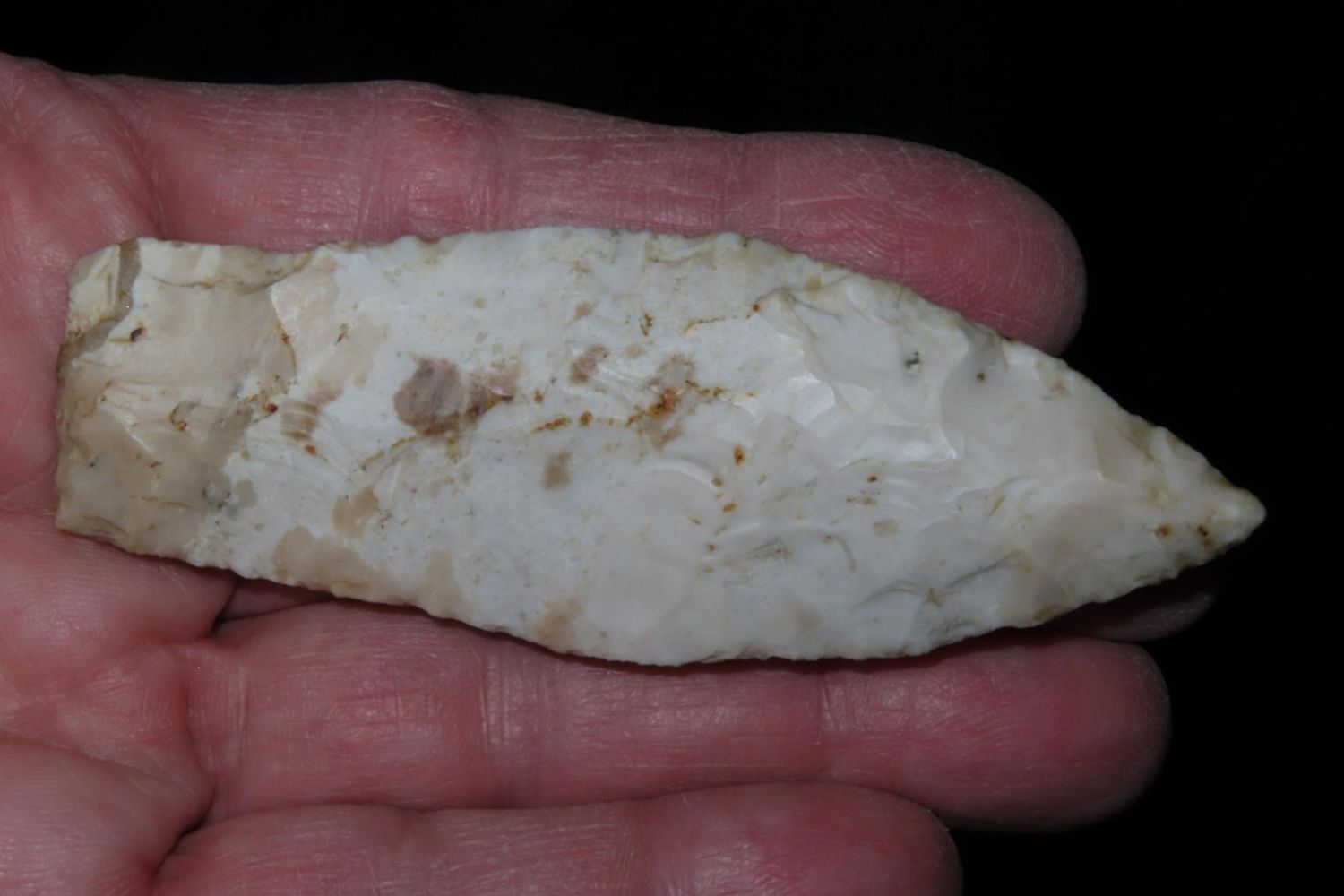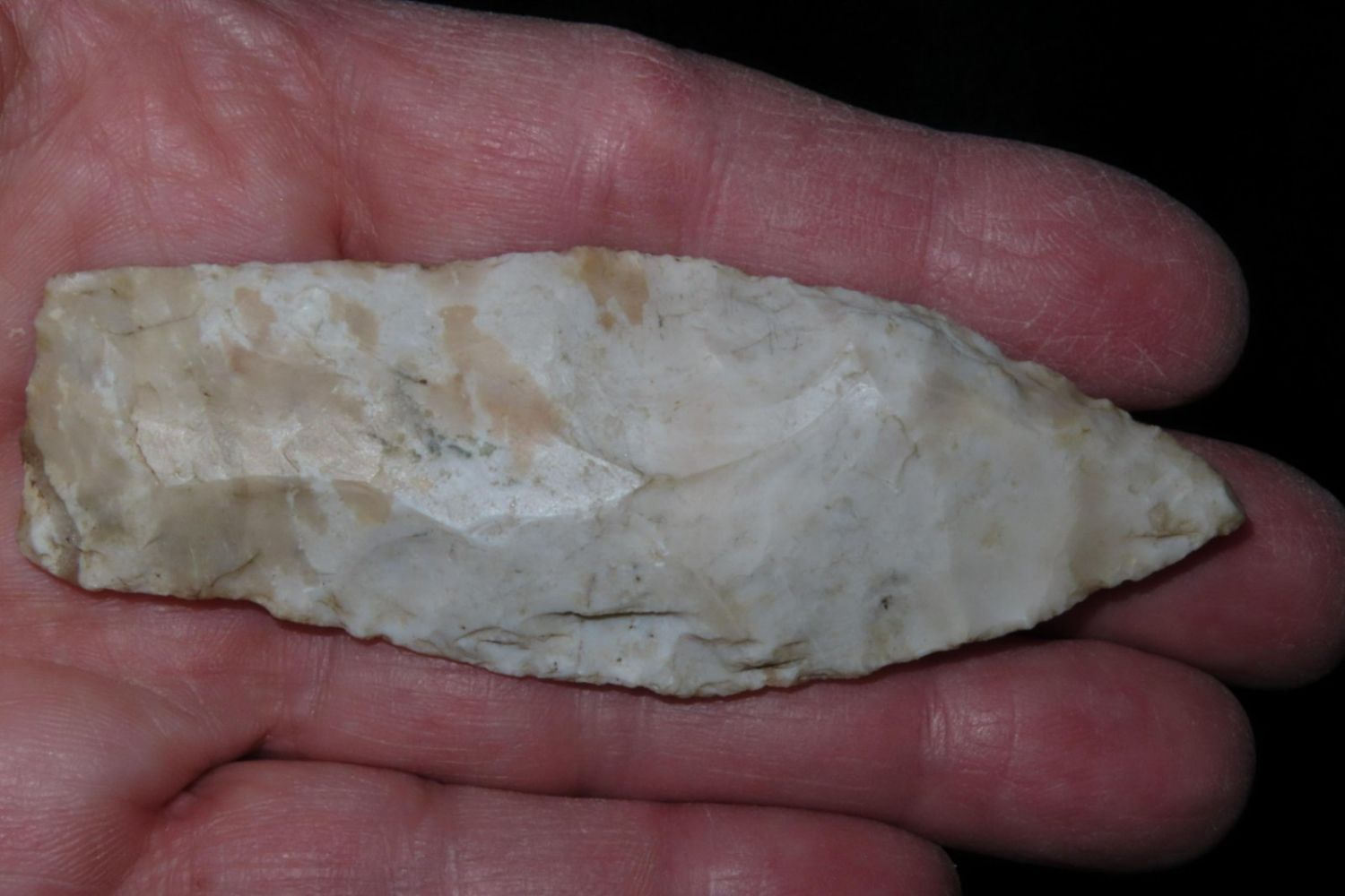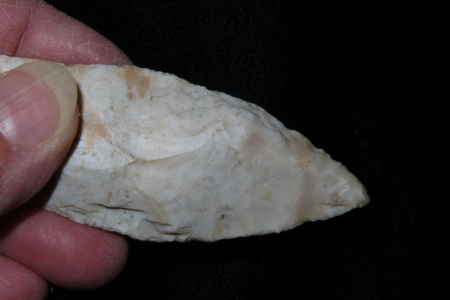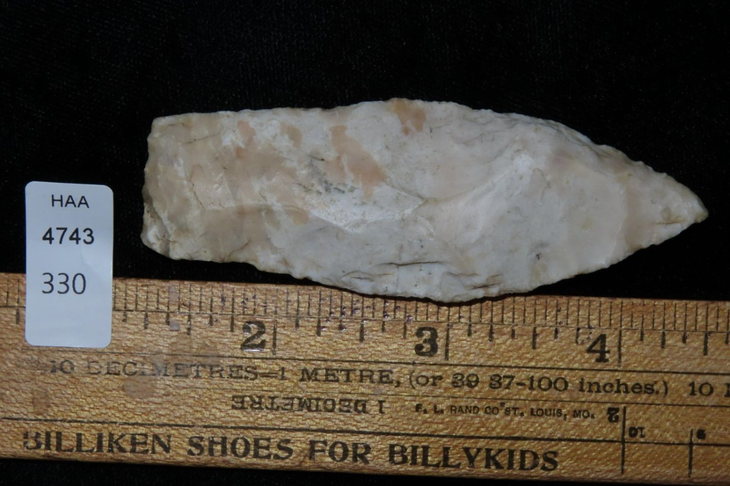 3 1/4" Sedalia. From the James and Joe George Collection. Joe George was an avid collector and finder of Native American artifacts in the greater St Louis Missouri area. Joe collected his entire life. Upon his passing he turned his collection over to his son James. James was also a very avid collector. He enjoyed walking various waterways and attending artifact shows. James is looking forward to passing down his collection to the relic community for caretaking.
