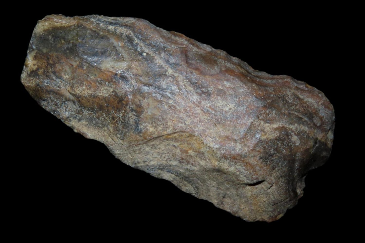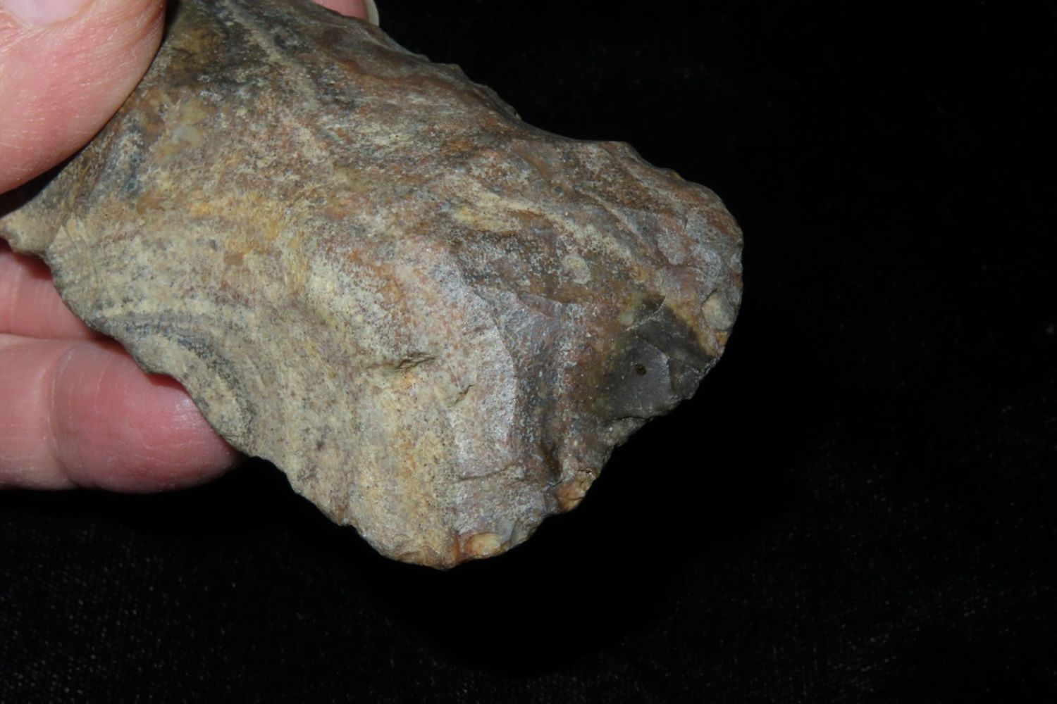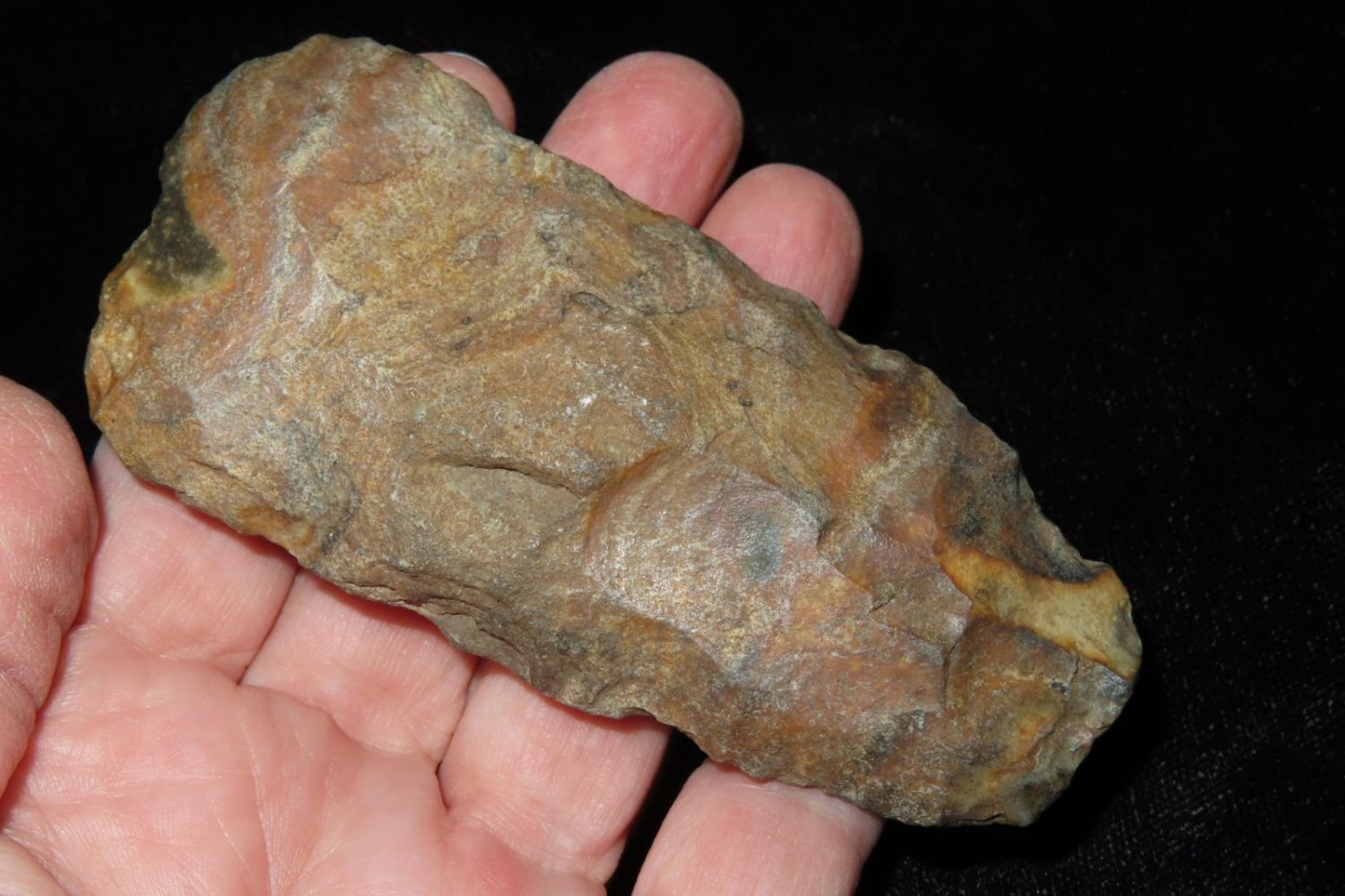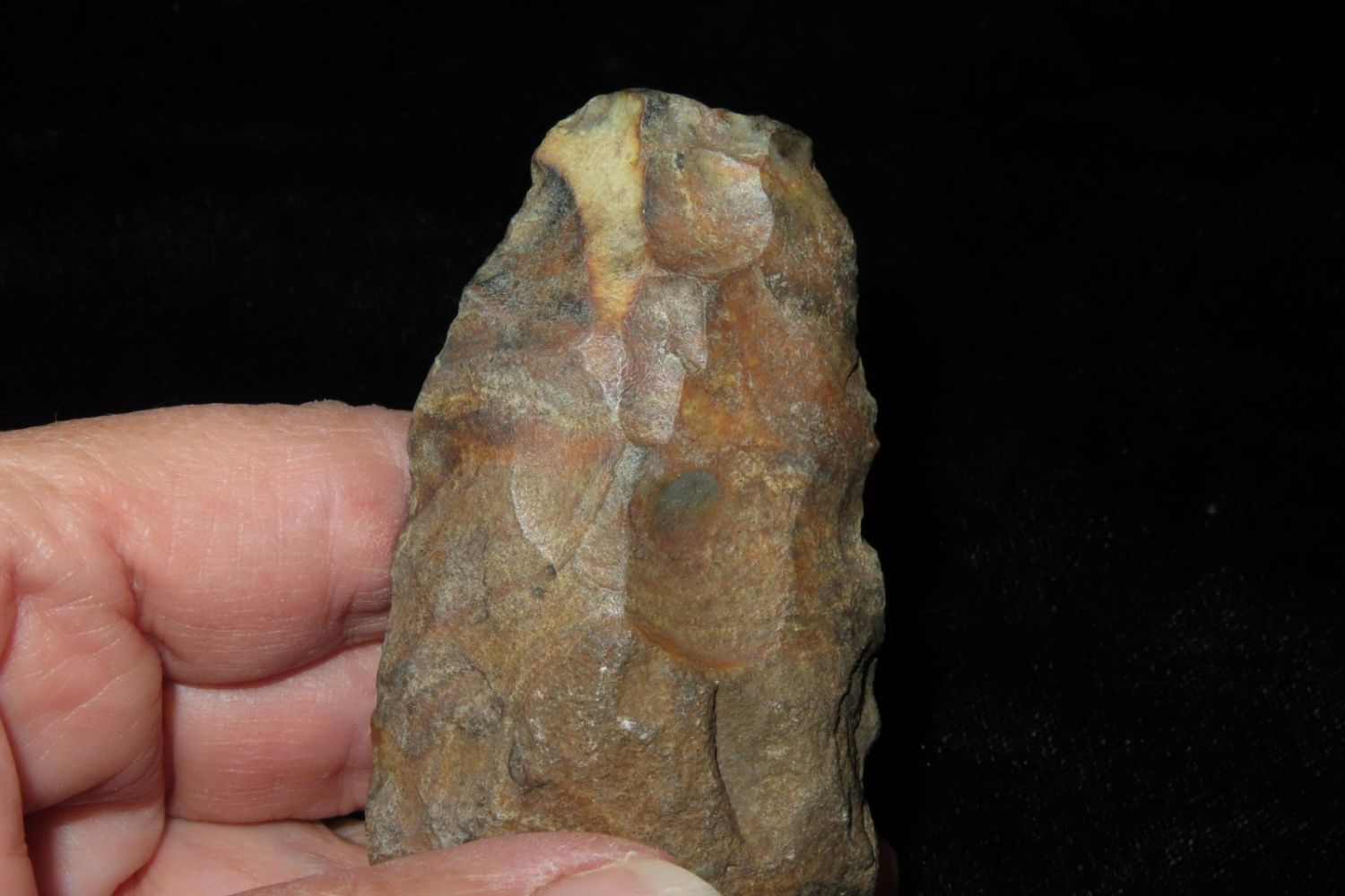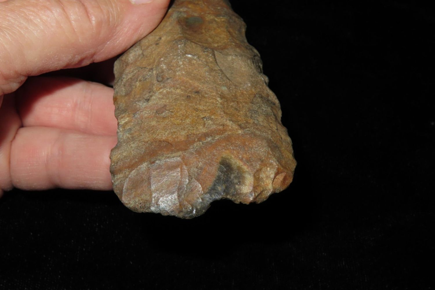 3.3/4" Colorful Adze, Nice From the James and Joe George Collection. Joe George was an avid collector and finder of Native American artifacts in the greater St Louis Missouri area. Joe collected his entire life. Upon his passing he turned his collection over to his son James. James was also a very avid collector. He enjoyed walking various waterways and attending artifact shows. James is looking forward to passing down his collection to the relic community for caretaking.